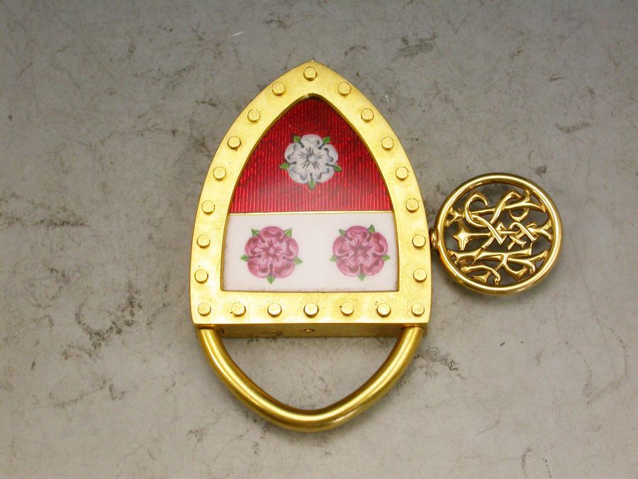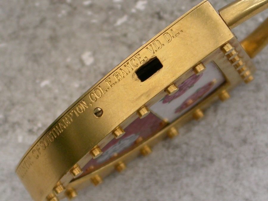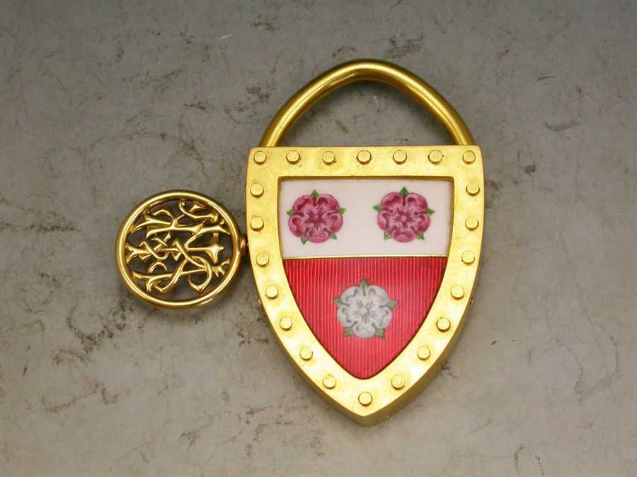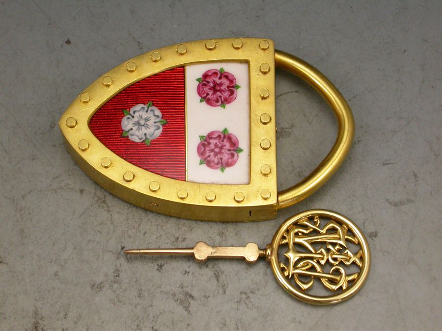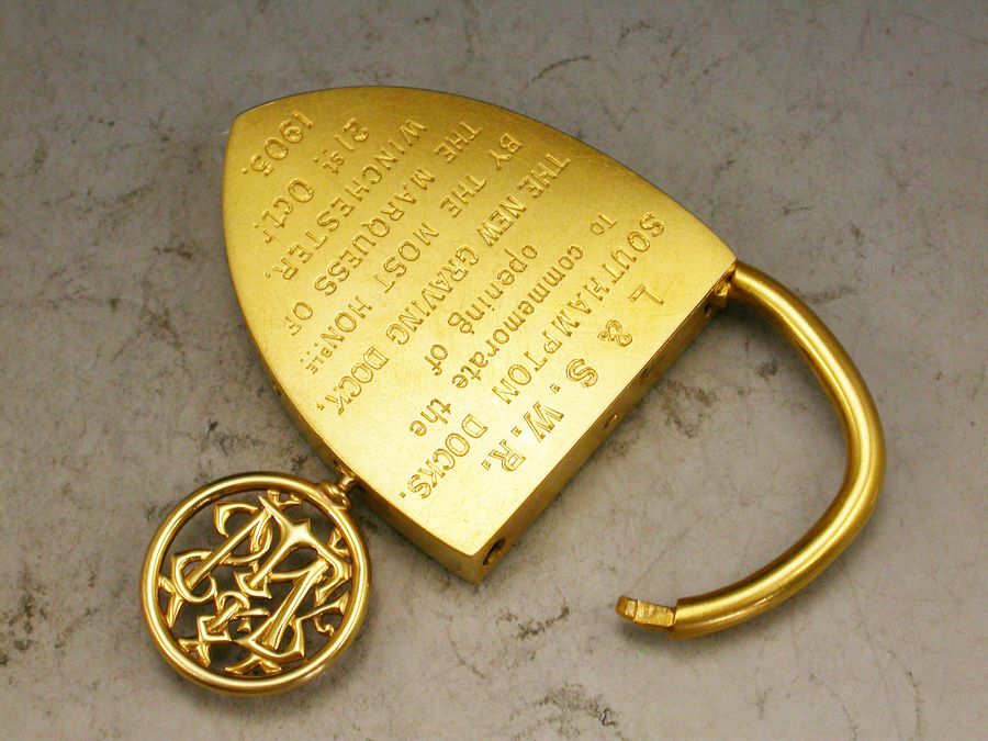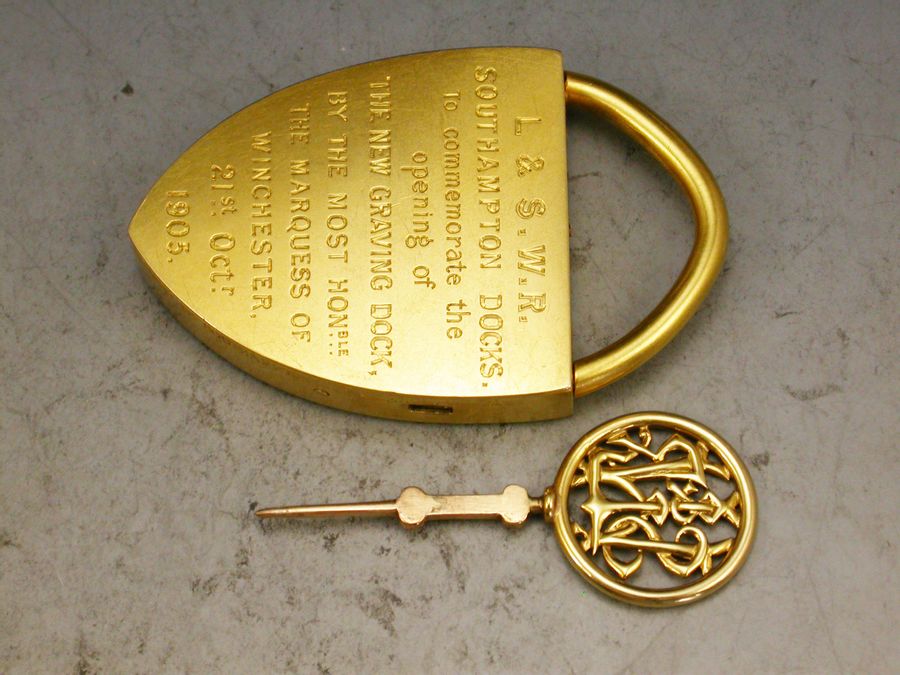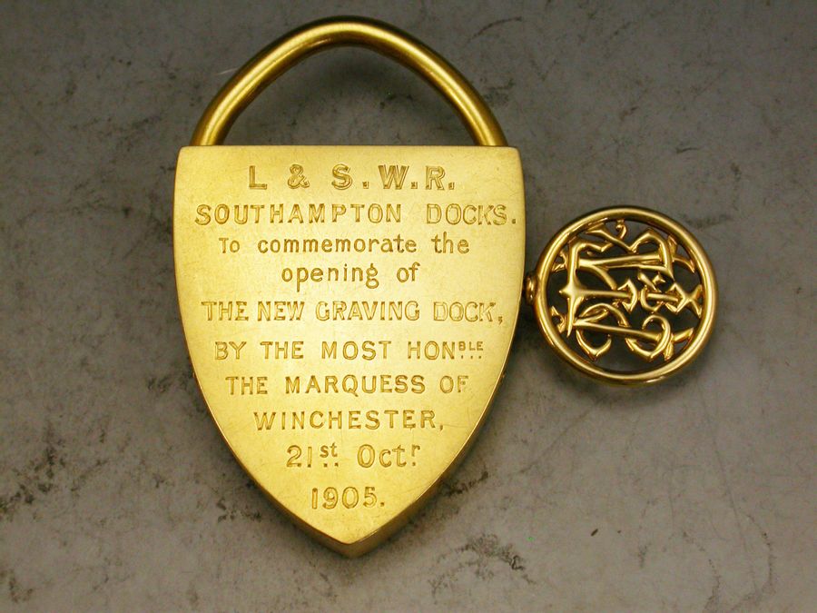 An interesting Edwardian gold cased presentation Padlock and Key, the face with an enamelled panel depicting the coat of arms of Southampton, the gold key pierced with the cypher of the London and South West Railway, the reverse of the padlock engraved with the presentation inscription :- L&S.W.R. SOUTHAMPTON DOCKS. To Commemorate the opening of THE NEW GRAVING DOCK, BY THE MOST HONble THE MARQUESS OF WINCHESTER 21 OCTr 1905. A further inscription to the side of the padlock :- this lock was used by his Worship The Mayor of Southampton, COL. E.BANCE.V.D.D.L.
