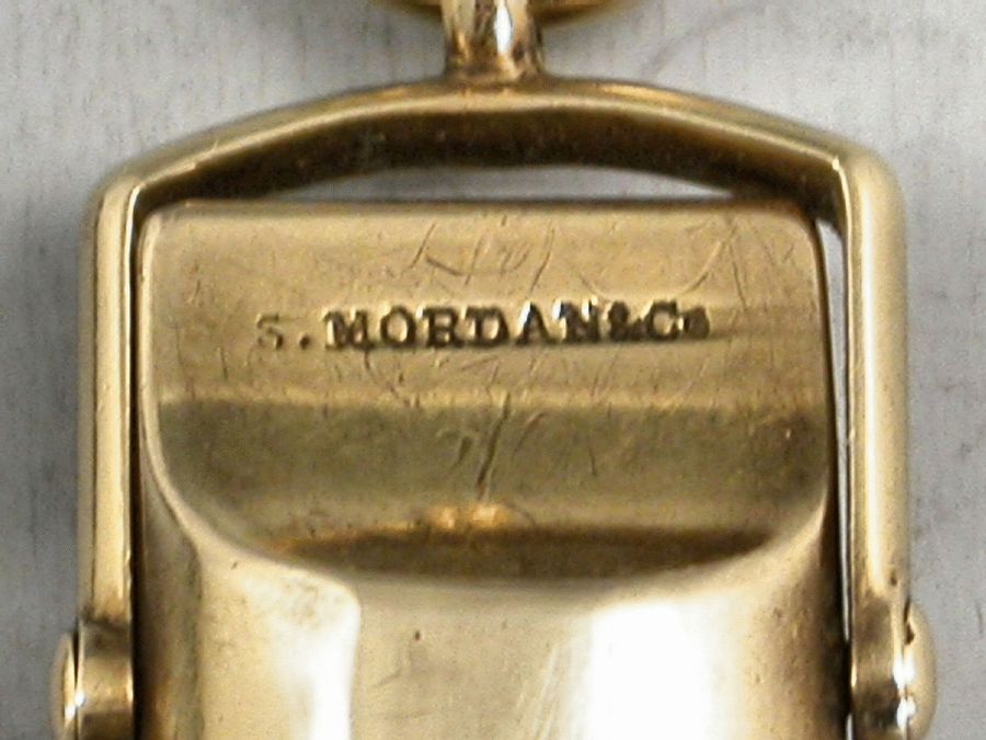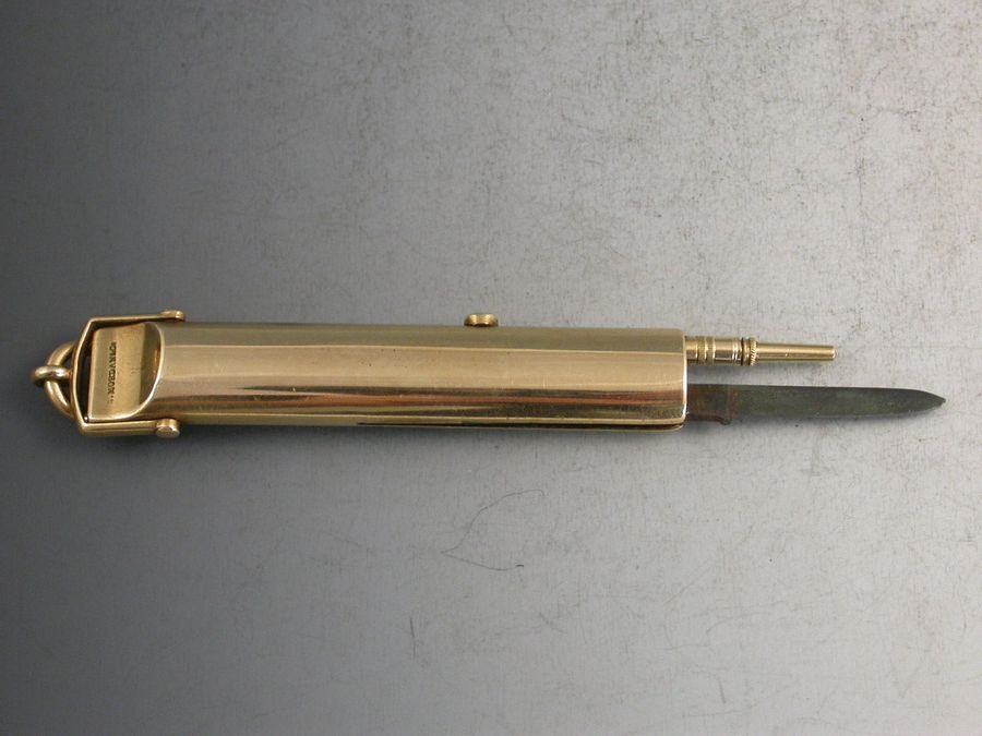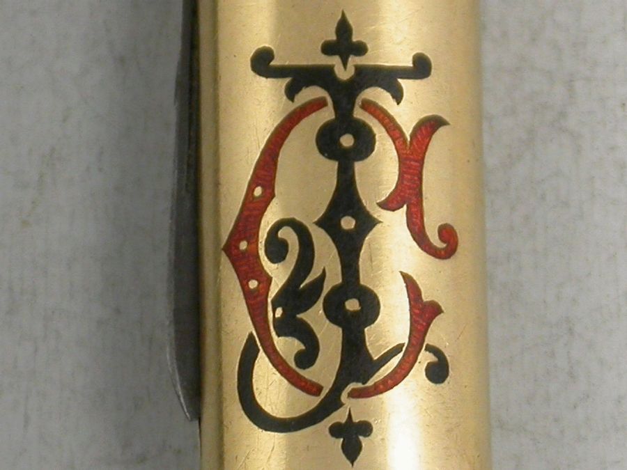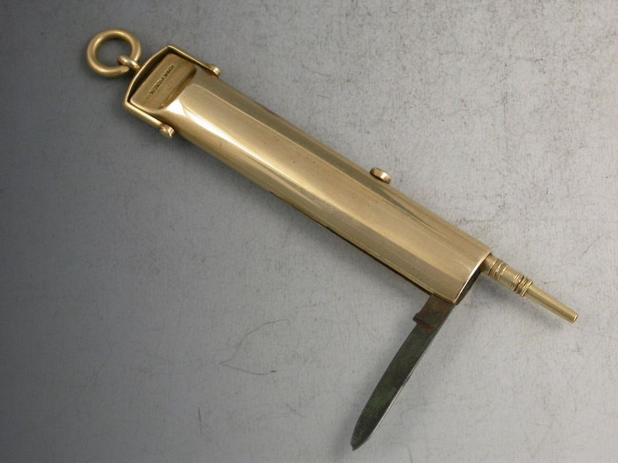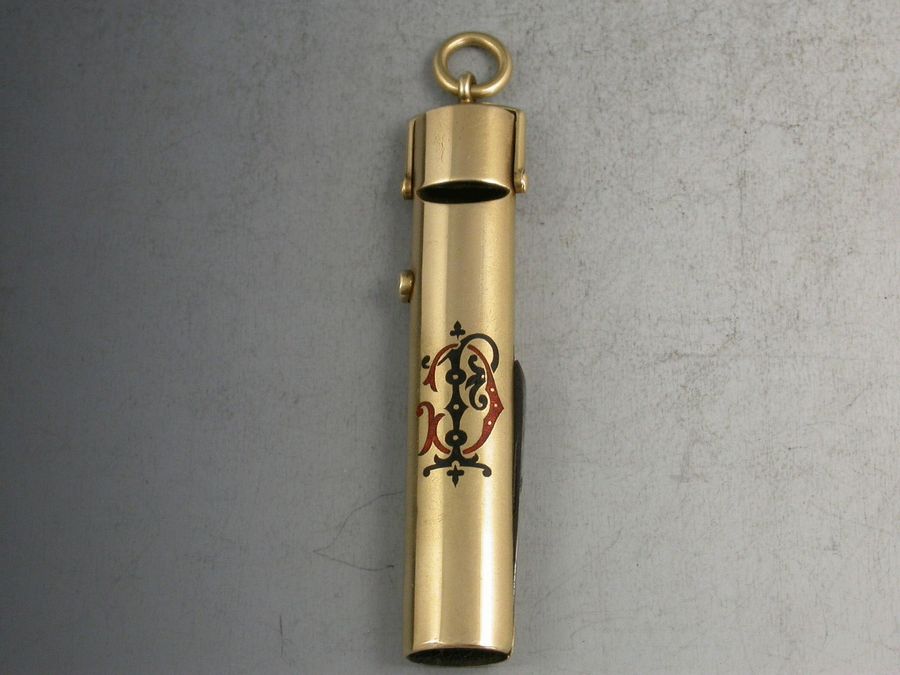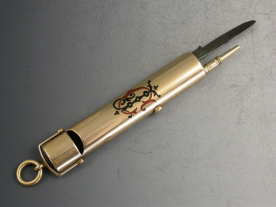 A fine Victorian gold (unmarked) Gentleman’s Compendium consisting of whistle, slide action propelling pencil and pen knife, the body with enamelled monogram ‘JC’.