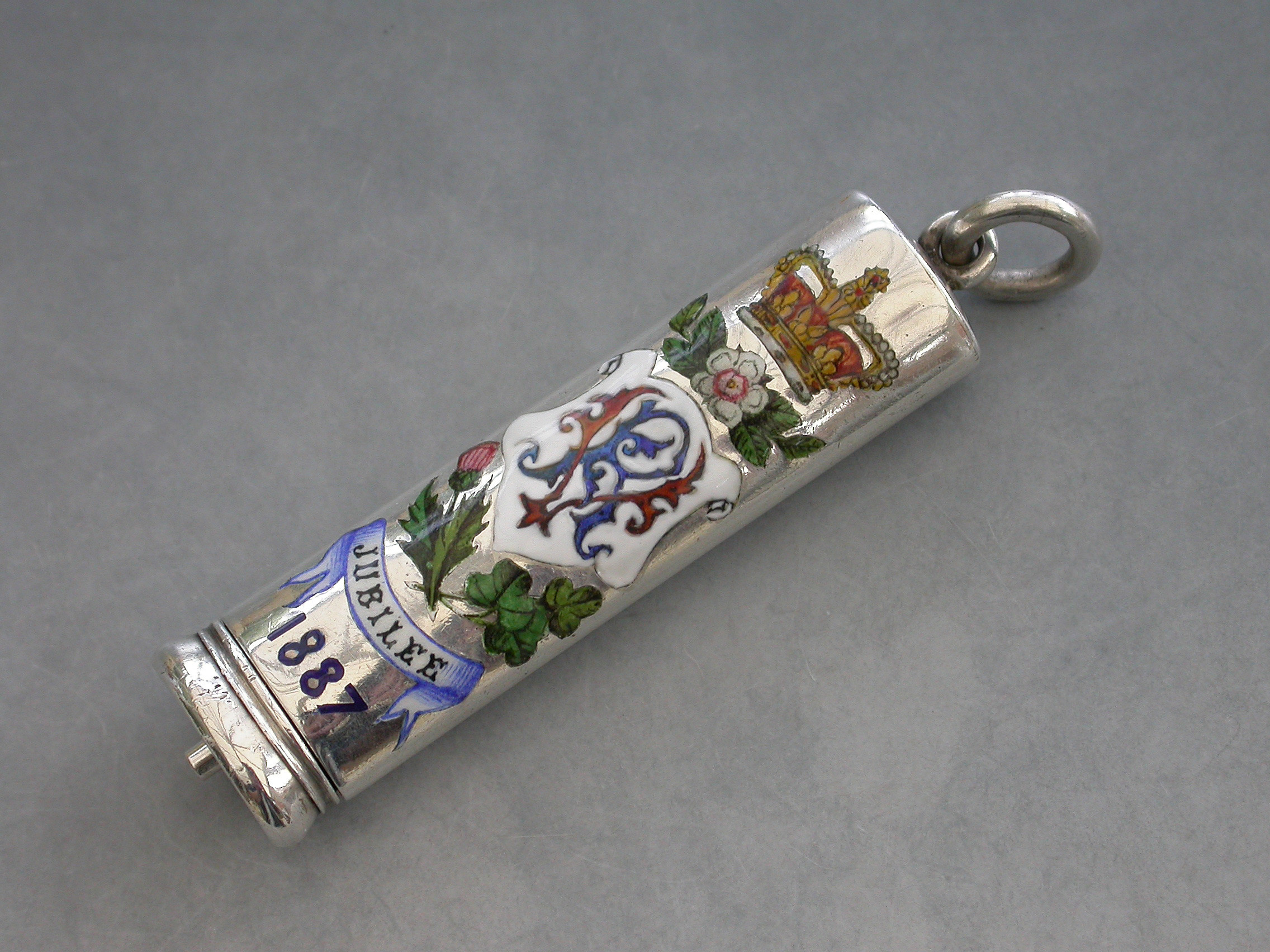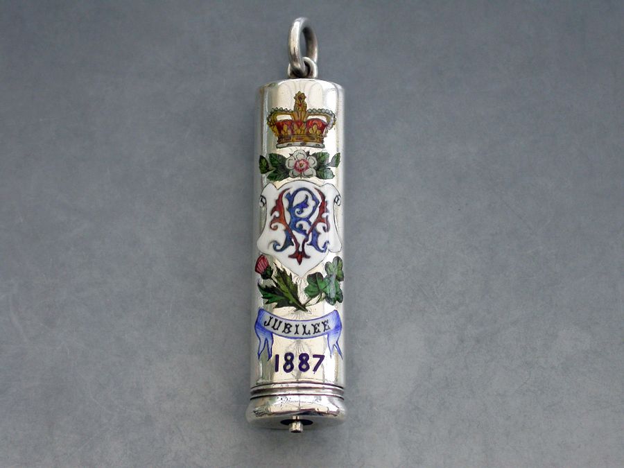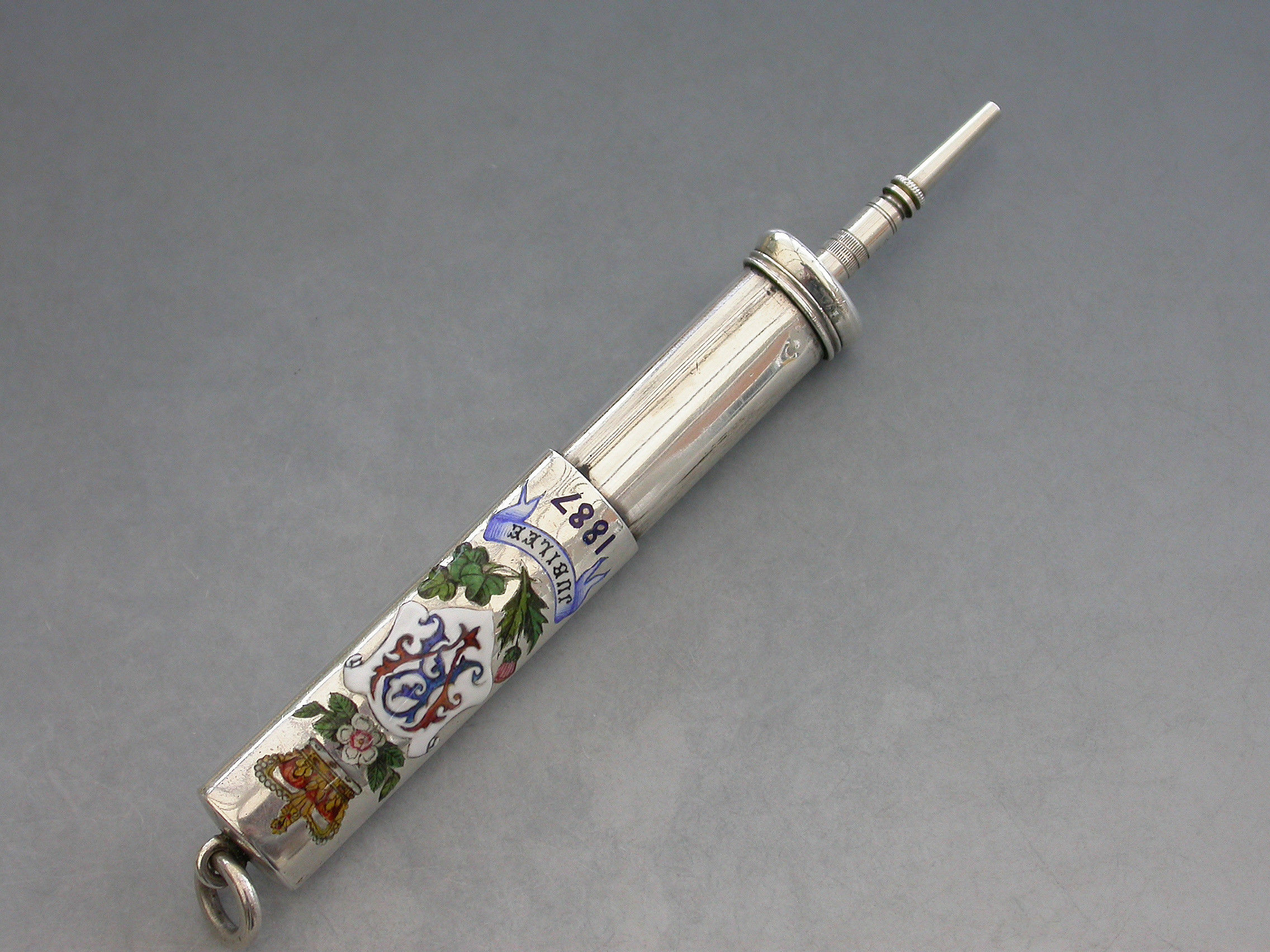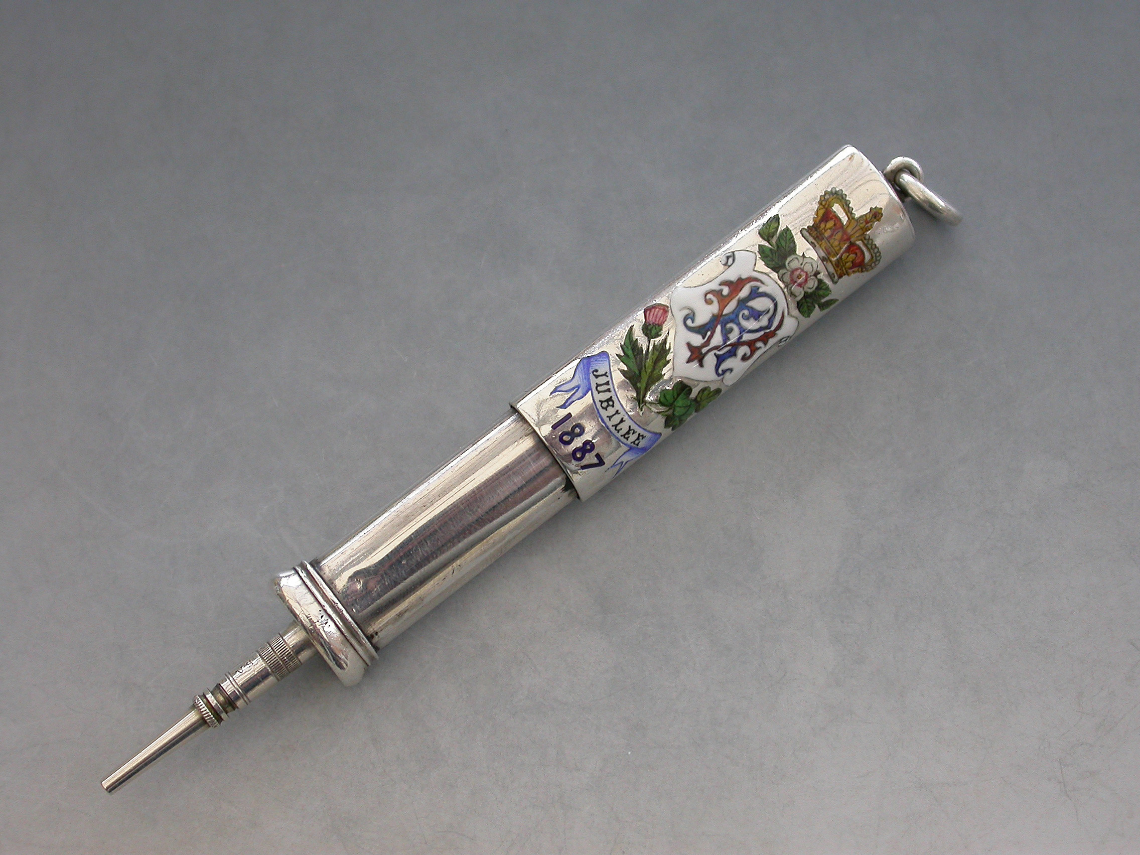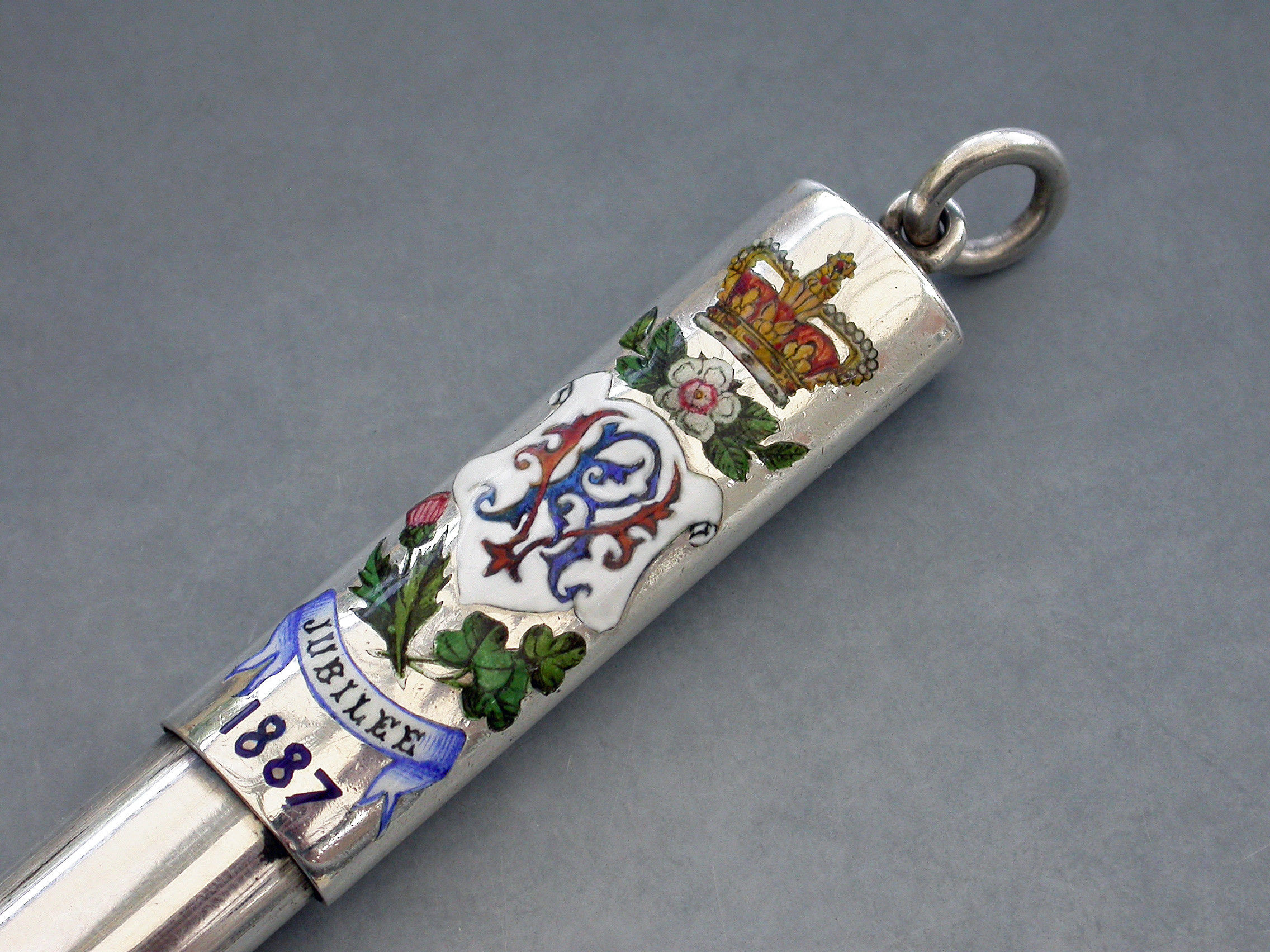 An extremely fine and rare Victorian silver and enamel telescopic Propelling Pencil, of flat oval form with attached suspension ring. The body enamelled with a Royal Crown above a shield with a cypher of Queen Victoria ""VR"" between the Flowers of the Union (English Rose, Scottish Thistle and Irish Shamrock), a banner entitled 'JUBILEE' above the date 1887.