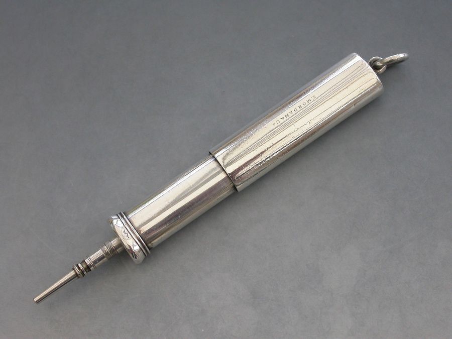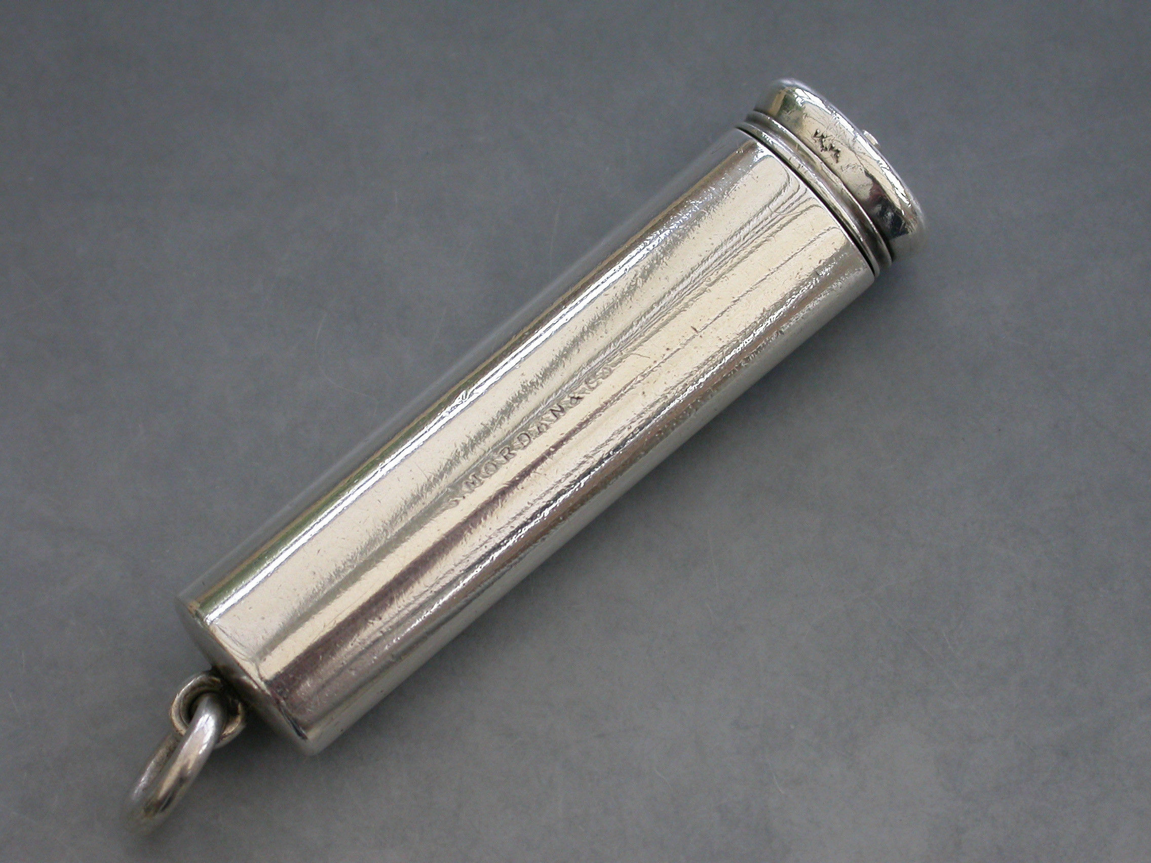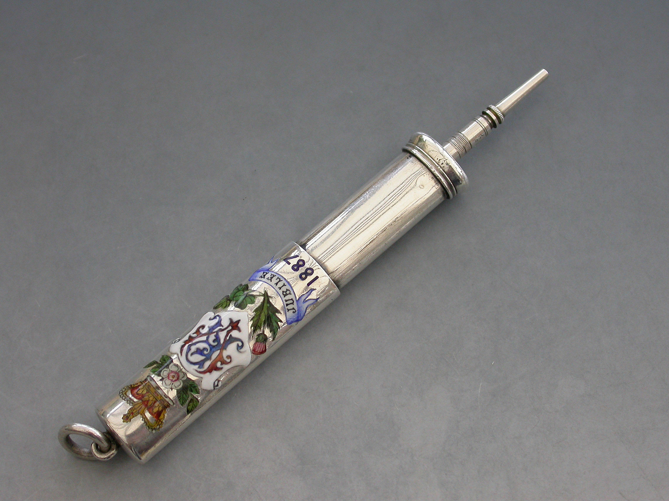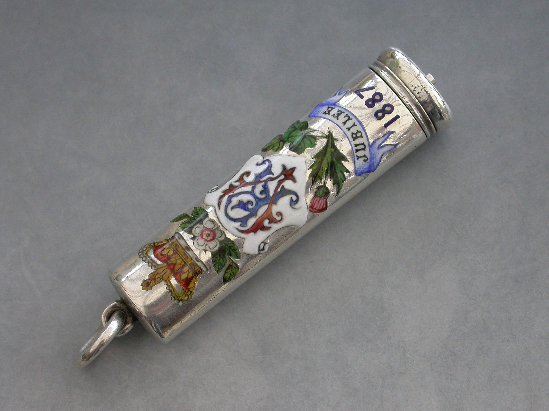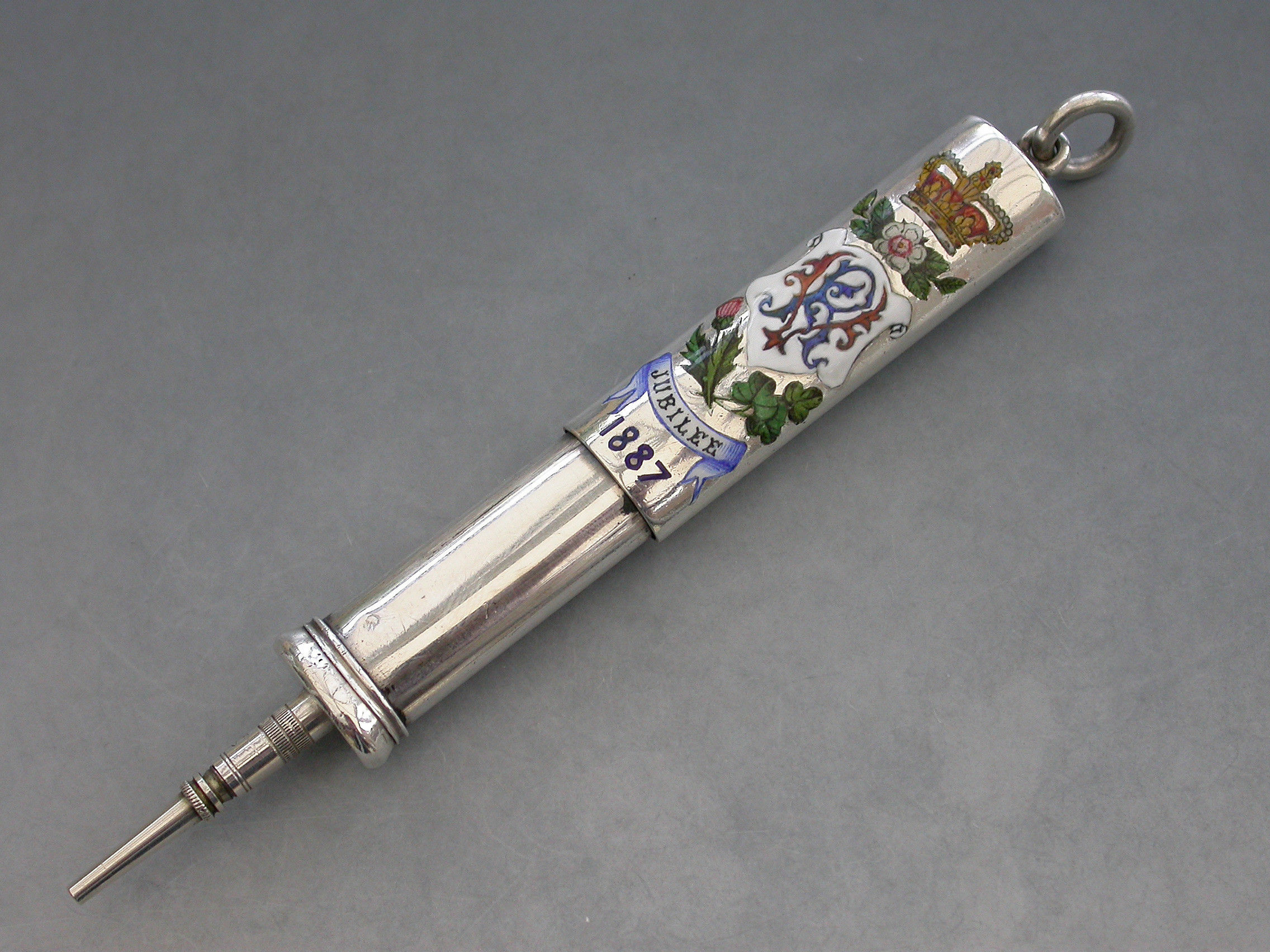 An extremely fine and rare Victorian silver and enamel telescopic Propelling Pencil, of flat oval form with attached suspension ring. The body enamelled with a Royal Crown above a shield with a cypher of Queen Victoria ""VR"" between the Flowers of the Union (English Rose, Scottish Thistle and Irish Shamrock), a banner entitled 'JUBILEE' above the date 1887.