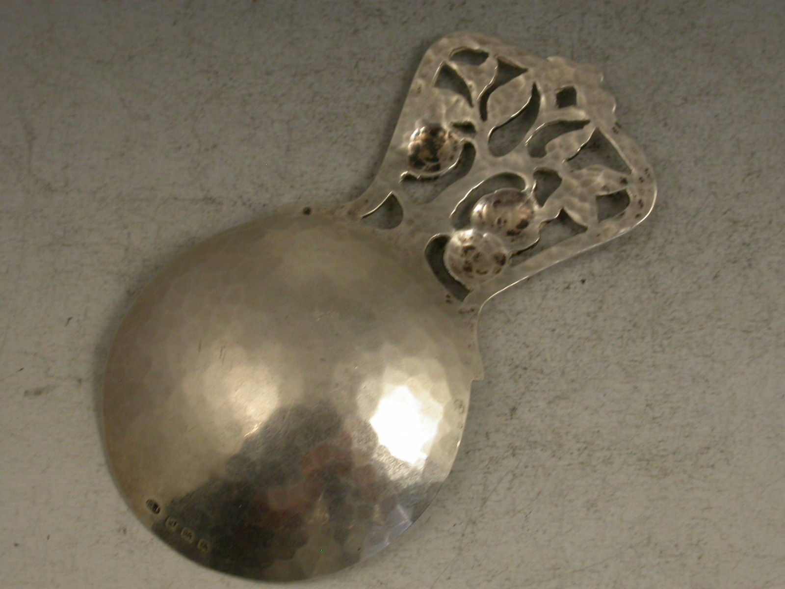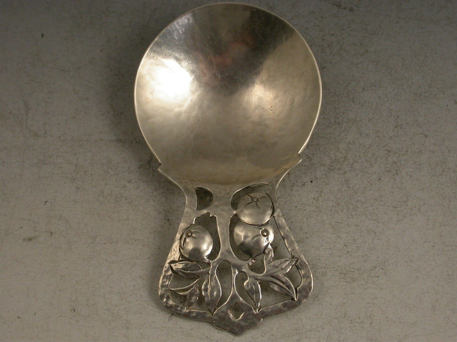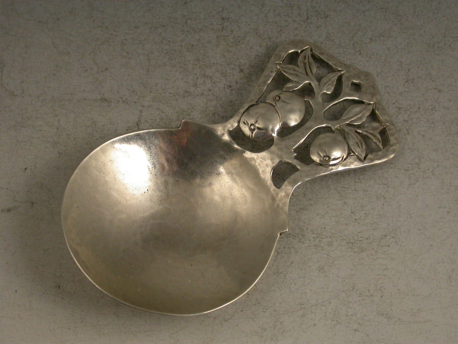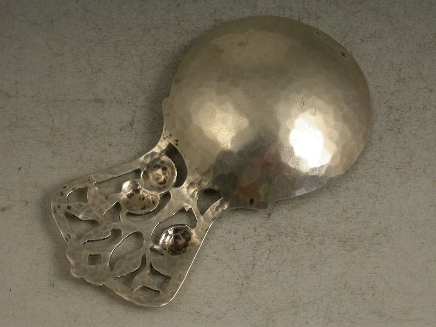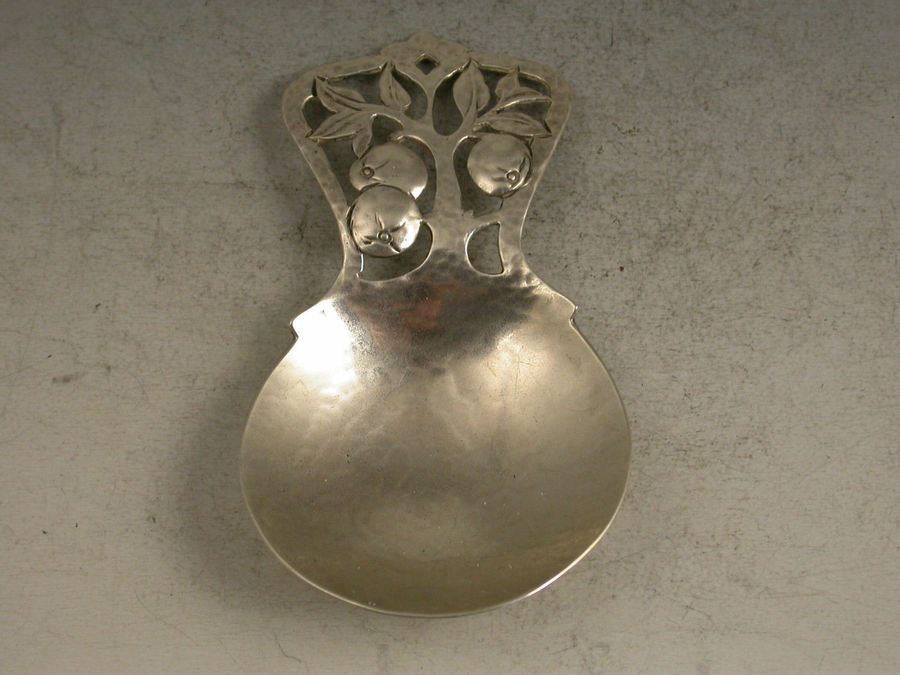 A rare and fine quality early 20th century handmade Caddy Spoon in the Arts & Crafts style with a hammered circular bowl and pierced apple tree handle.