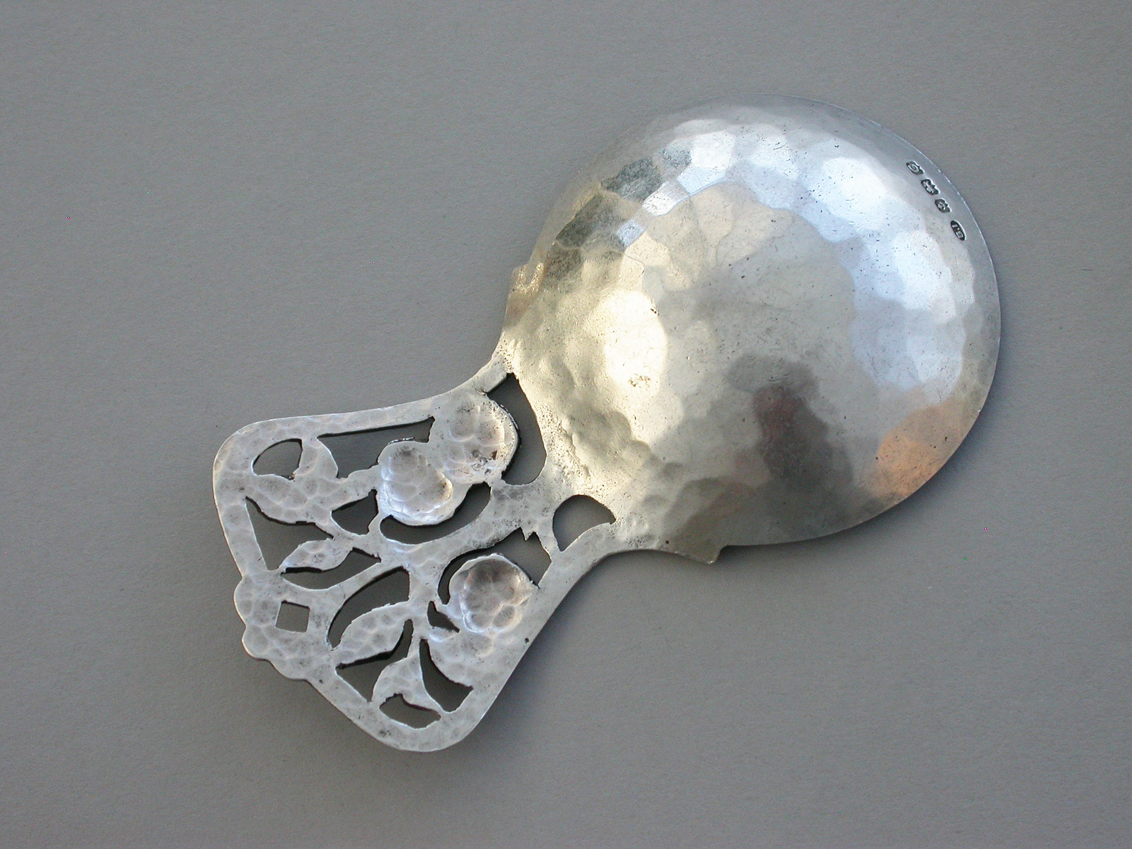 A rare and fine quality early 20th century handmade silver Caddy Spoon in the Arts & Crafts style with a hammered circular bowl and pierced apple tree handle.