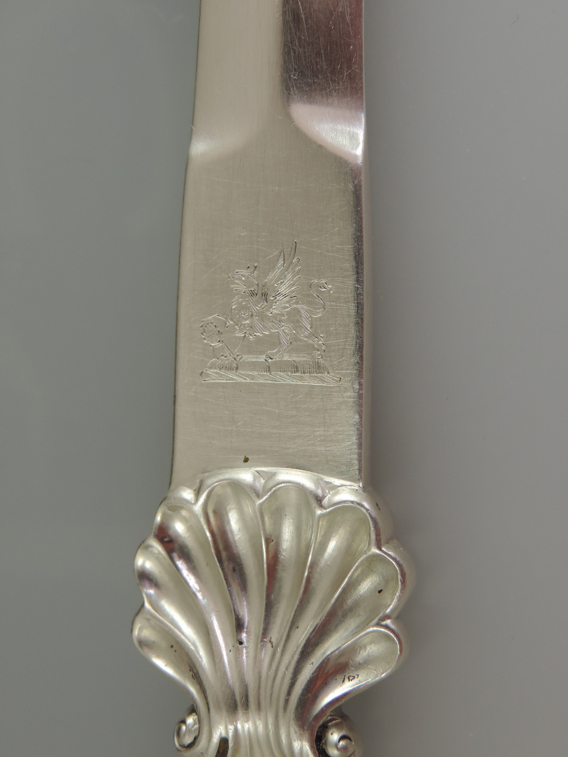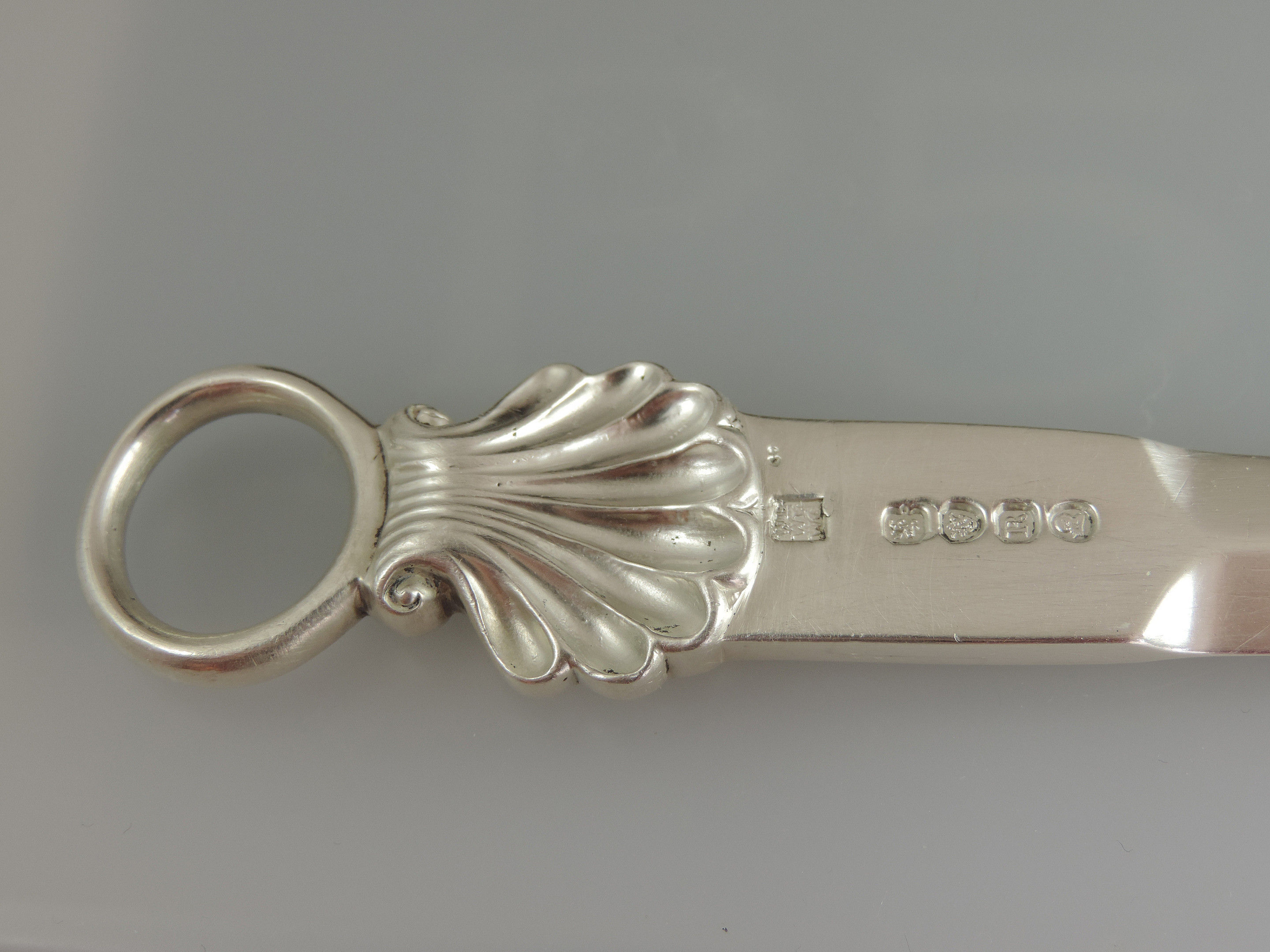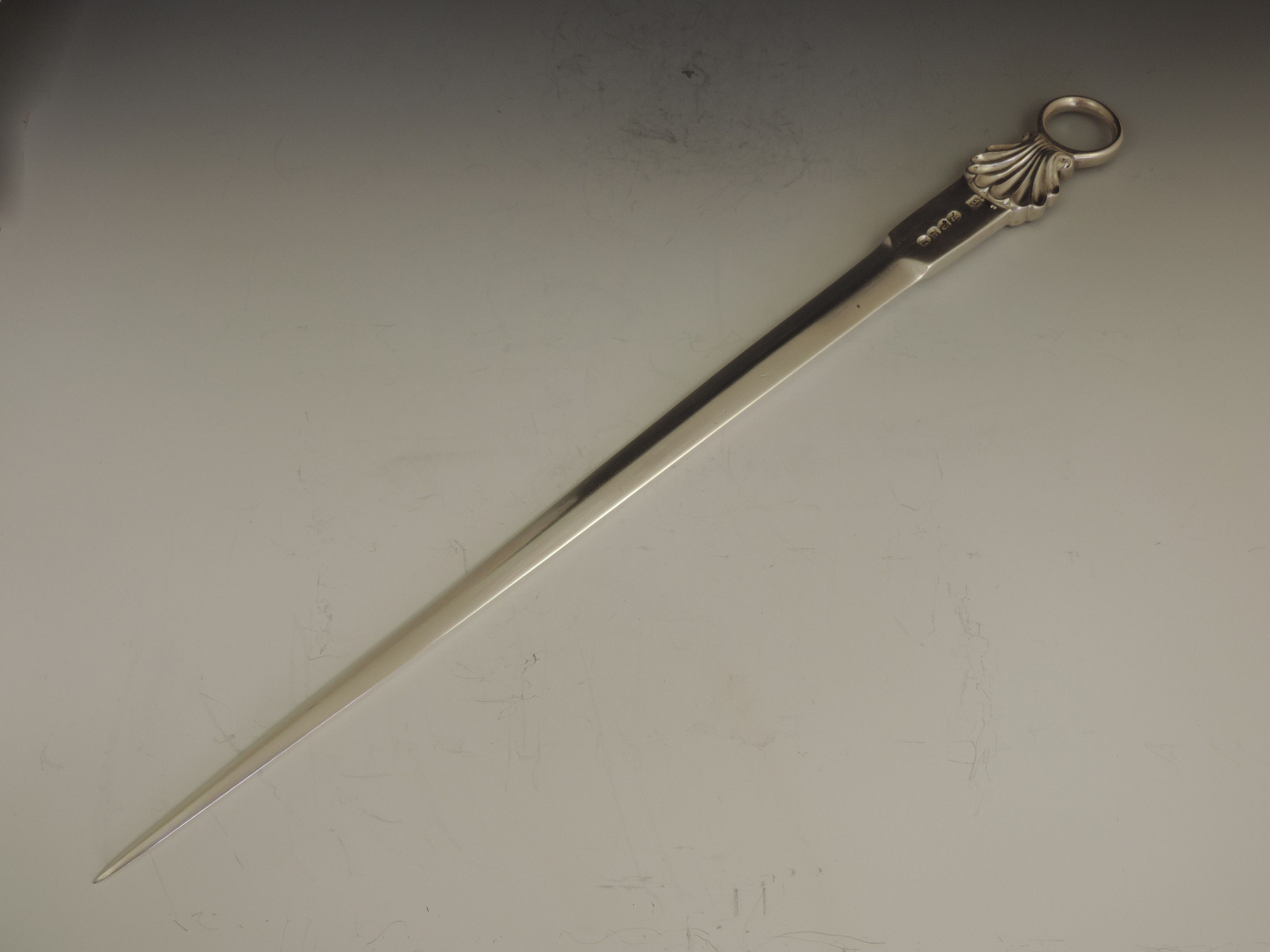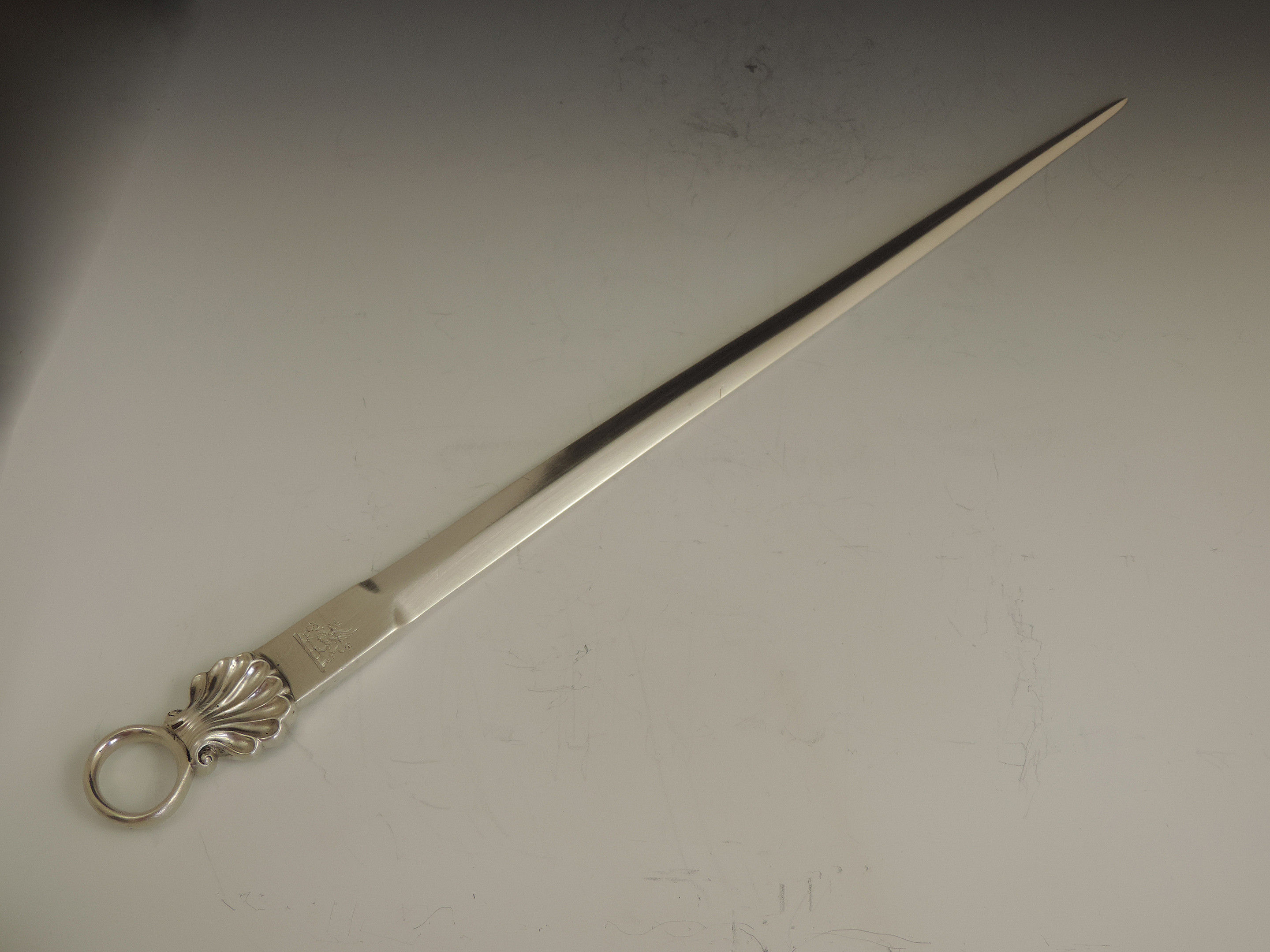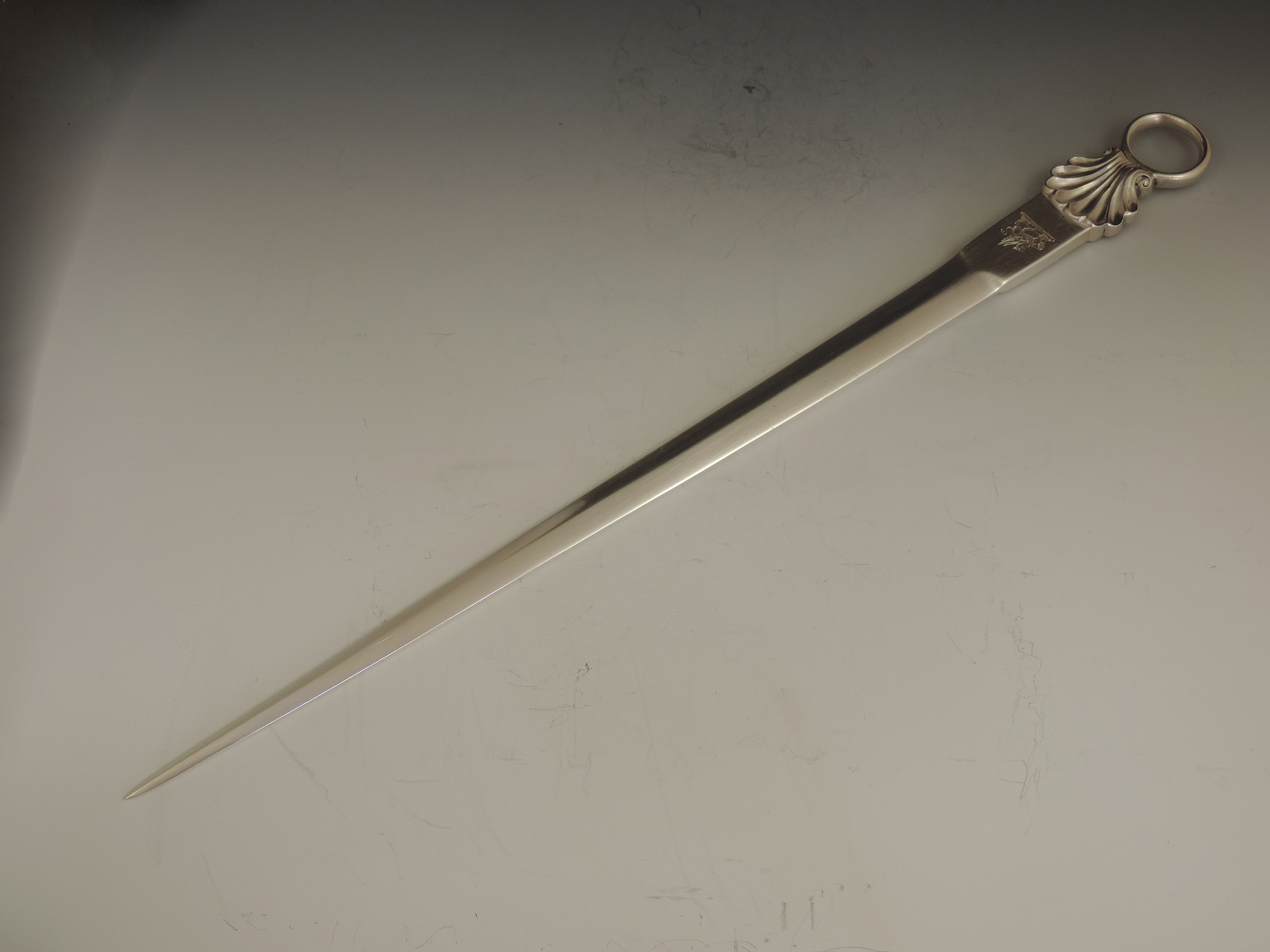 A good quality heavy George III silver Meat Skewer with plain tapering blade and cast shell mounted ring handle. Engraved with a contemporary crest.