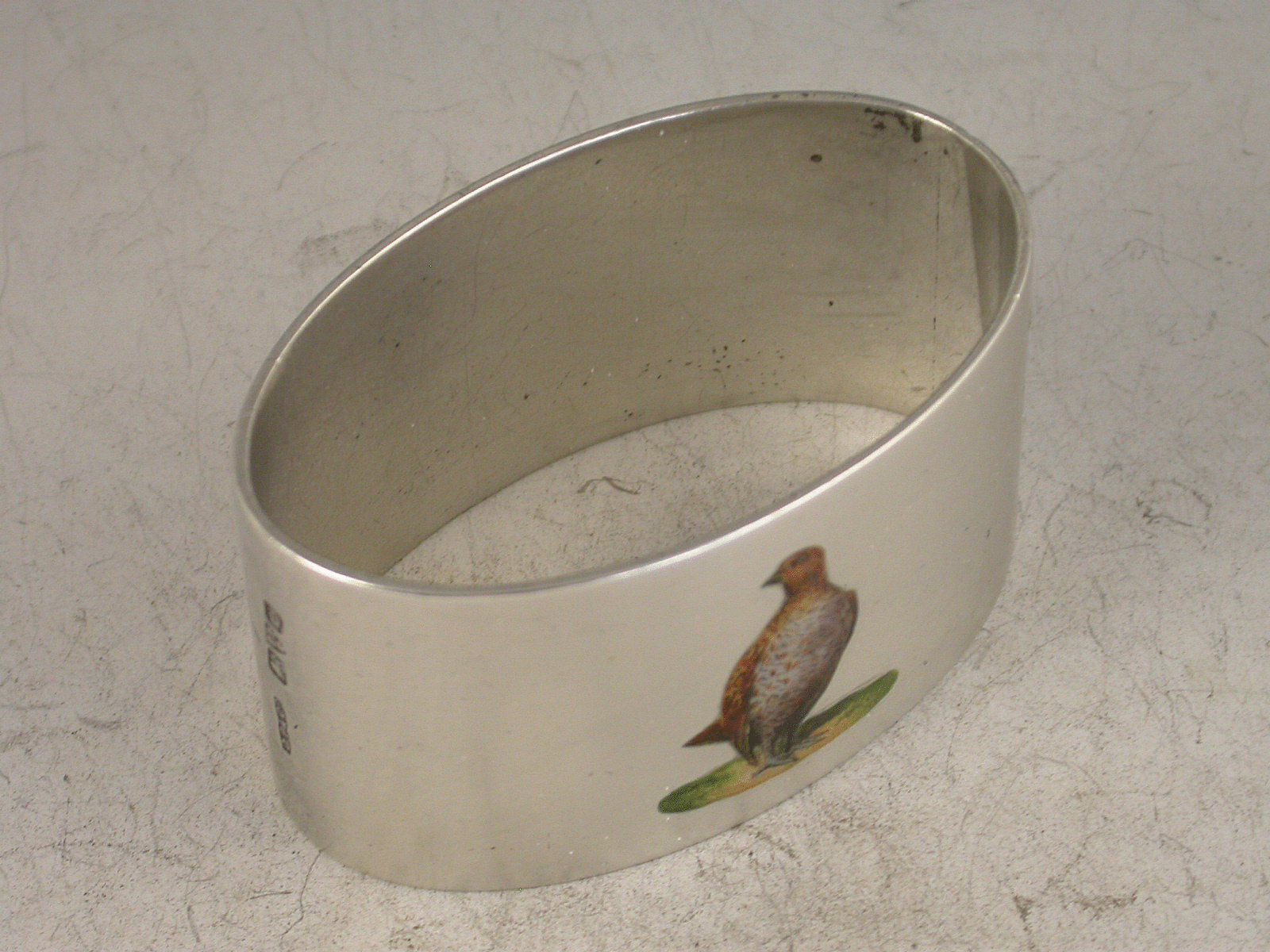 A fine quality George V oval silver Napkin ring of good gauge, inset with an enamel portrait of a Grouse.