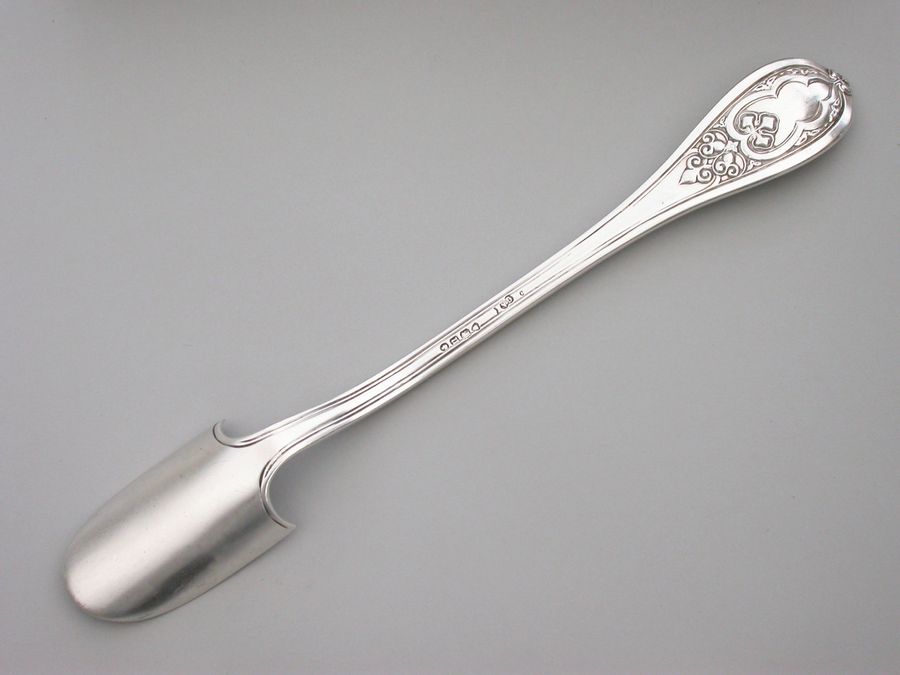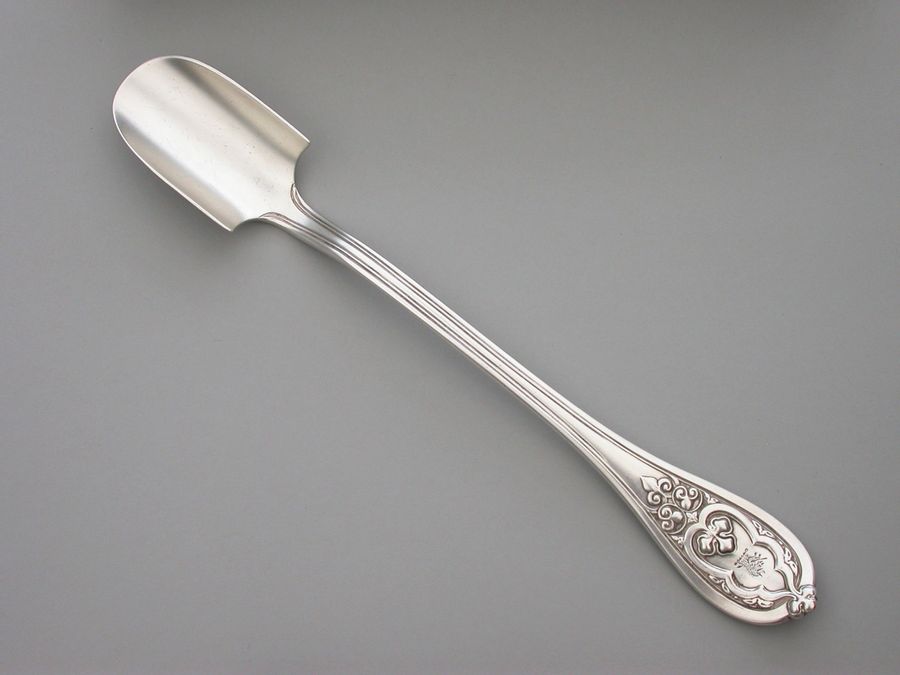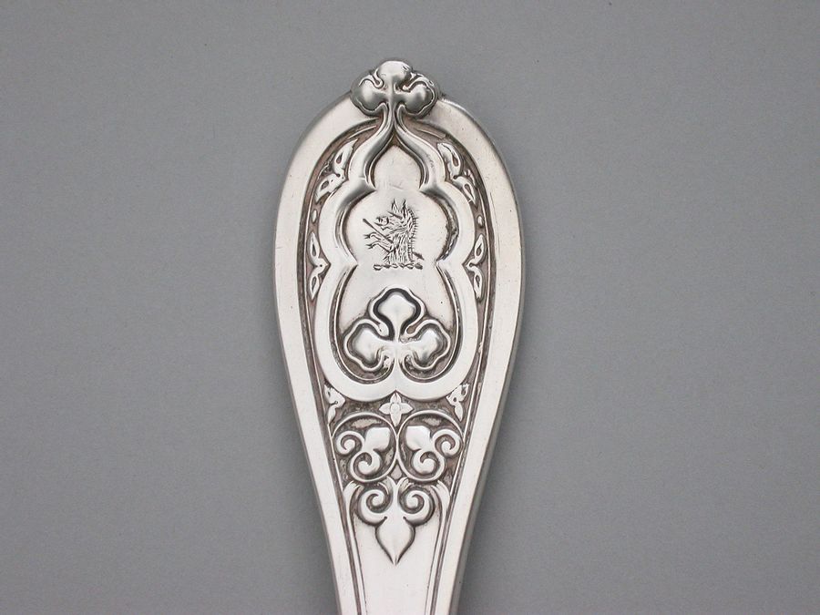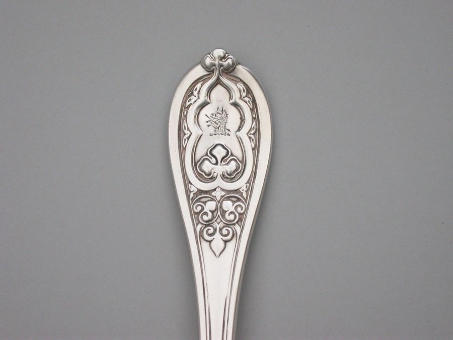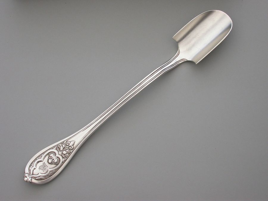 A good quality and very heavy gauge Victorian silver Stilton Cheese Scoop, in 'New Gothic' pattern. The terminal engraved with a crest.