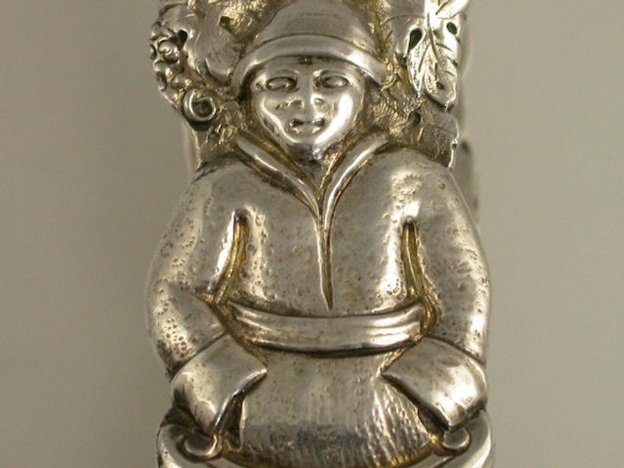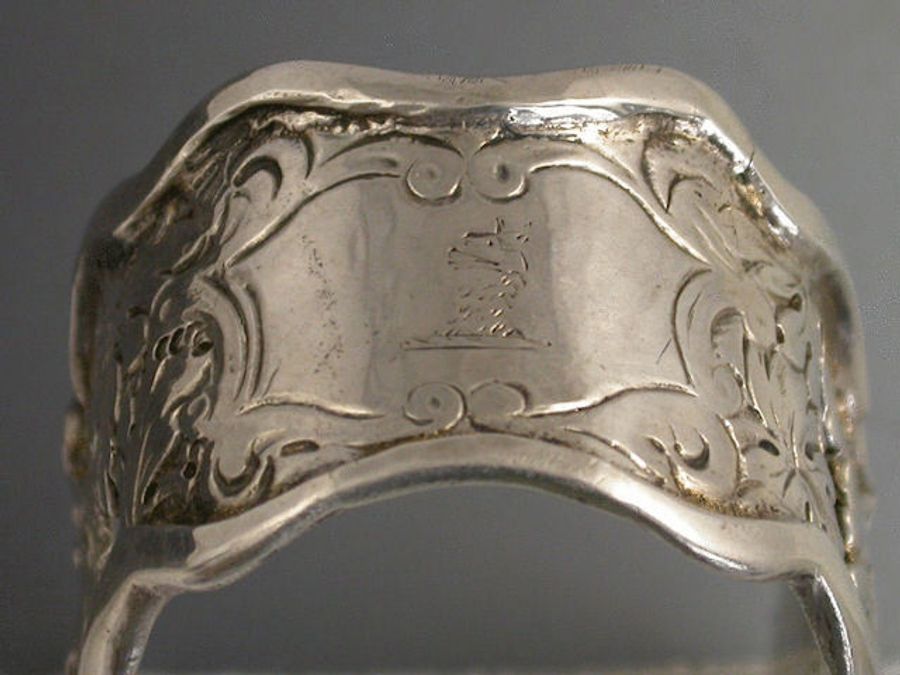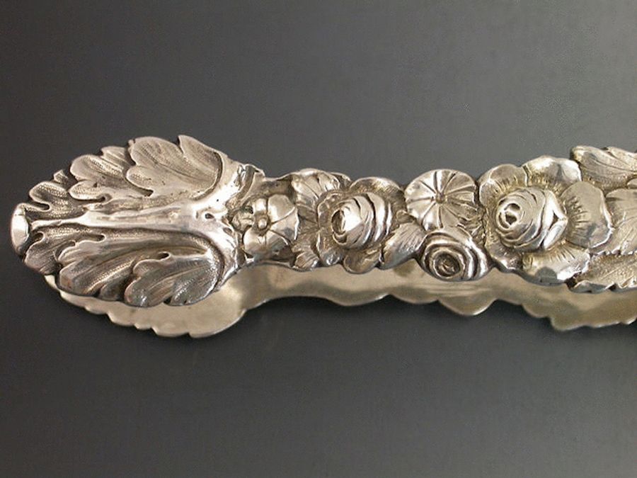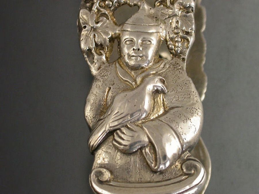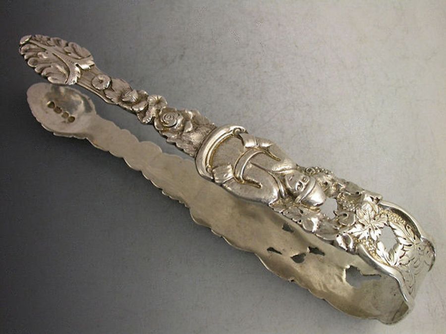 An extraordinary pair of early Victorian large cast silver Sugar Tongs, the pierced bow formed from fruiting vines, a Chinaman holding a bird to one arm and another character to the other, flower heads and foliage to the bottom of the arms with acanthus leaf bowls. The cartouche to the bow engraved with a crest of a Gryphons head.