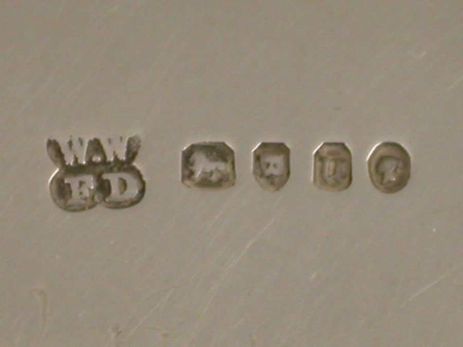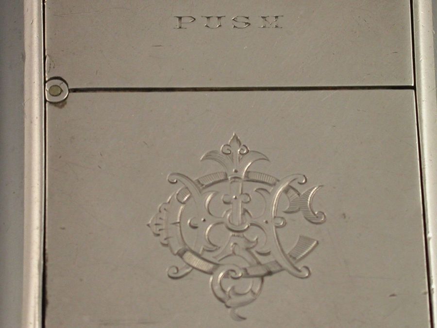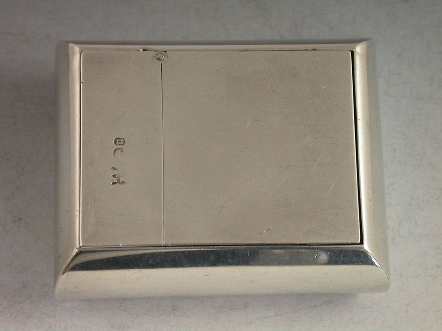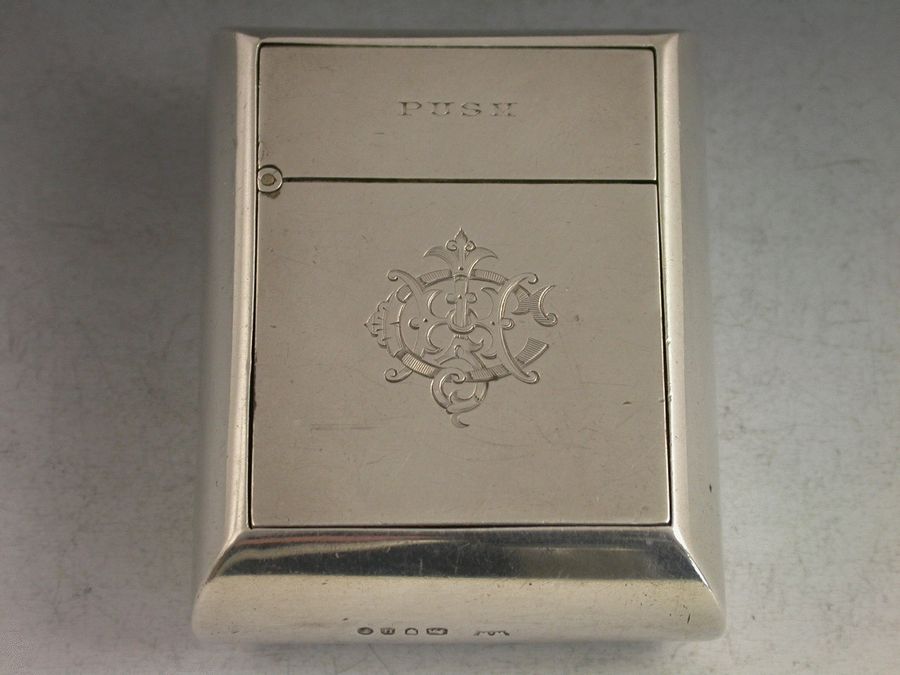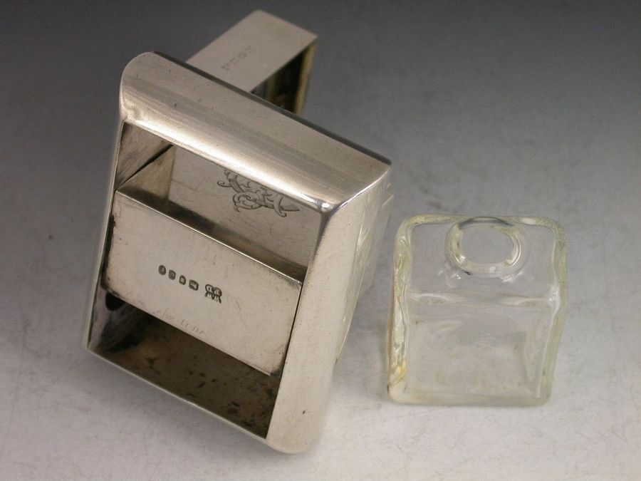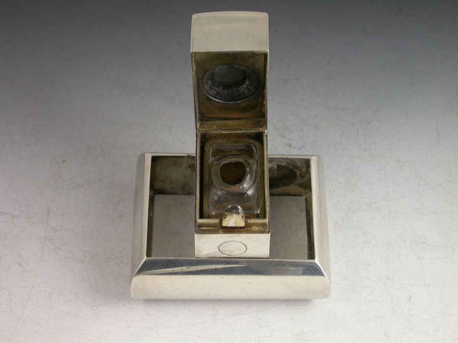 An ingenious Victorian silver Travelling Inkwell, of plain rounded rectangular form when closed. The inkwell is opened by pushing one end down so that the central section swivels on an axis and can stand upright where it locks in place. Pushing the button opens the catch to reveal a snug fitting inner glass ink bottle. The lid is corked to form a seal to prevent leakage. The face engraved with a contemporary cipher and the word ‘push’.
