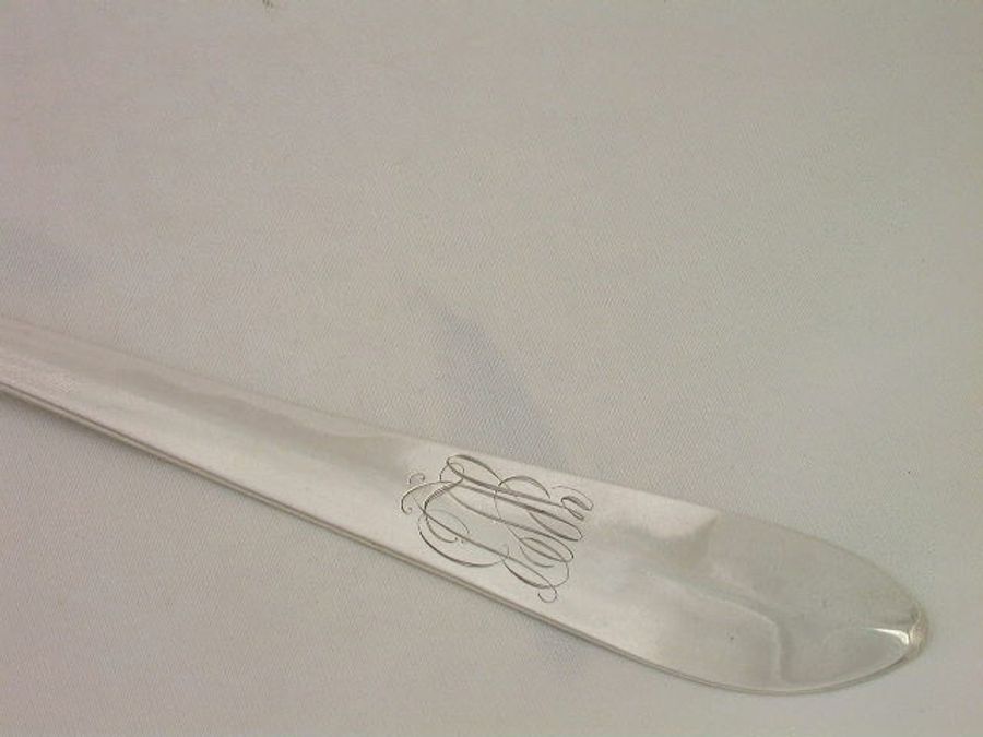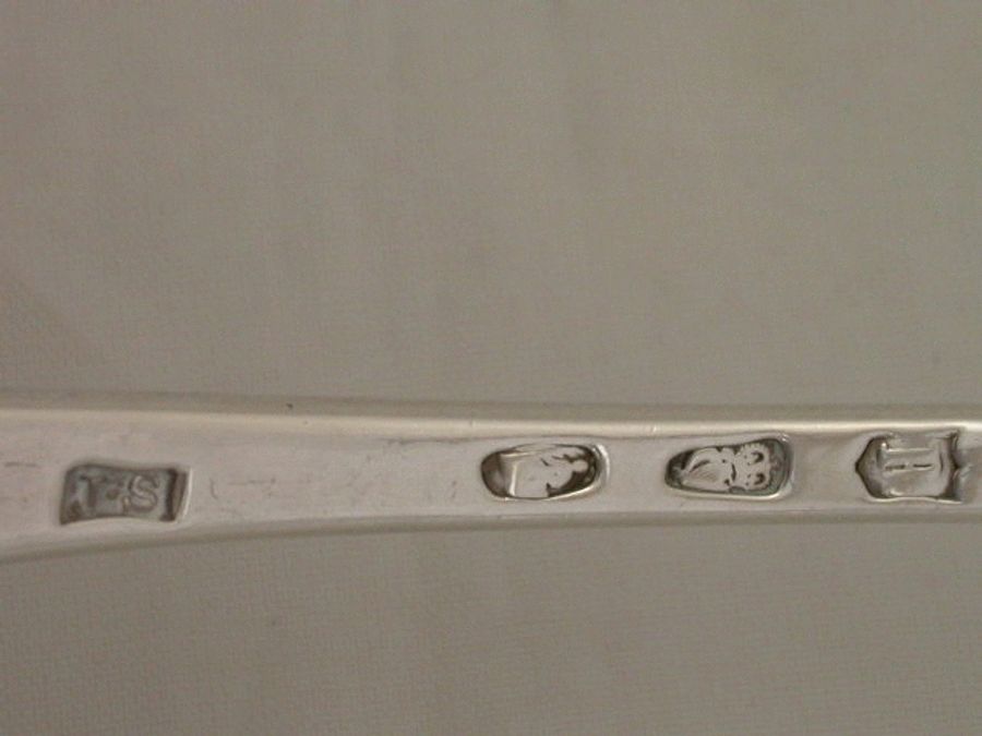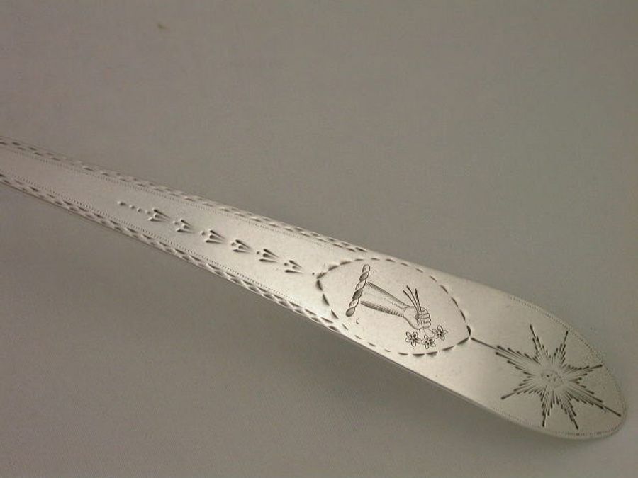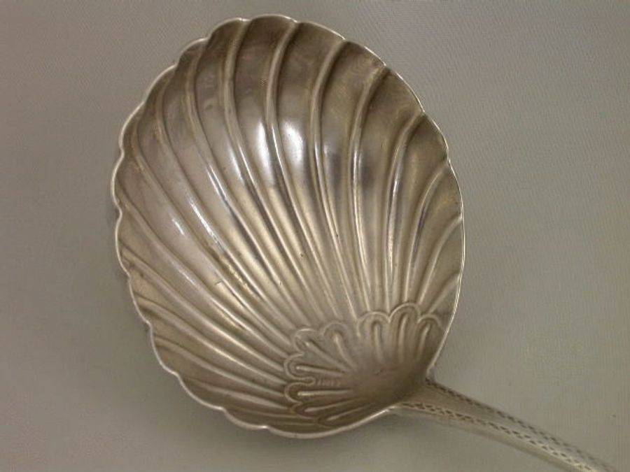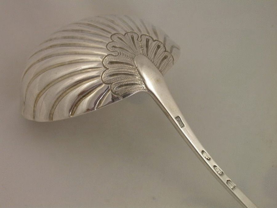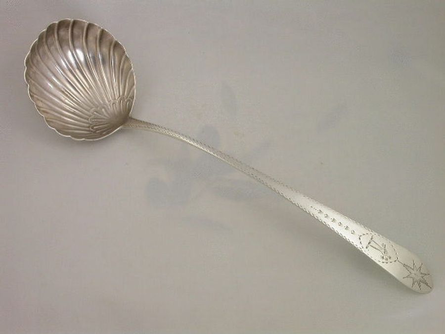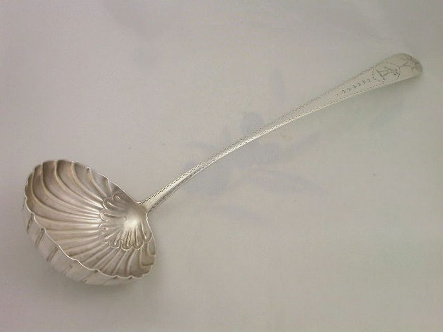 A fine George III Irish silver Soup Ladle, with typical bright-cut star engraved pointed Old English handle with feather edge border and contemporary family crest, deep circular shell shaped bowl and heel. Engraved initials to reverse of handle.