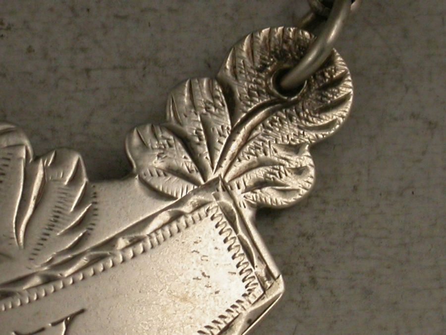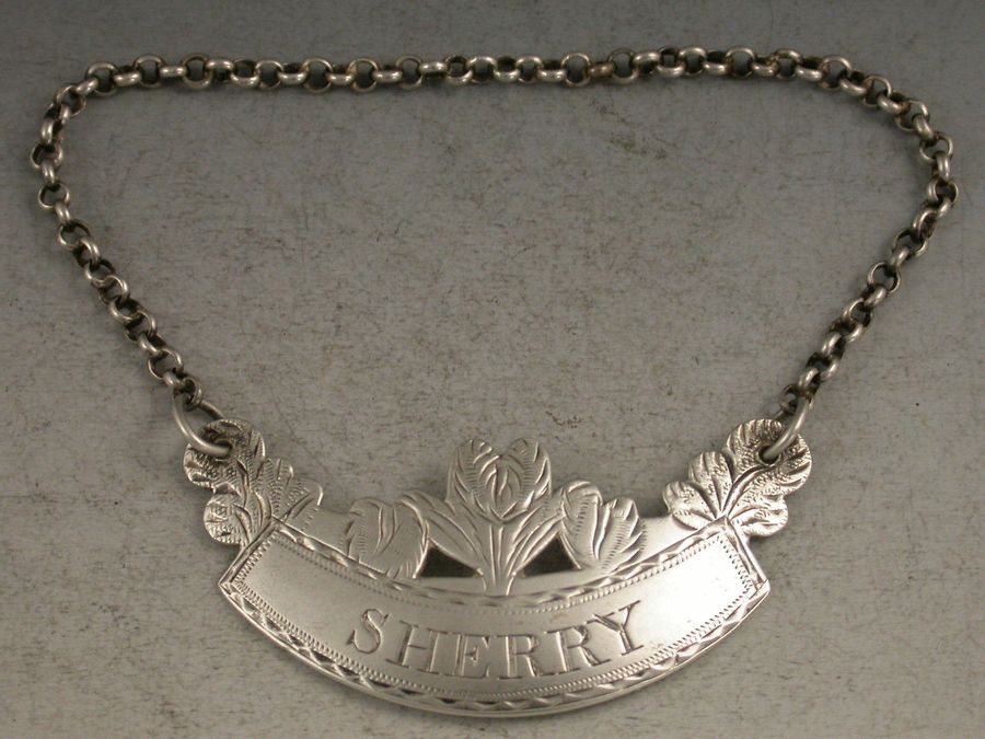 An extremely rare Irish Provincial silver Wine Label of shallow crescent form with scrolled leaf ends and “Prince of Wales feathers” type surmount, incised for Sherry, bright cut and prick dot engraved border. A copy of the “Prince of Wales feathers” label made in London, usually by the Bateman’s.