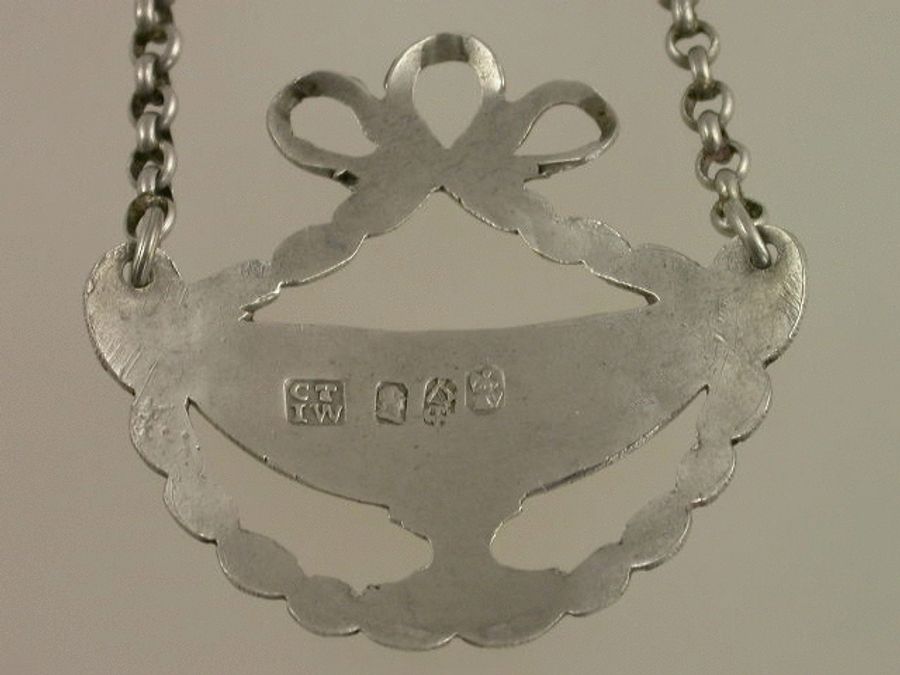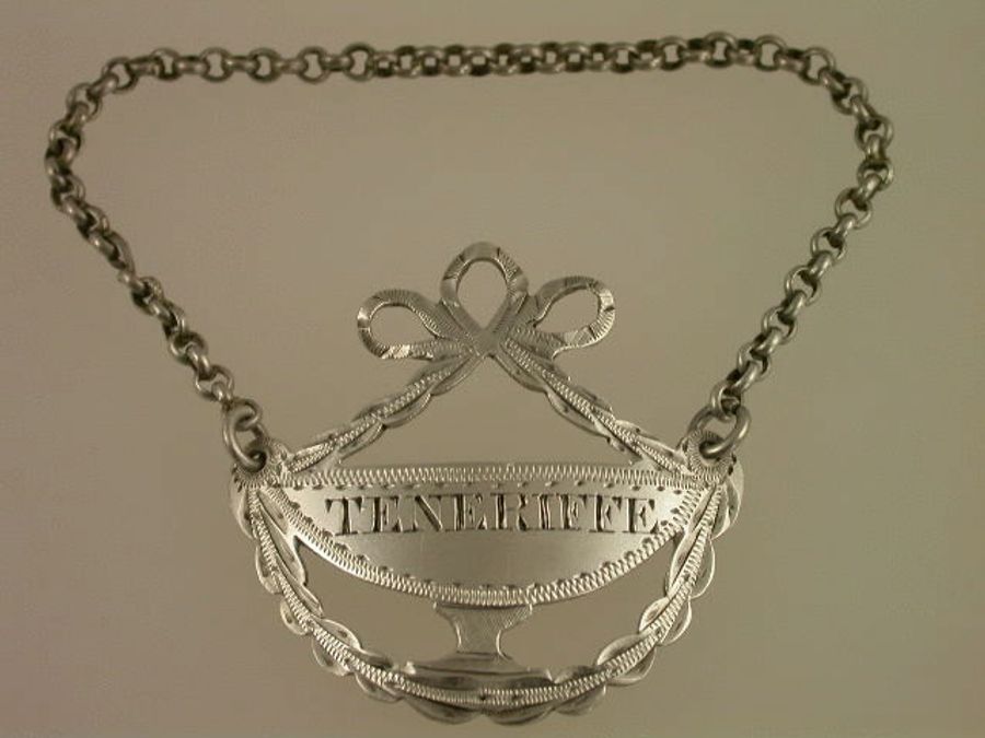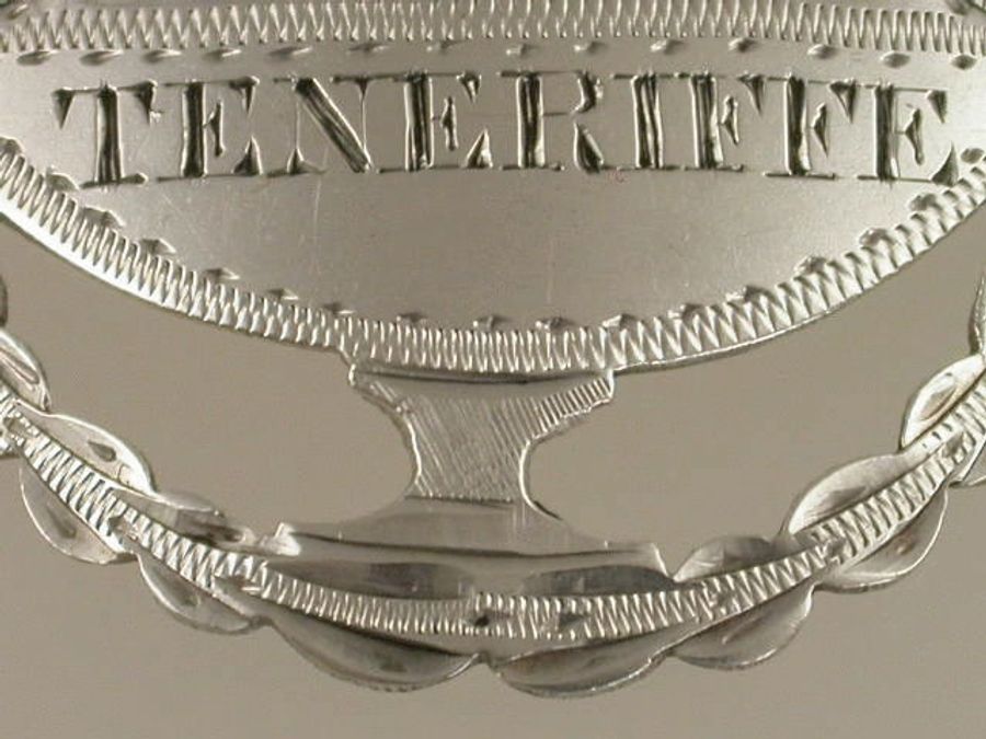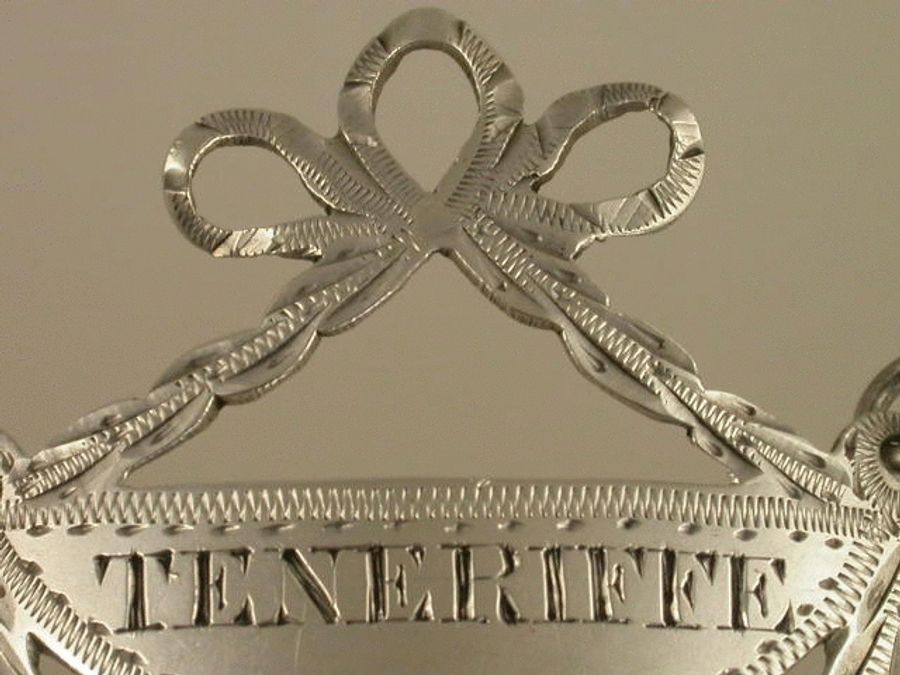 An extremely fine and rare George III Irish Provincial silver Wine Label of “Goblet, Festoon and Ribbon” form, with bright-cut and pricked engraving, incised for TENERIFFE.