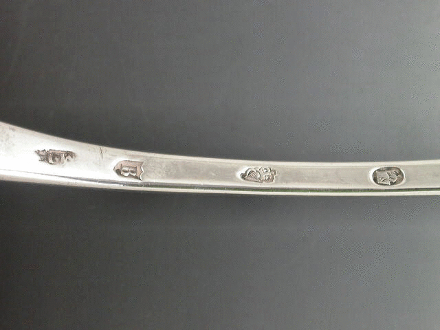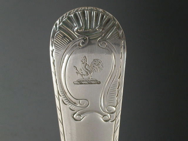 A good 18th century Irish silver Soup Ladle with shell shaped bowl and feather edge Old English pattern handle, the terminal engraved with a rococo scroll shaped cartouche engraved with a crest of a cockerel holding an ear of corn.