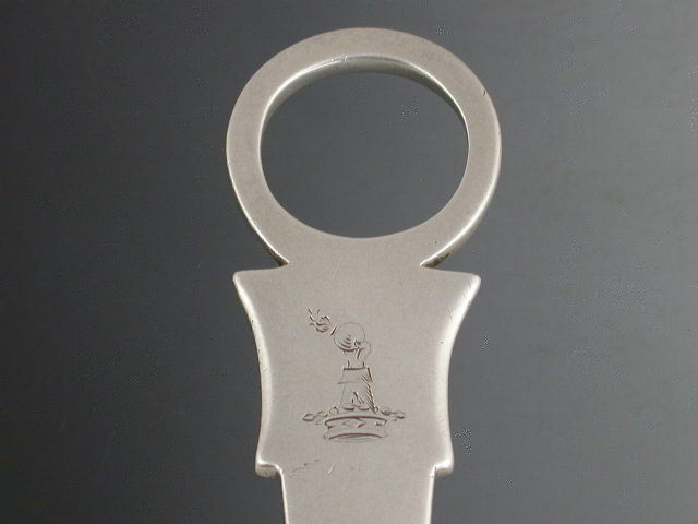 A good George III Irish silver Meat Skewer with plain ring terminal above a shield shaped cartouche engraved with a crest:-. “Out of a ducal coronet or, a cubit arm habited and gloved holding a fire-ball, all ppr”, probably for Spicer of Weare, in Topsham, Devon.