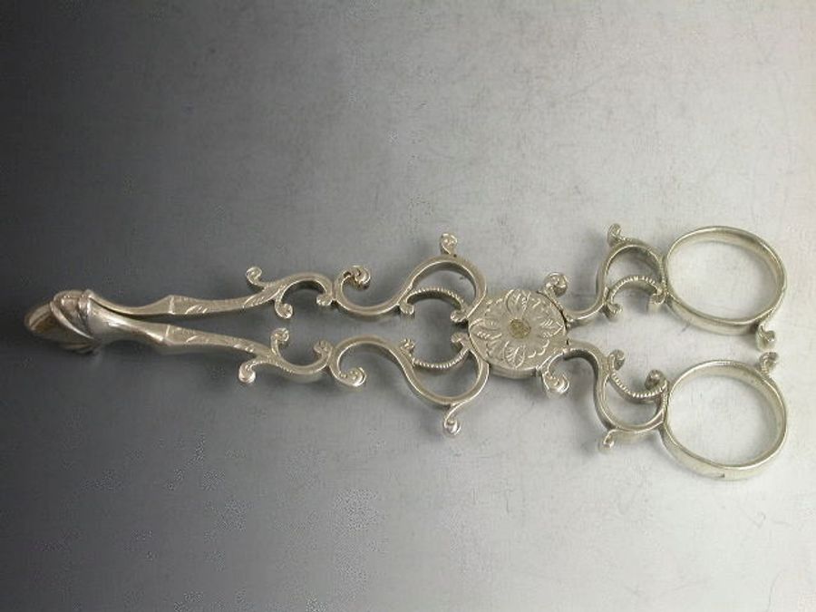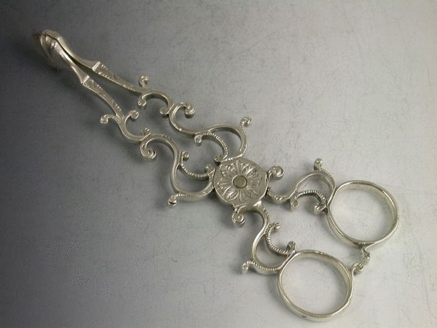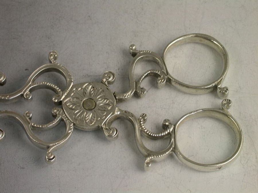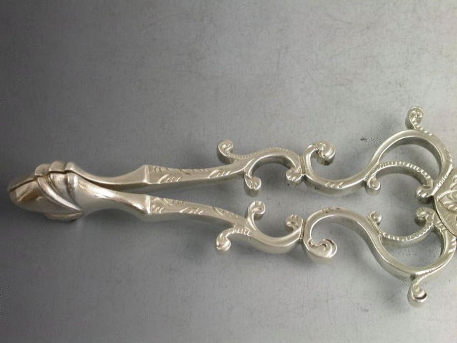 A good pair of Georgian Irish silver Sugar Nips of Rococo scroll form, the circular hinge engraved with flower heads.