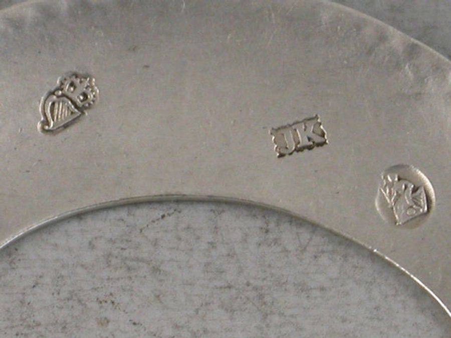 By J K of Dublin, c1785 (pre 1787 Harp and Hibernia marks). The unattributed maker J K in a serrated punch is probably John Kavanagh or James Keating.
