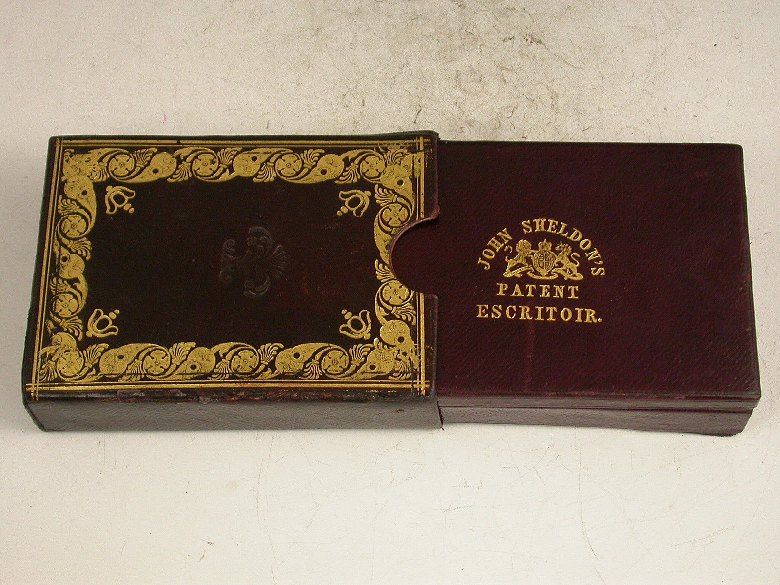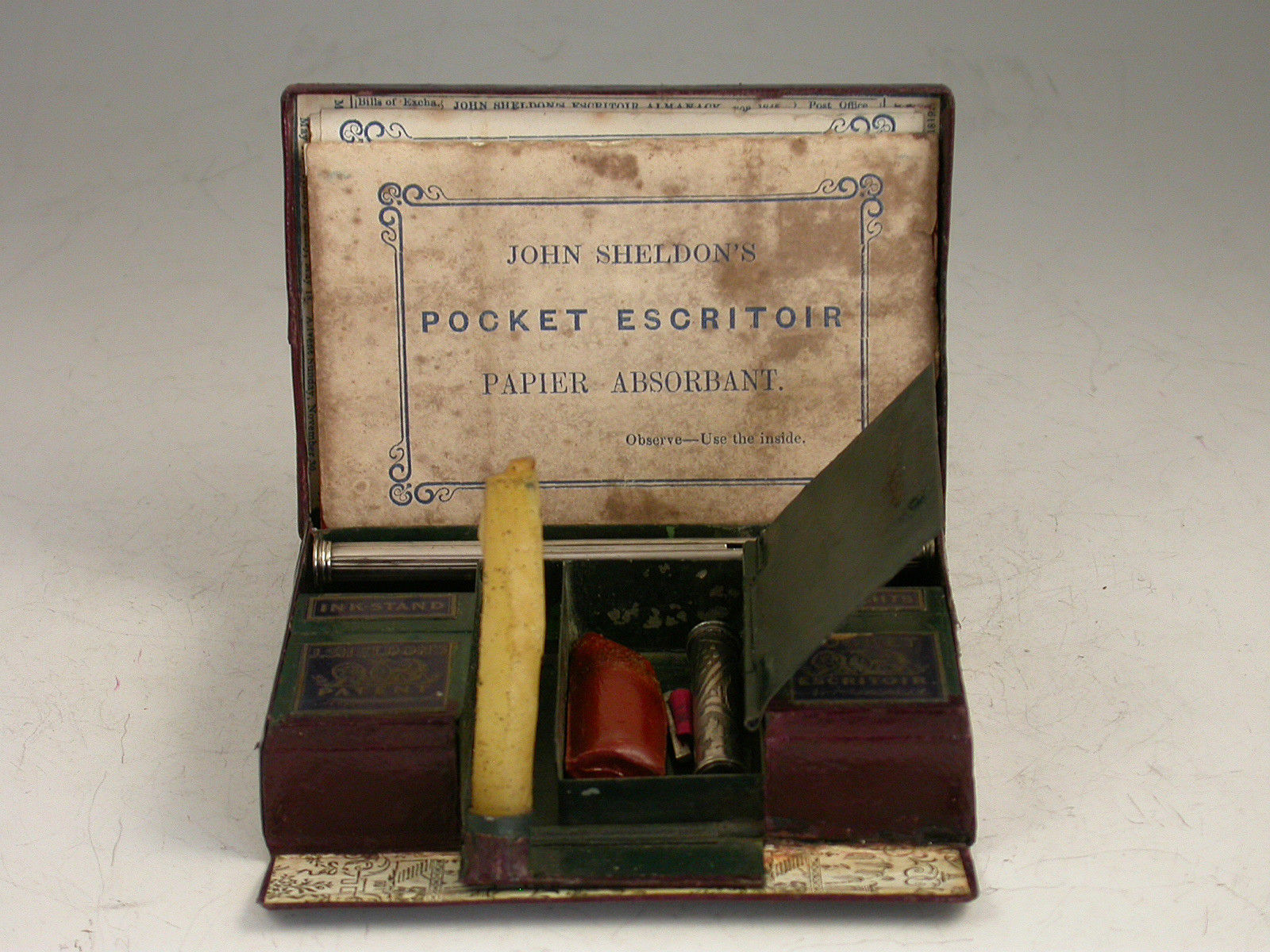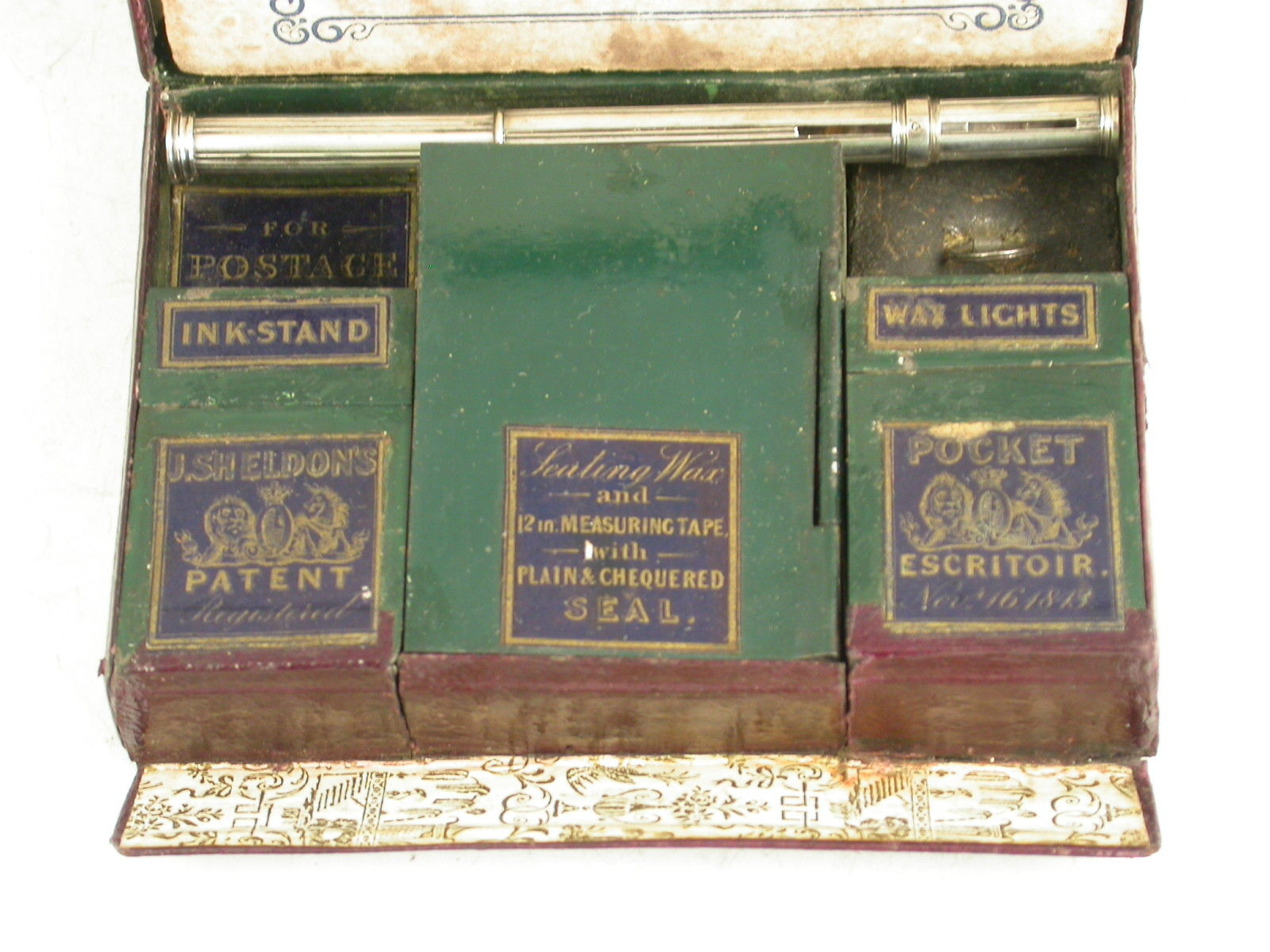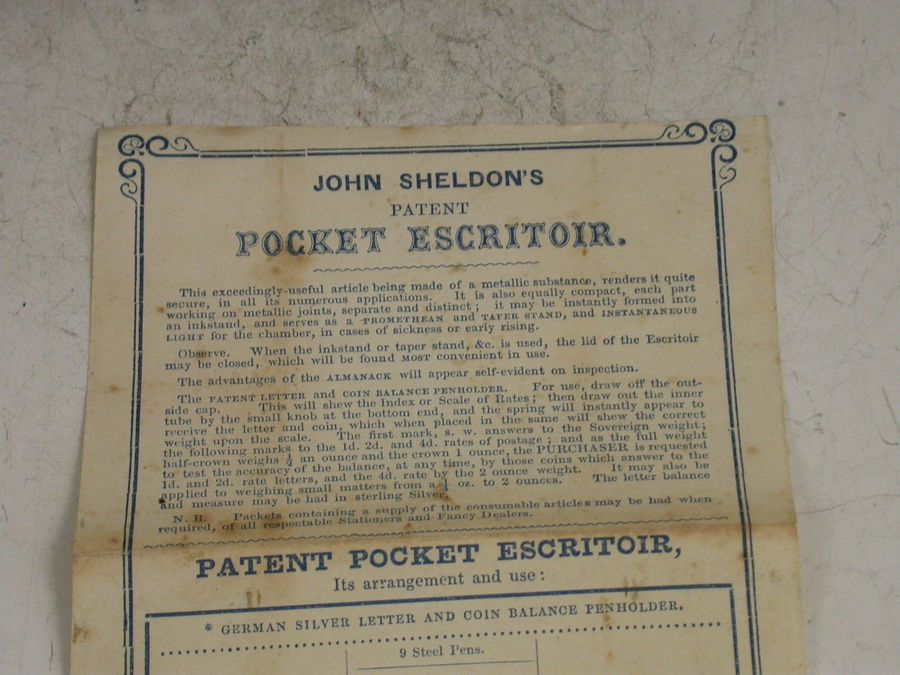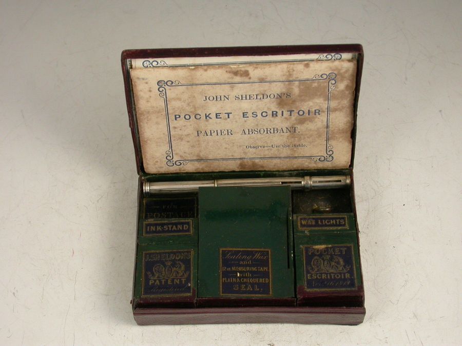 A rare leather cased metal Patent Pocket Escritoir, the tooled burgundy leather case with gilt lettering and the Royal Coat of Arms, a further outer case also with tooled gilt decoration. The lid with applied Sheldon Escritoir Almanack for 1845. The fitted interior with folding Inkstand and wax light containers, a folding taper stick, a hinged centre compartment with applied label containing sealing wax and a Sheldon's 12 inch measuring tape with plain and chequered seal, with further apertures for postage stamps, pens, gum or other wafer seals and the original Sheldon's German Silver combined Dip Pen / sprung coin and letter scale. Complete with original Blotting Card and instructions leaflet.