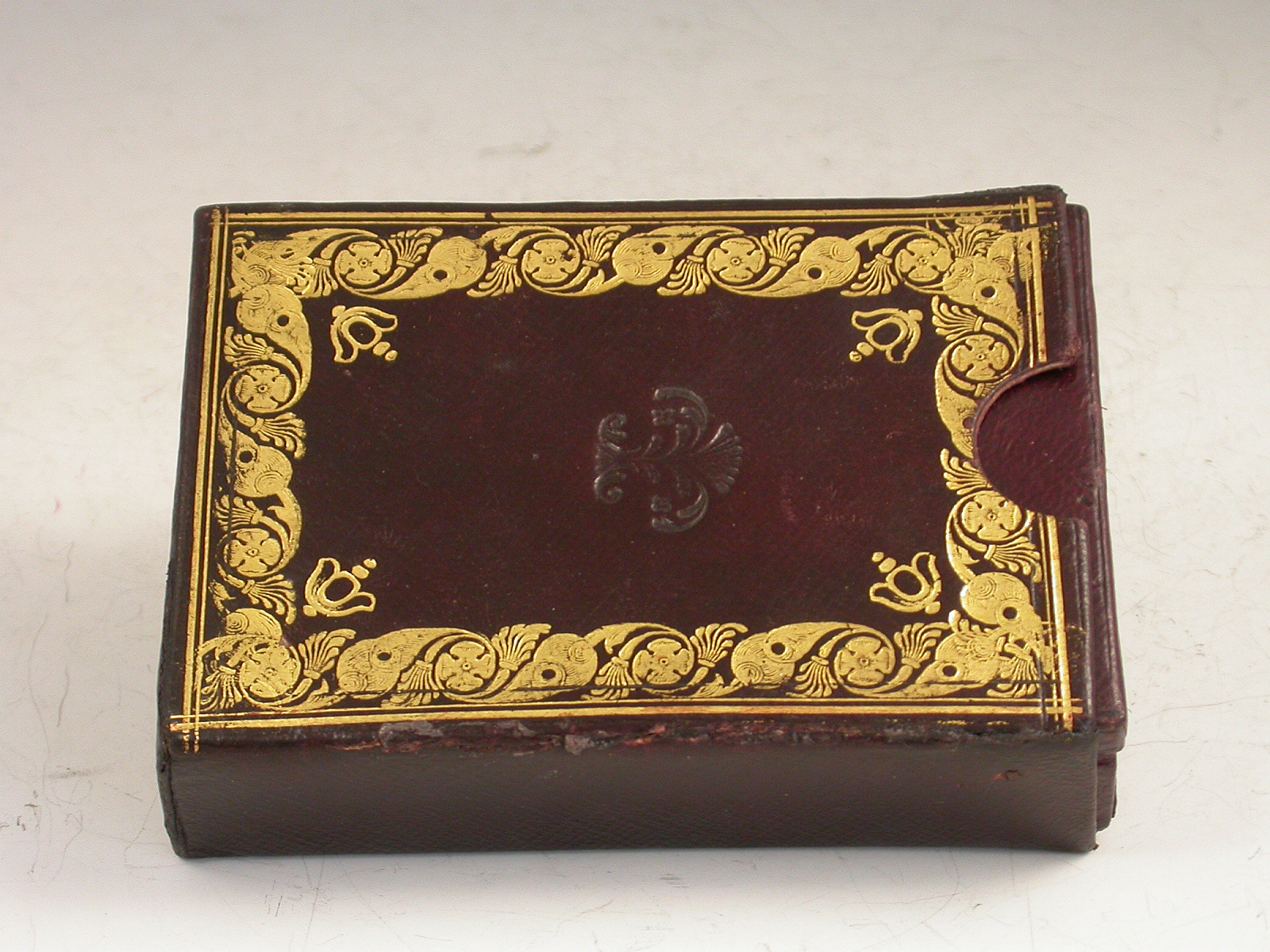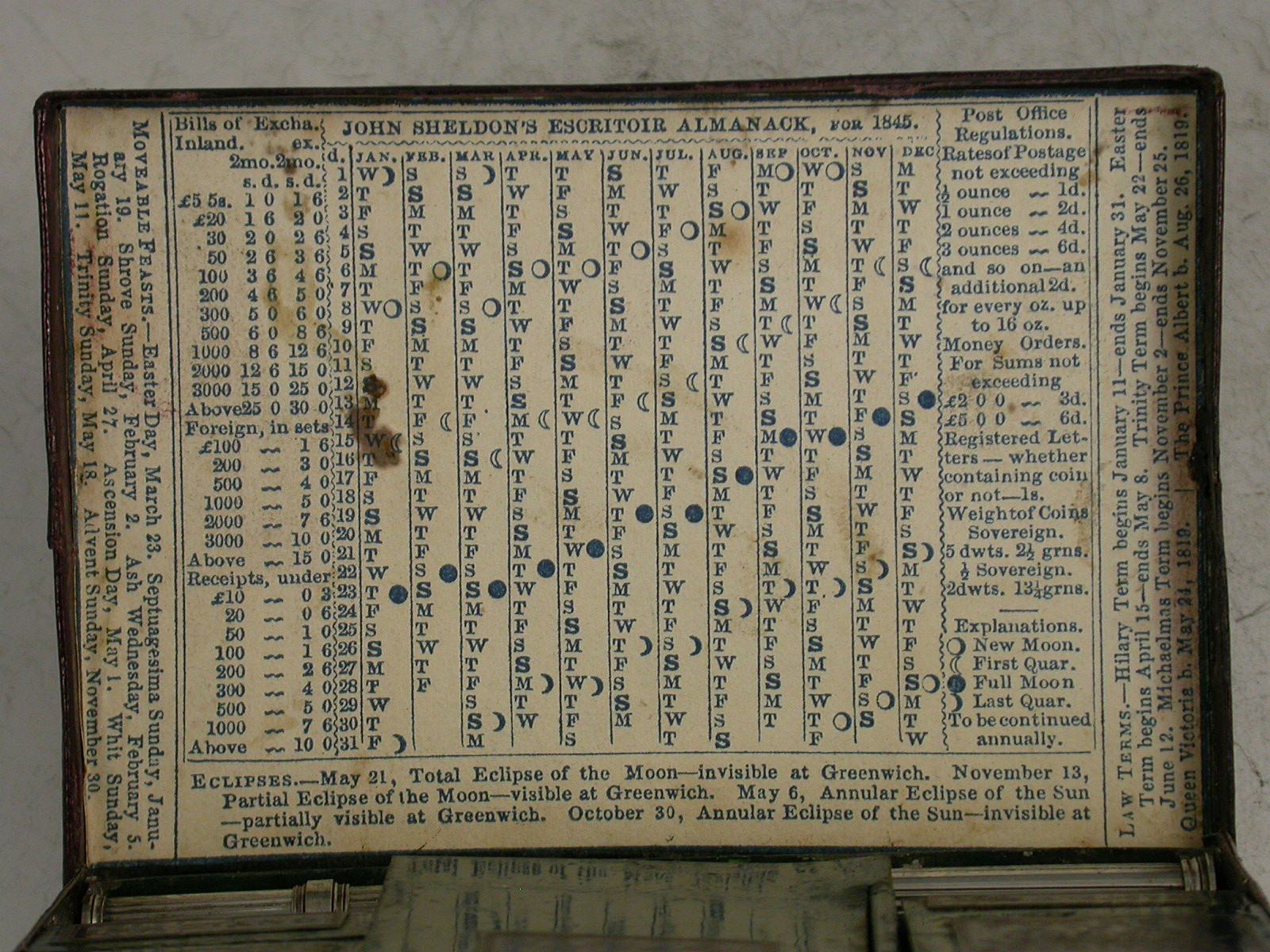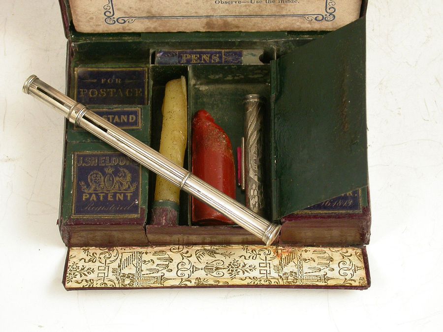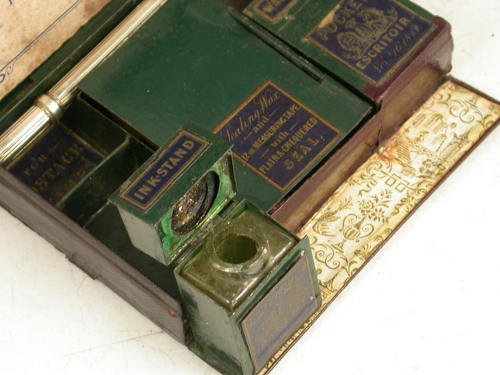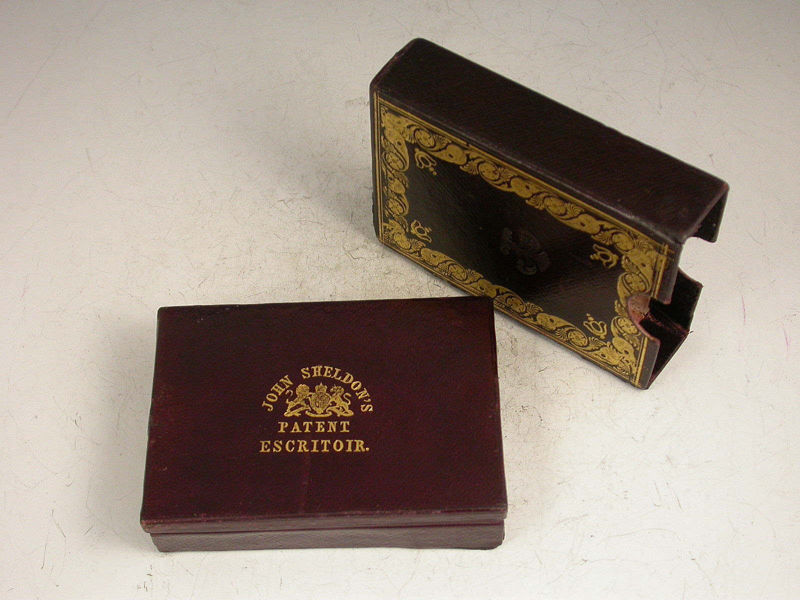 A rare leather cased metal Patent Pocket Escritoir, the tooled burgundy leather case with gilt lettering and the Royal Coat of Arms, a further outer case also with tooled gilt decoration. The lid with applied Sheldon Escritoir Almanack for 1845. The fitted interior with folding Inkstand and wax light containers, a folding taper stick, a hinged centre compartment with applied label containing sealing wax and a Sheldon's 12 inch measuring tape with plain and chequered seal, with further apertures for postage stamps, pens, gum or other wafer seals and the original Sheldon's German Silver combined Dip Pen / sprung coin and letter scale. Complete with original Blotting Card and instructions leaflet.