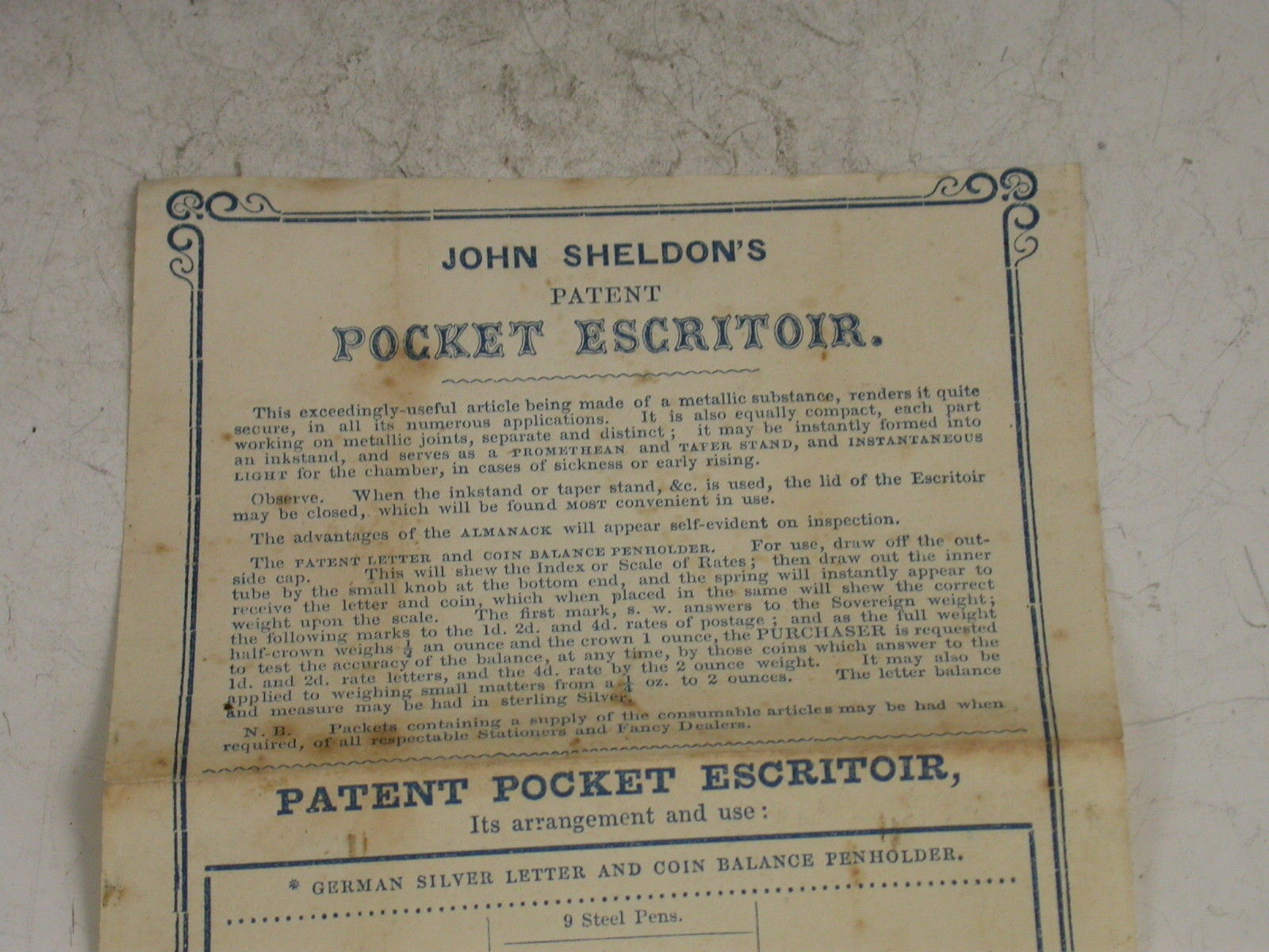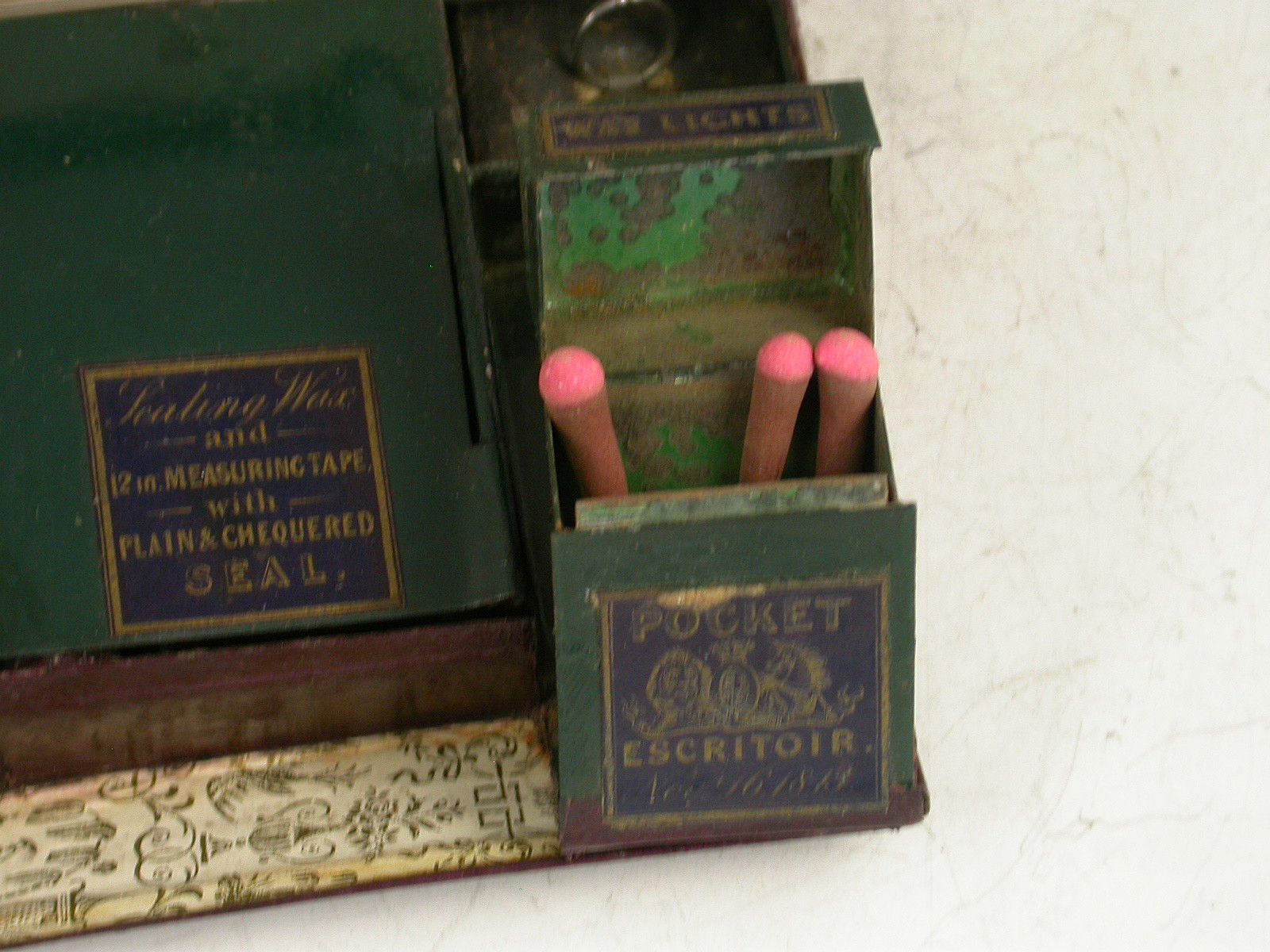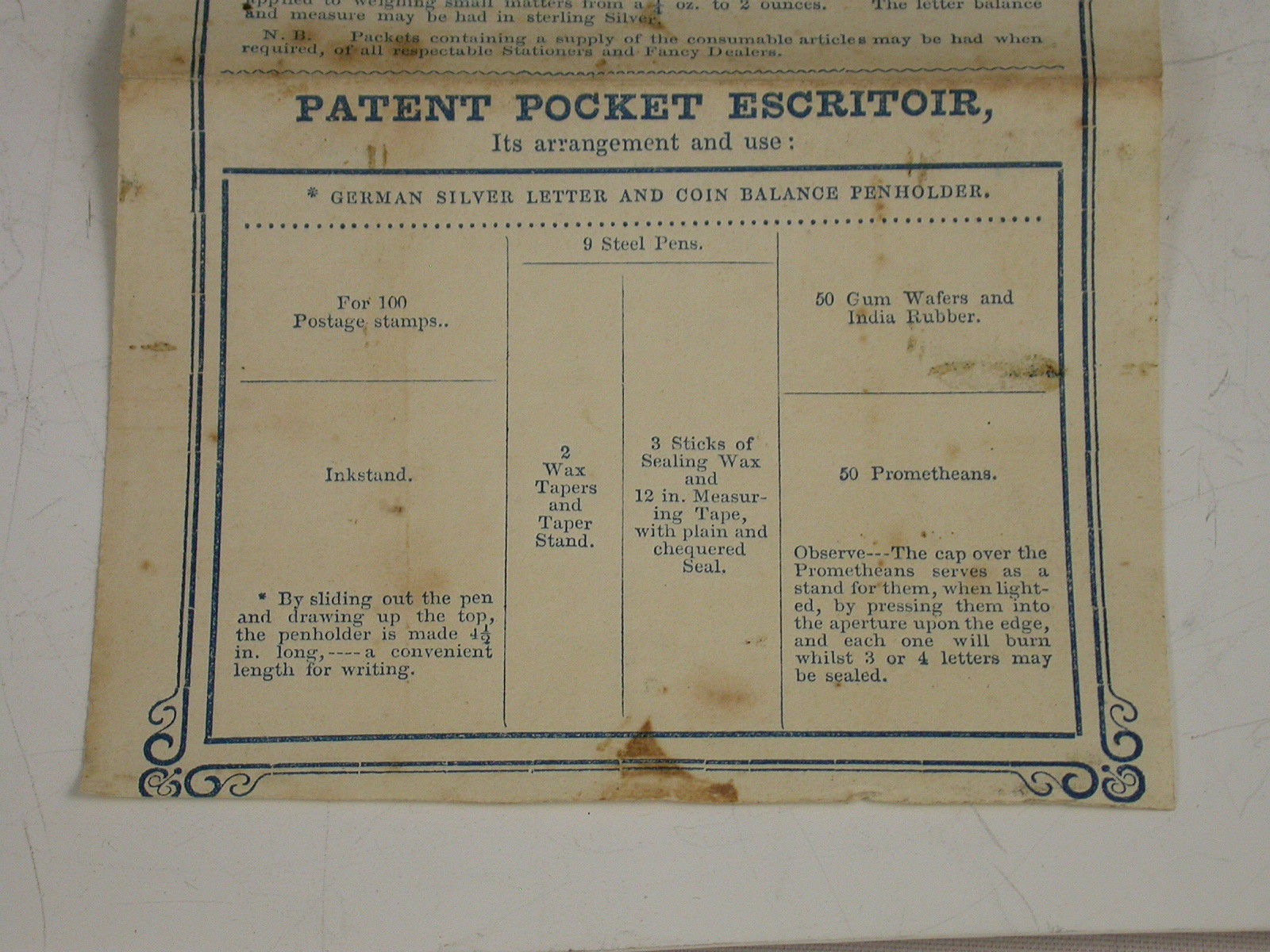 Postage Stamps. Steel Pens. Gum Wafers and India Rubber.Inkstand. Wax Tapers and Taper Stand. Sticks of Sealing Wax and 12in Measuring Tape with plain and chequered Seal. Prometheans.
