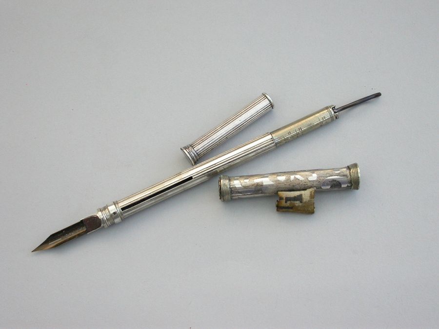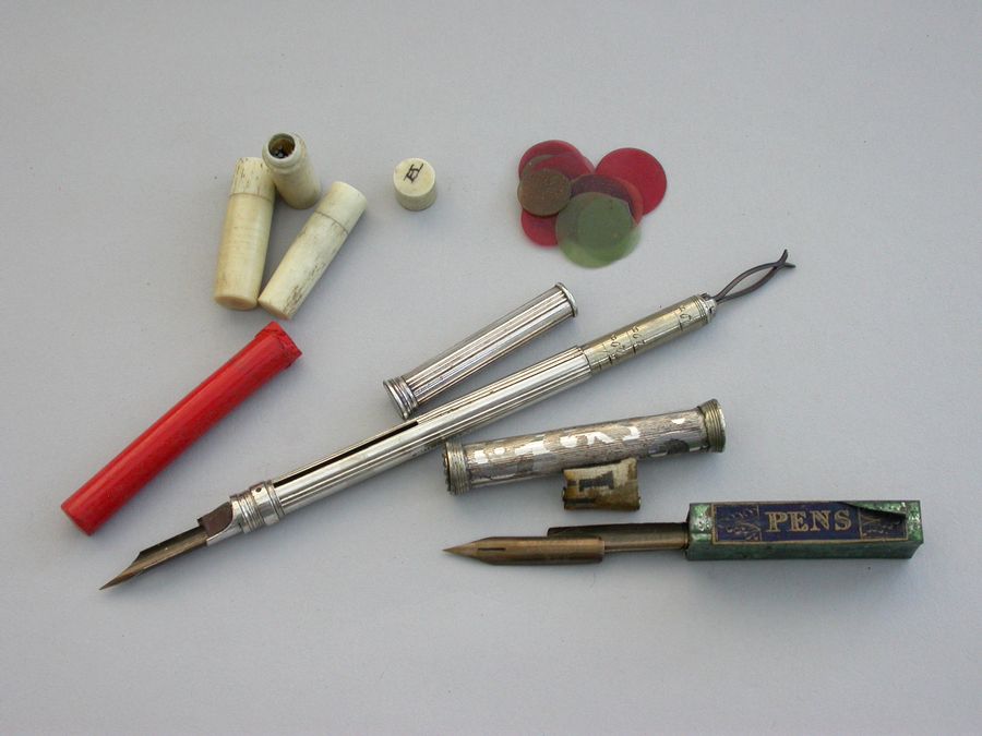 Postage Stamps. Steel Pens. Gum Wafers and India Rubber.Inkstand. Wax Tapers and Taper Stand. Sticks of Sealing Wax and 12in Measuring Tape with plain and chequered Seal and Prometheans. There are three additional contemporary screw-top bone spare lead holders added to this example.