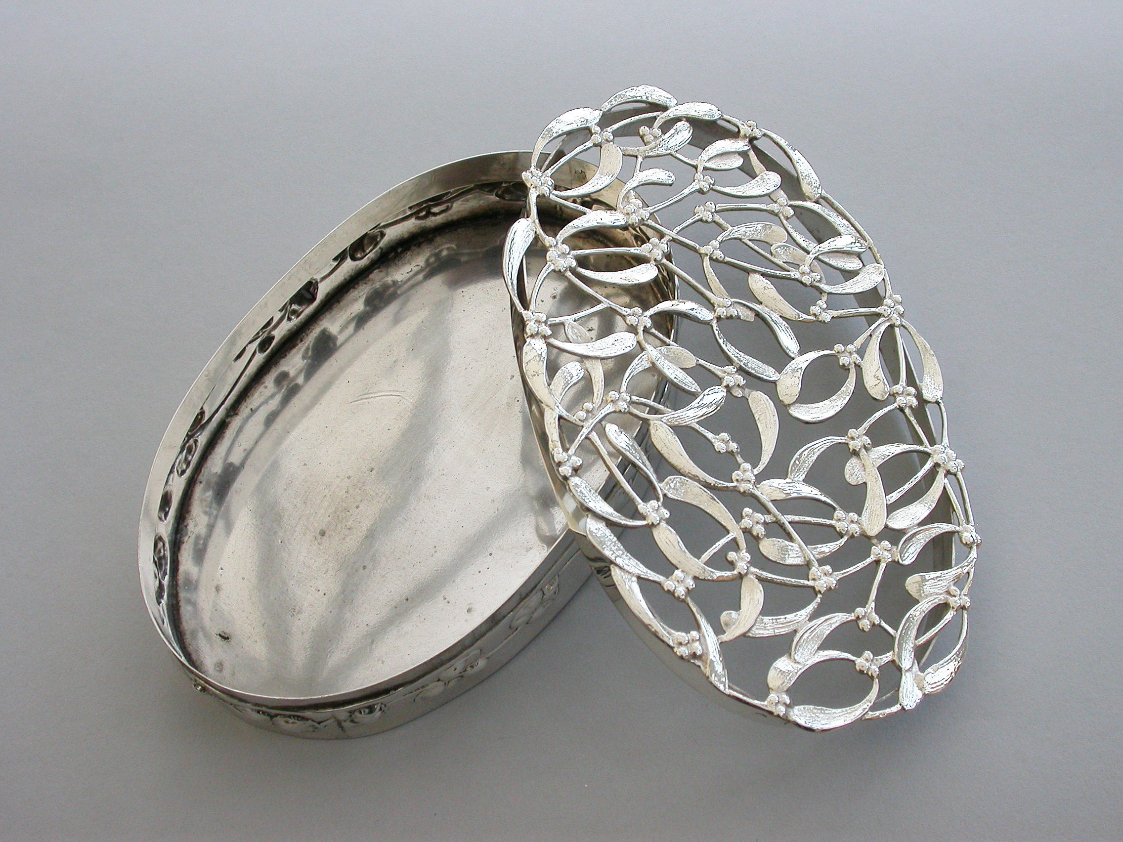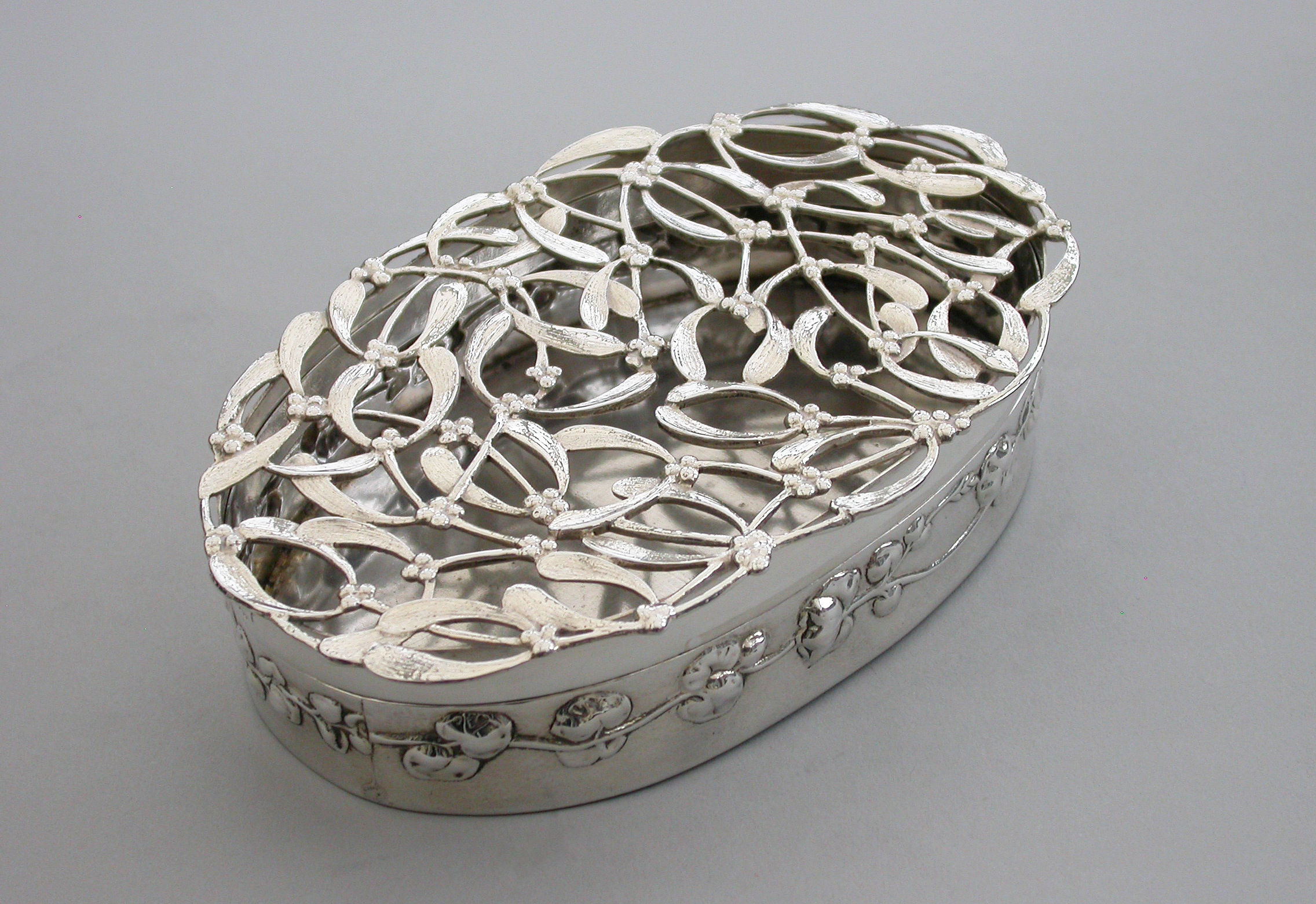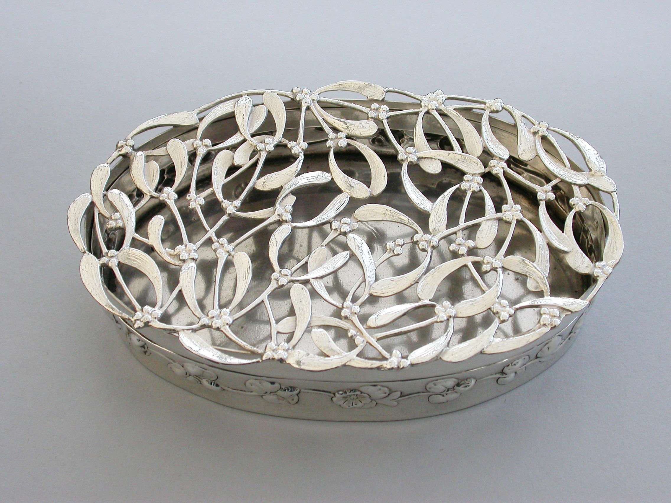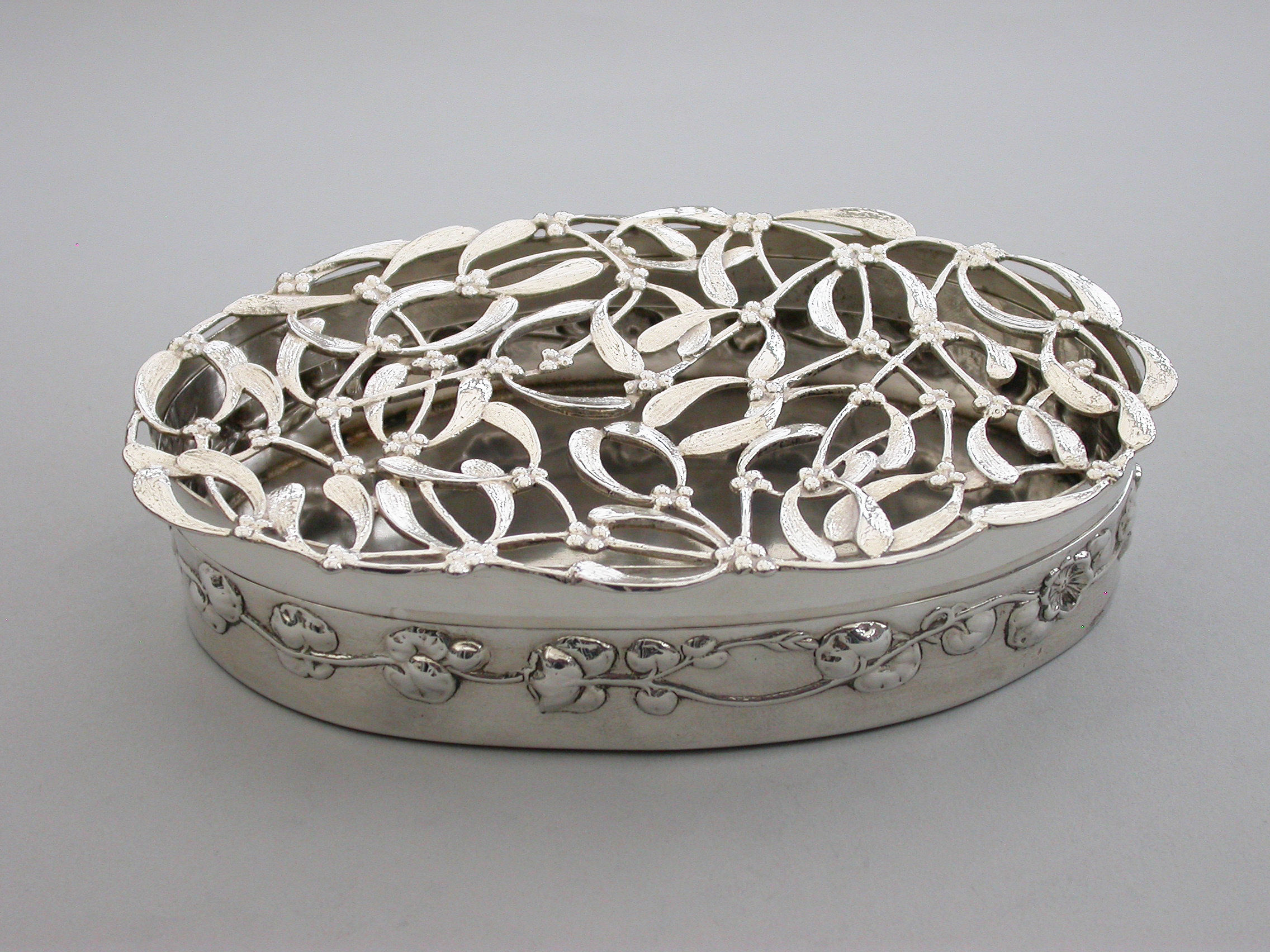 A large Edwardian Art Nouveau silver Christmas themed Pot Pourri Box of oval form with pull-off cover, the base embossed with a band of trailing convolvulus flowers. The cover with pierced top depicting fronds of mistletoe.