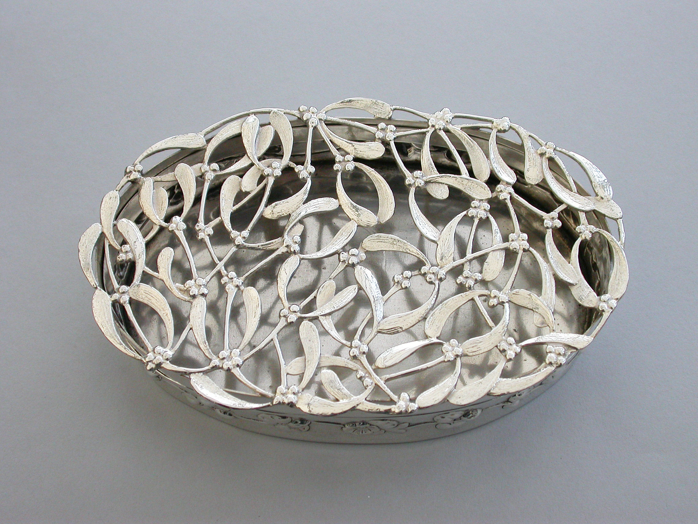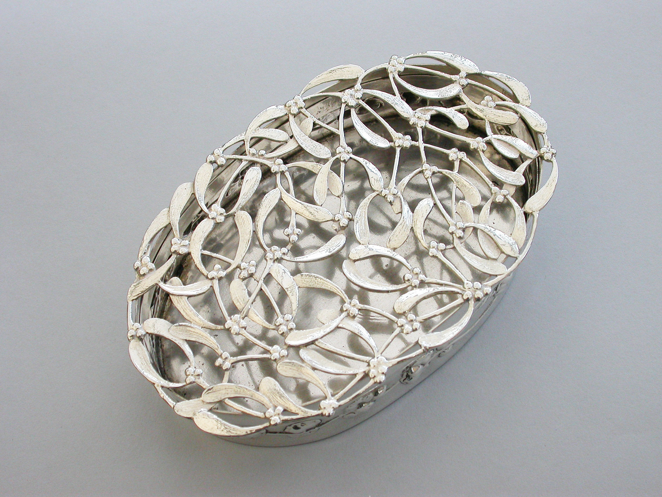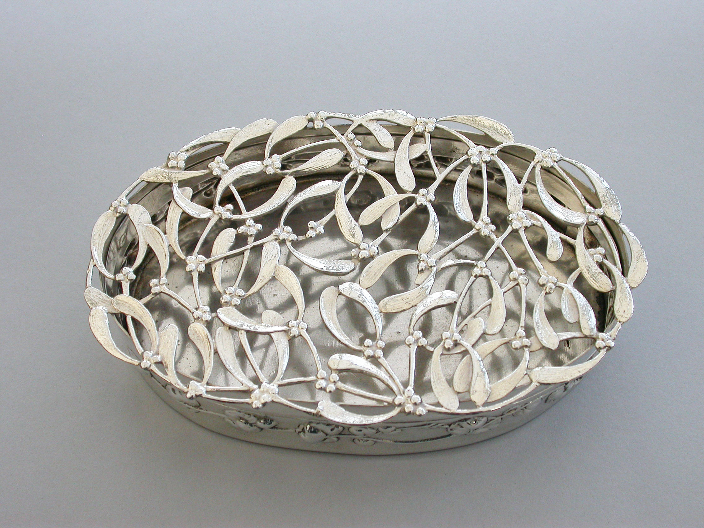 A large Edwardian Art Nouveau silver Christmas themed Pot Pourri Box of oval form with pull-off cover, the base embossed with a band of trailing convolvulus flowers. The cover with pierced top depicting fronds of mistletoe.