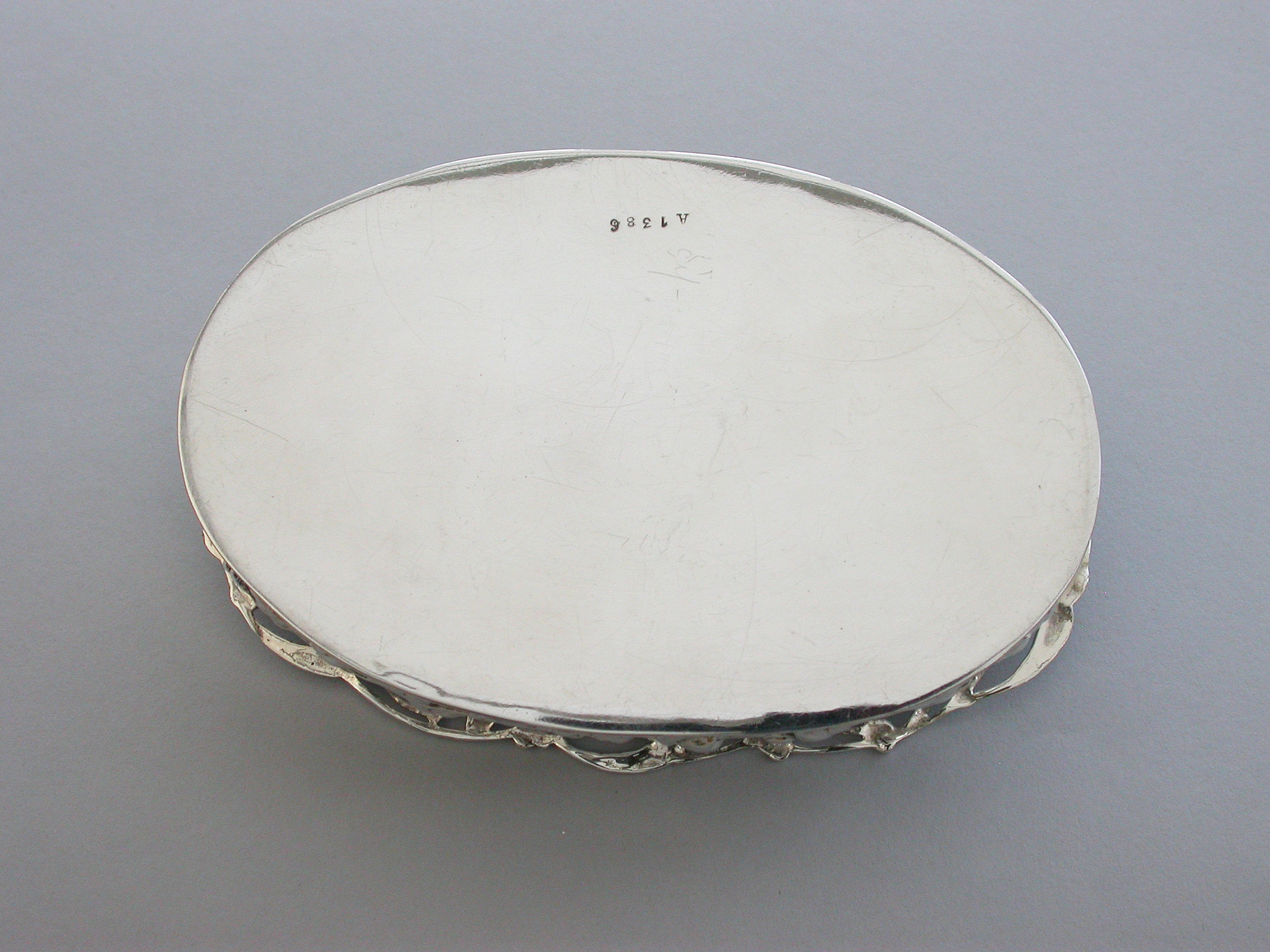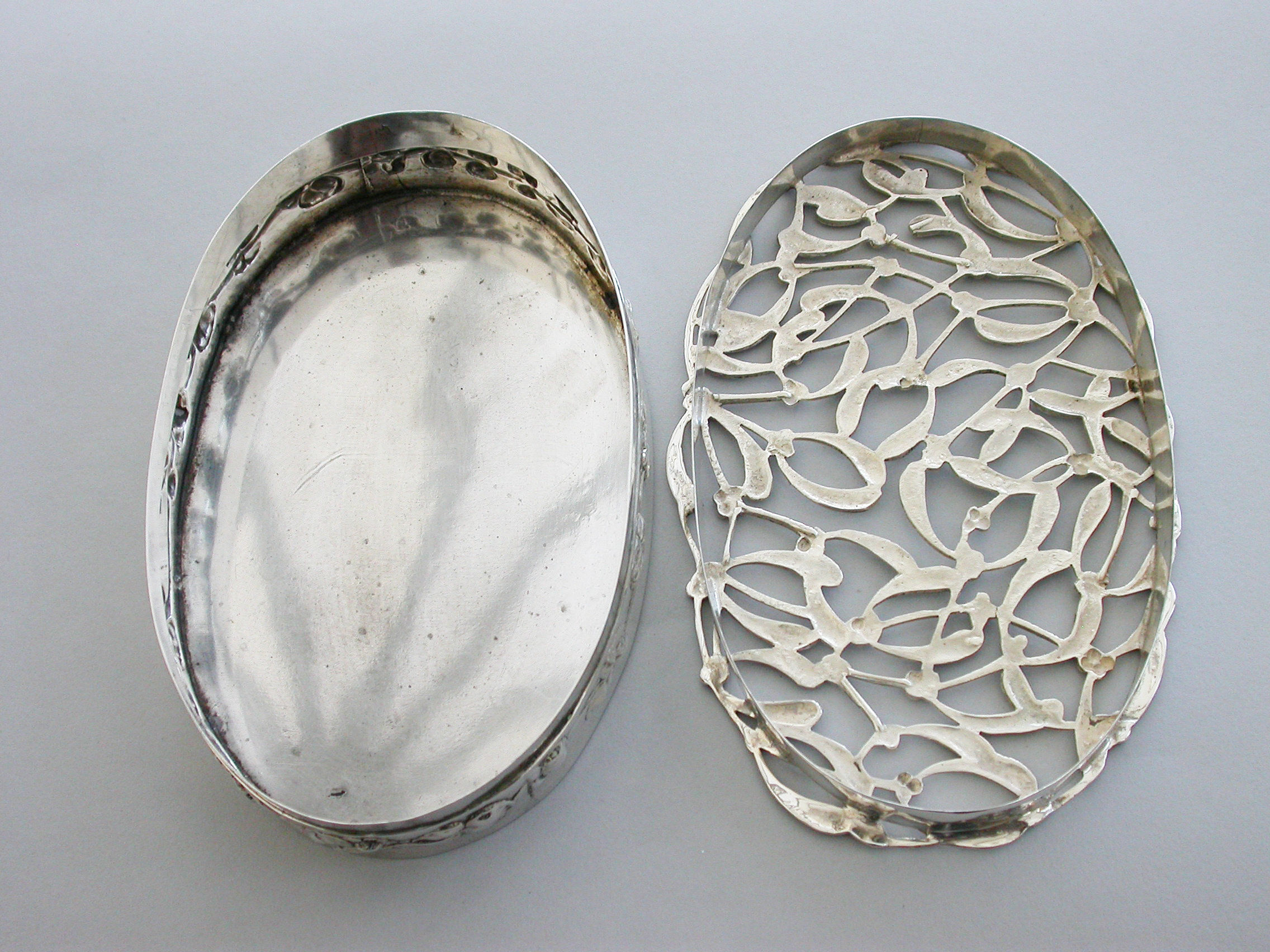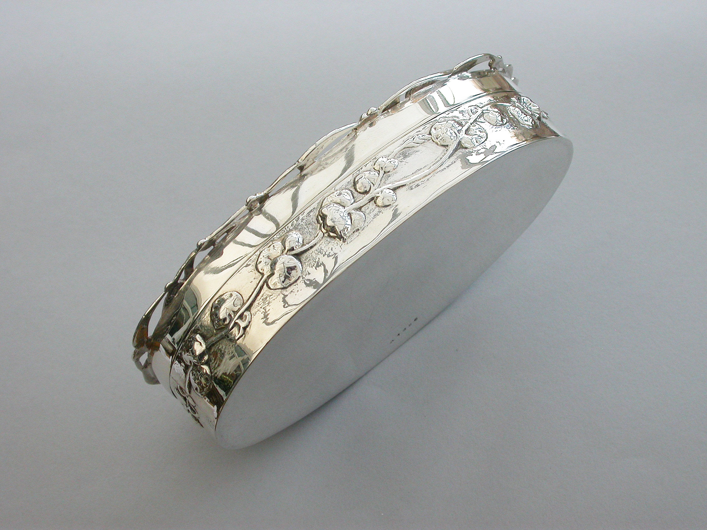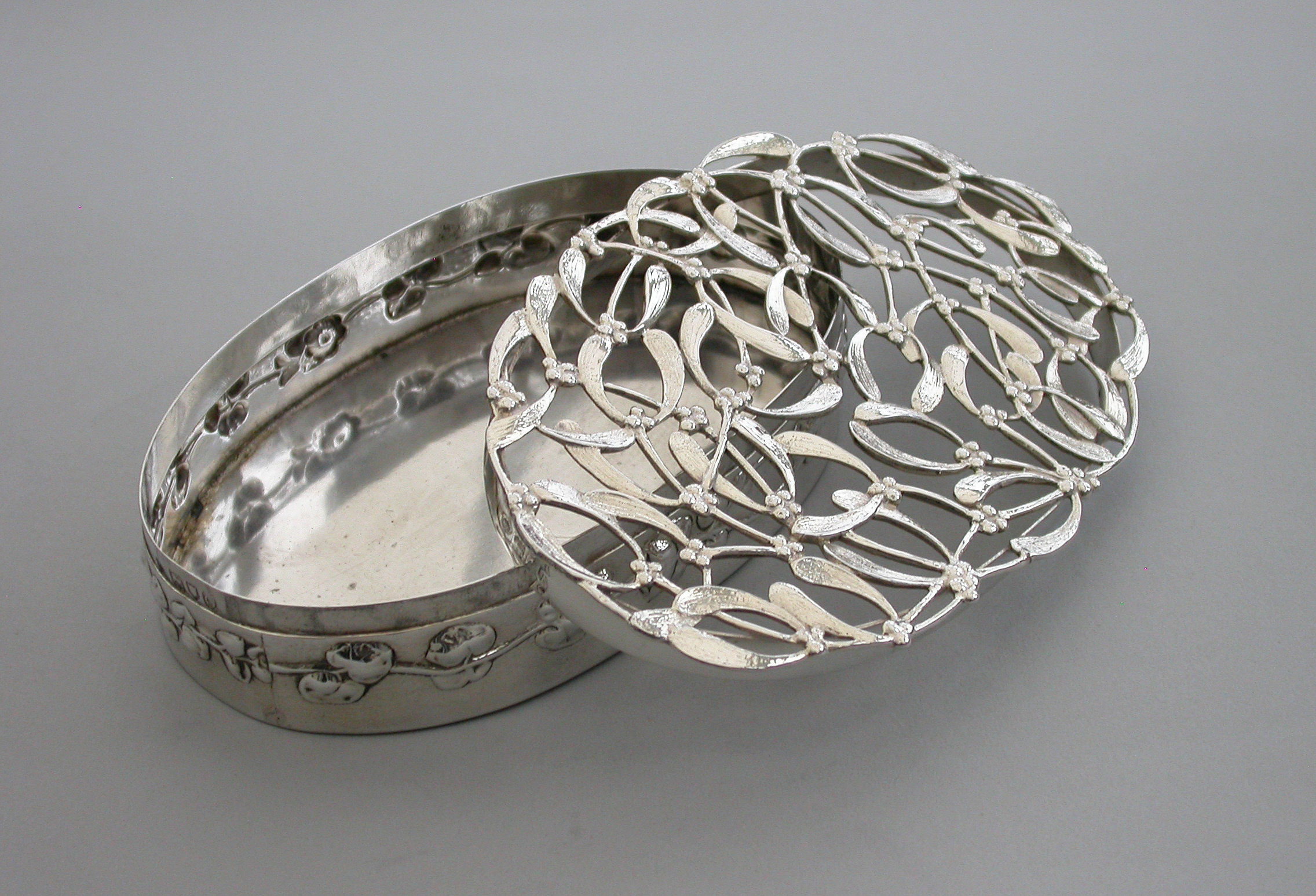 A large Edwardian Art Nouveau silver Christmas themed Pot Pourri Box of oval form with pull-off cover, the base embossed with a band of trailing convolvulus flowers. The cover with pierced top depicting fronds of mistletoe.