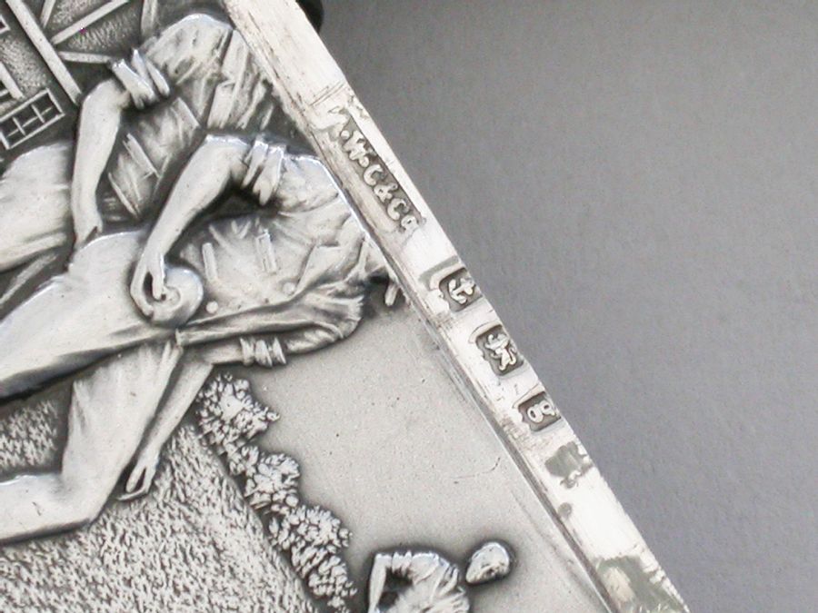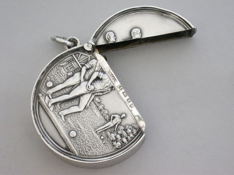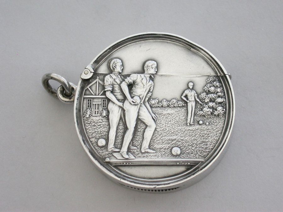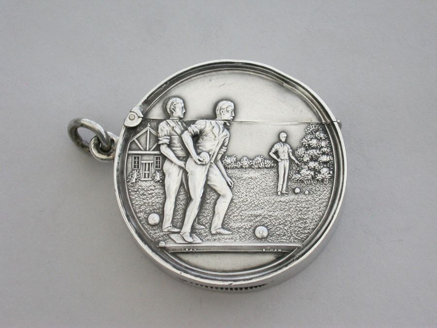 A rare large Edwardian circular silver Vesta Case with hinged flip-top lid, the face die-struck with a scene depicting three men playing bowls. A striker to the base and attached suspension ring.