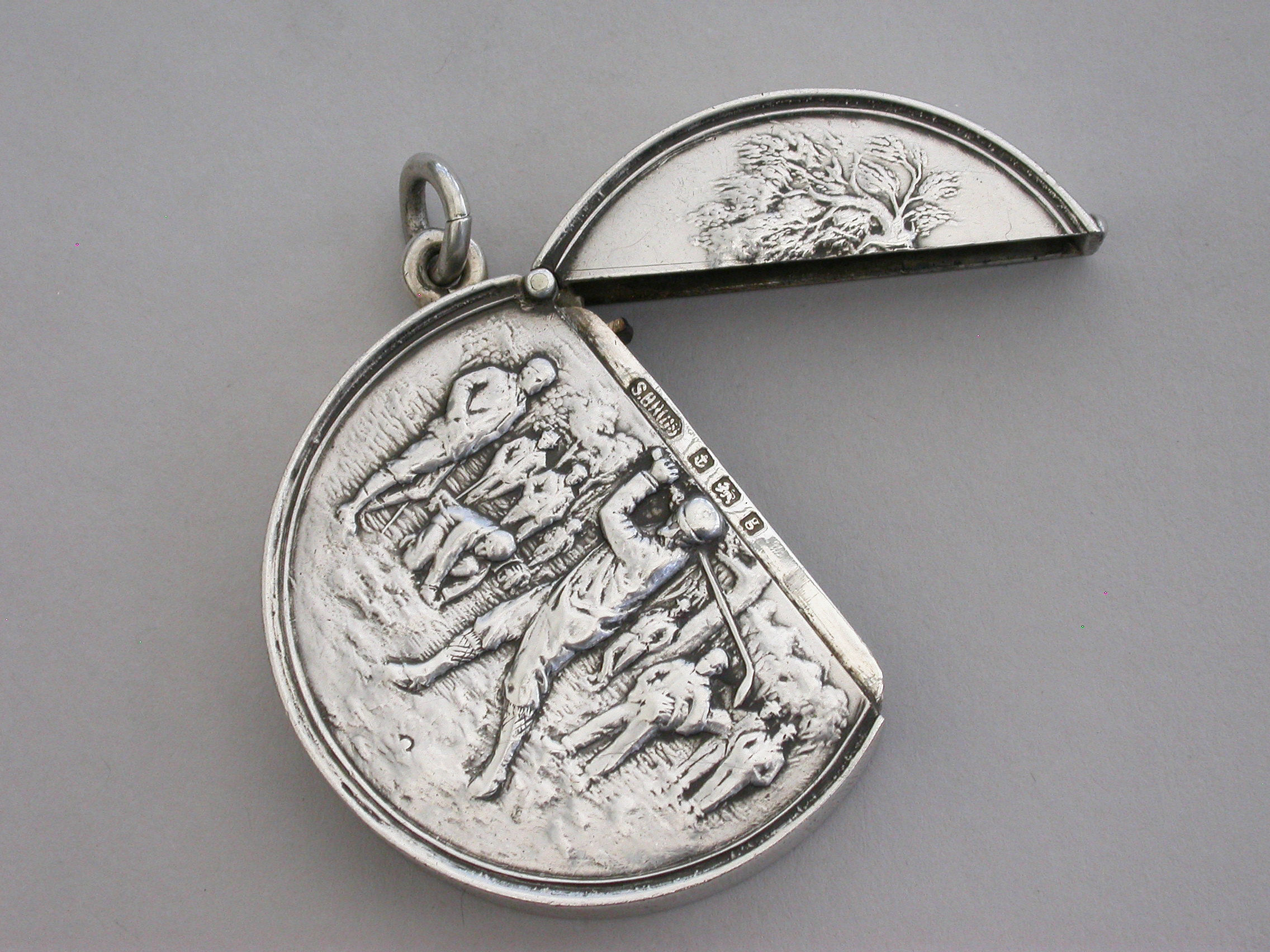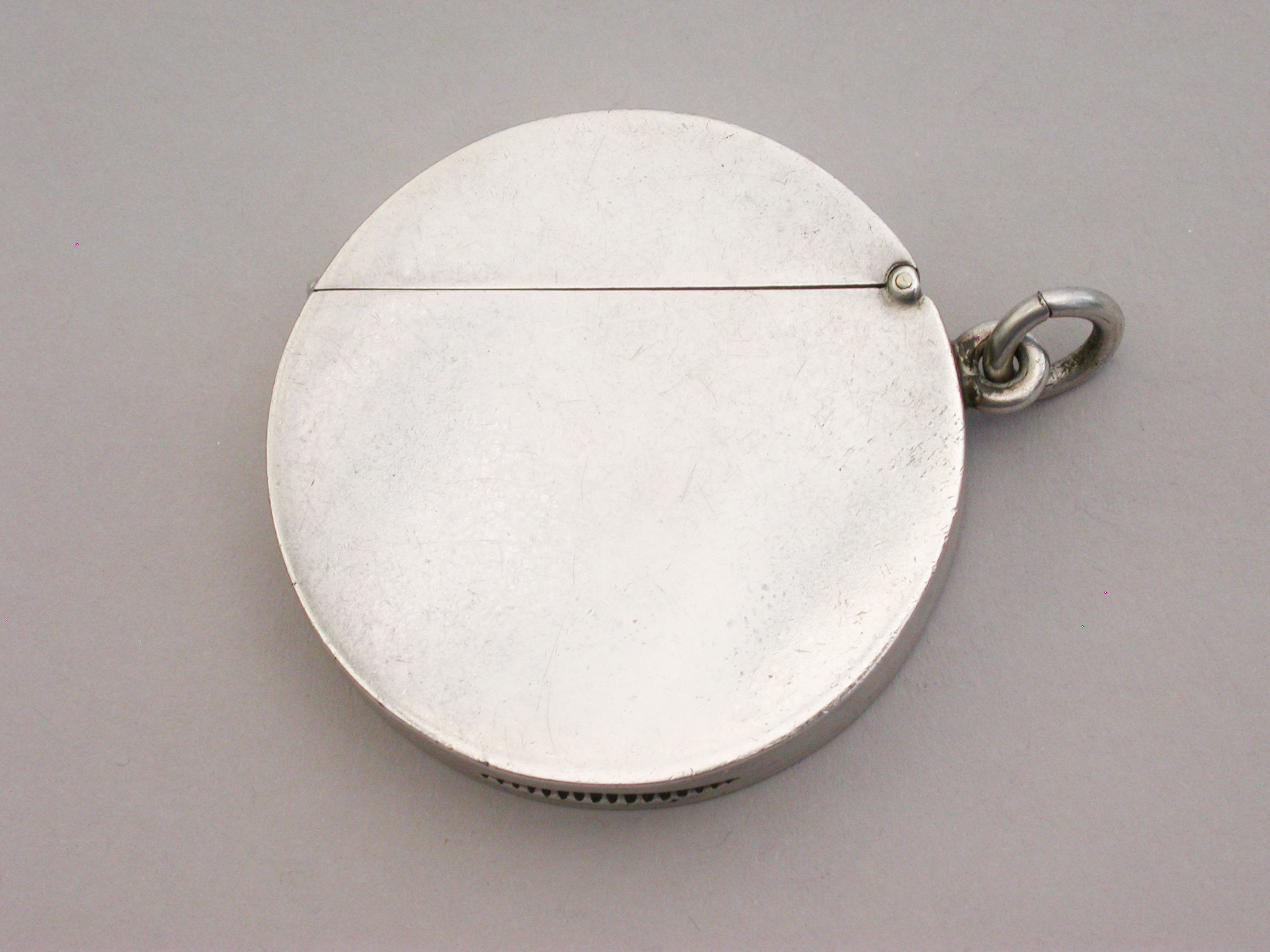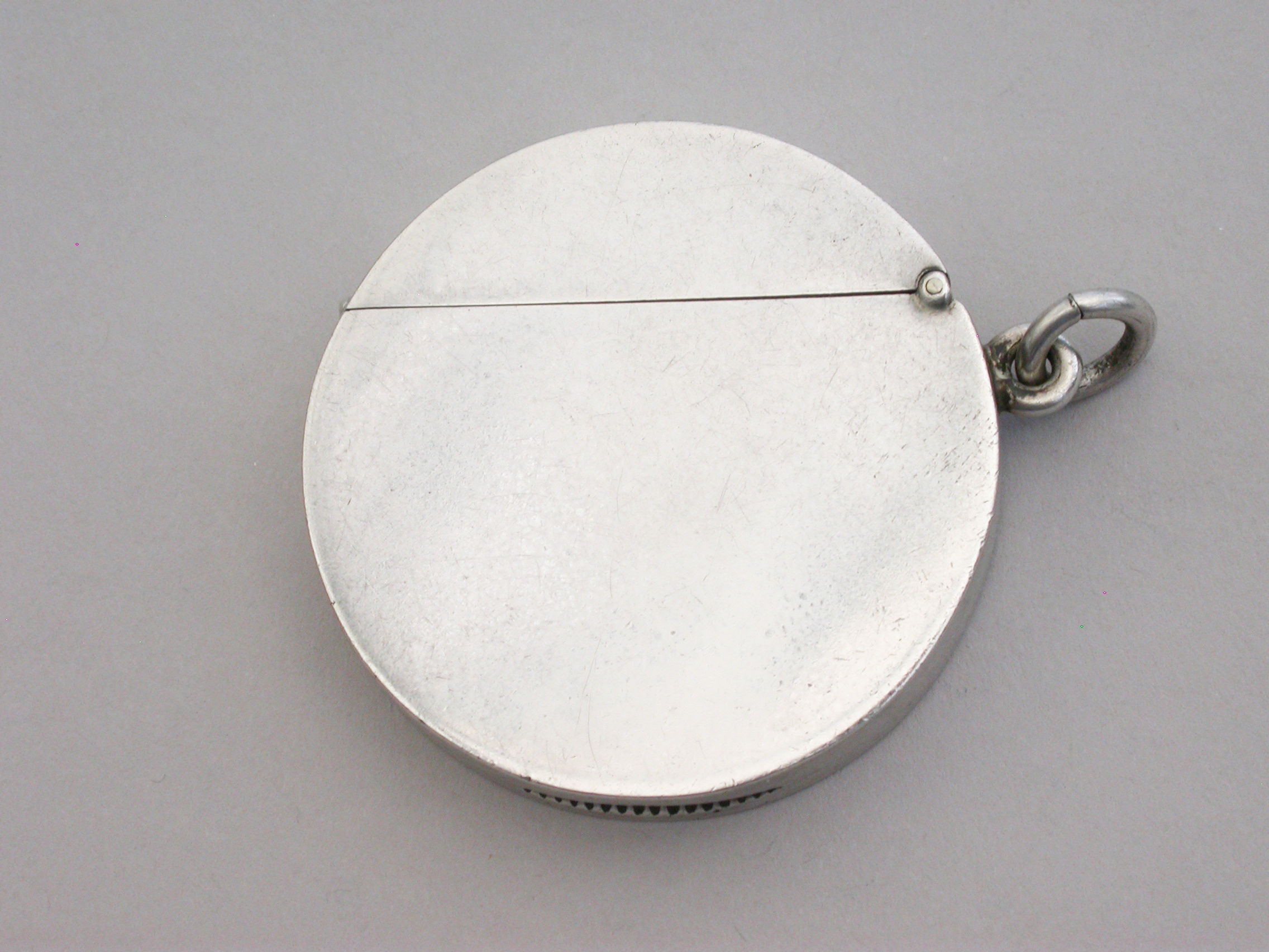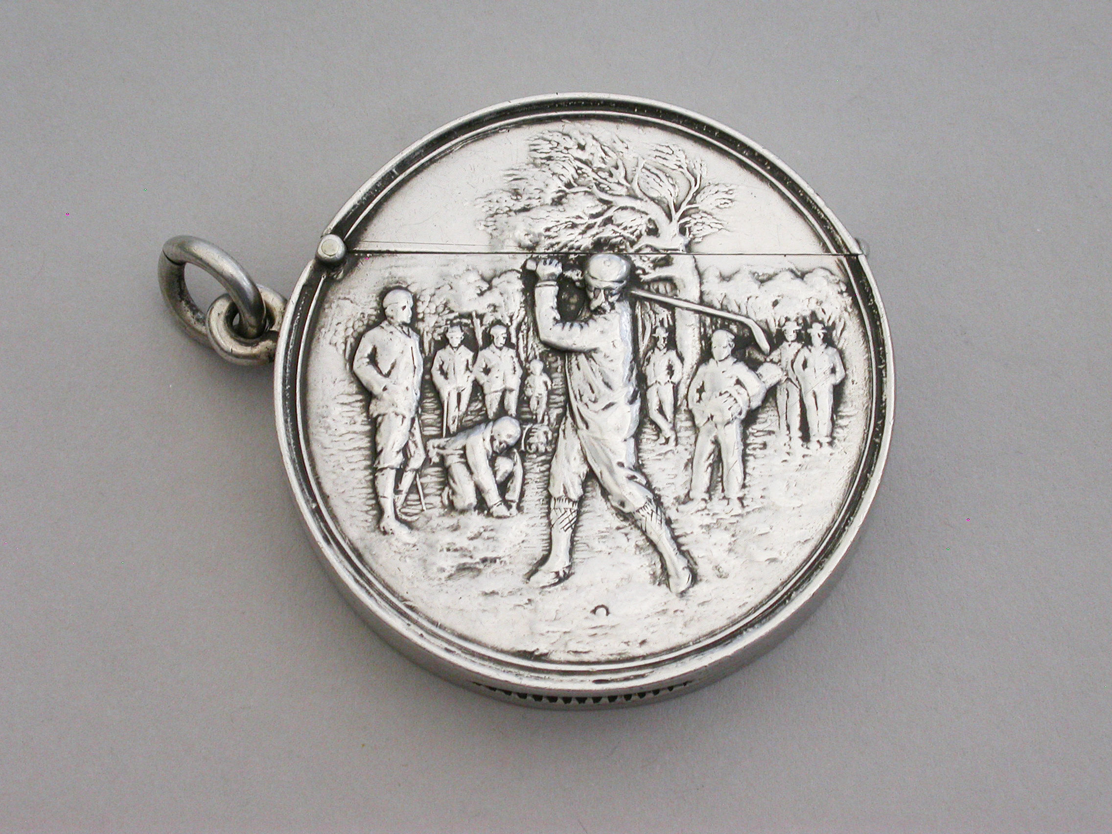 A large Edwardian circular silver Vesta Case with hinged flip-top lid, the face die-struck with a golfing scene. A striker to the base and attached suspension ring.