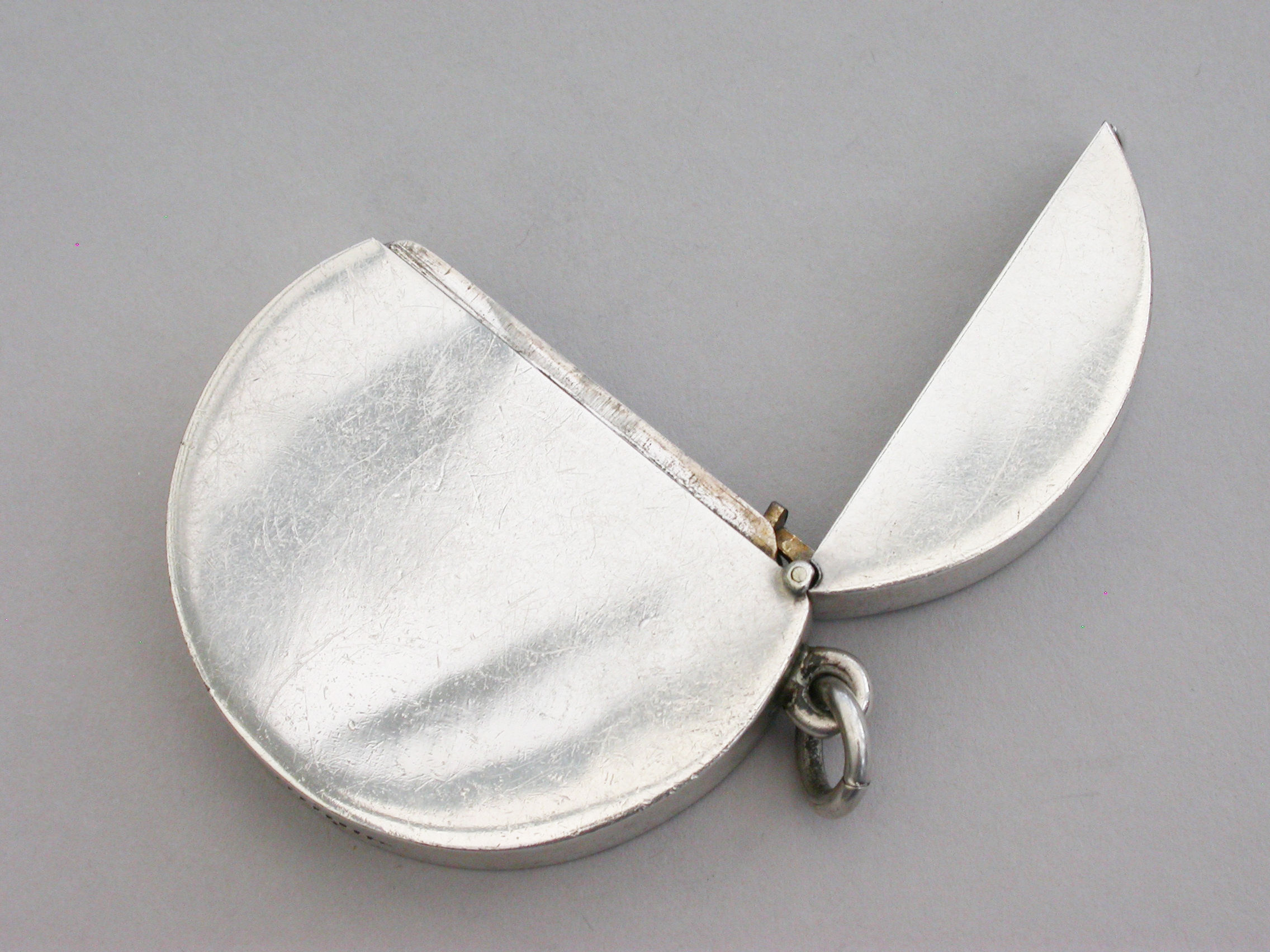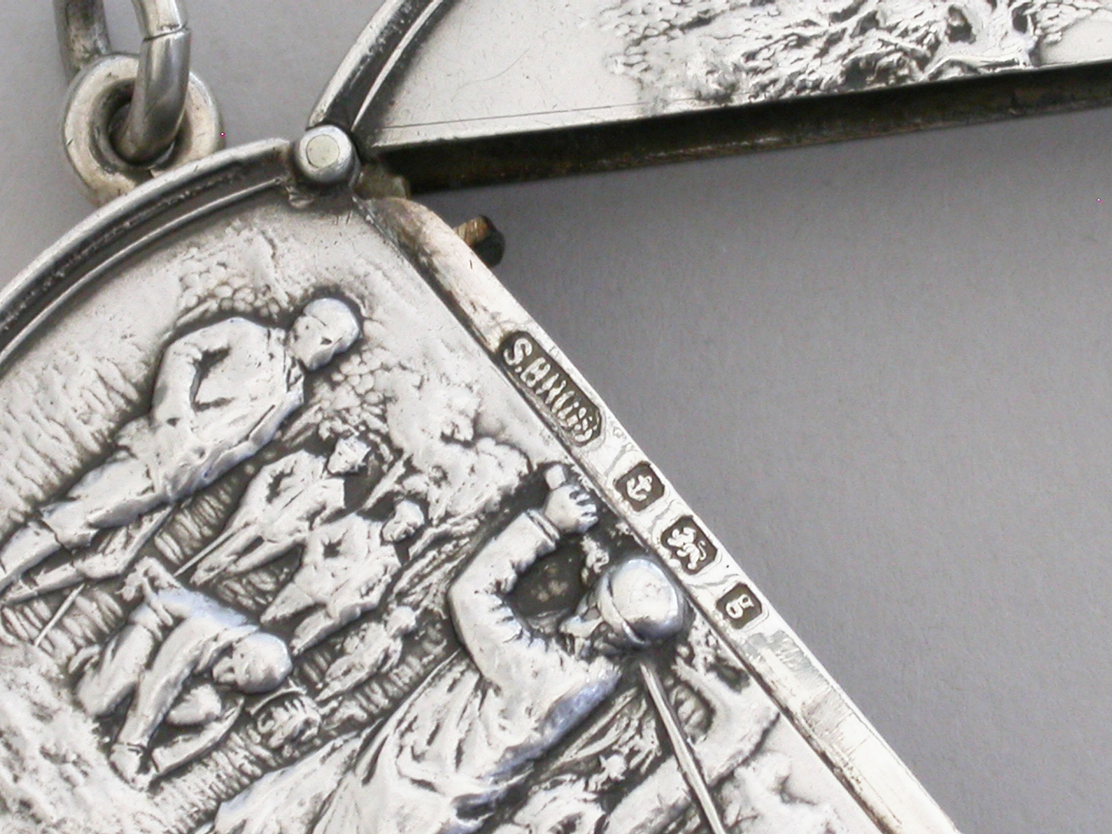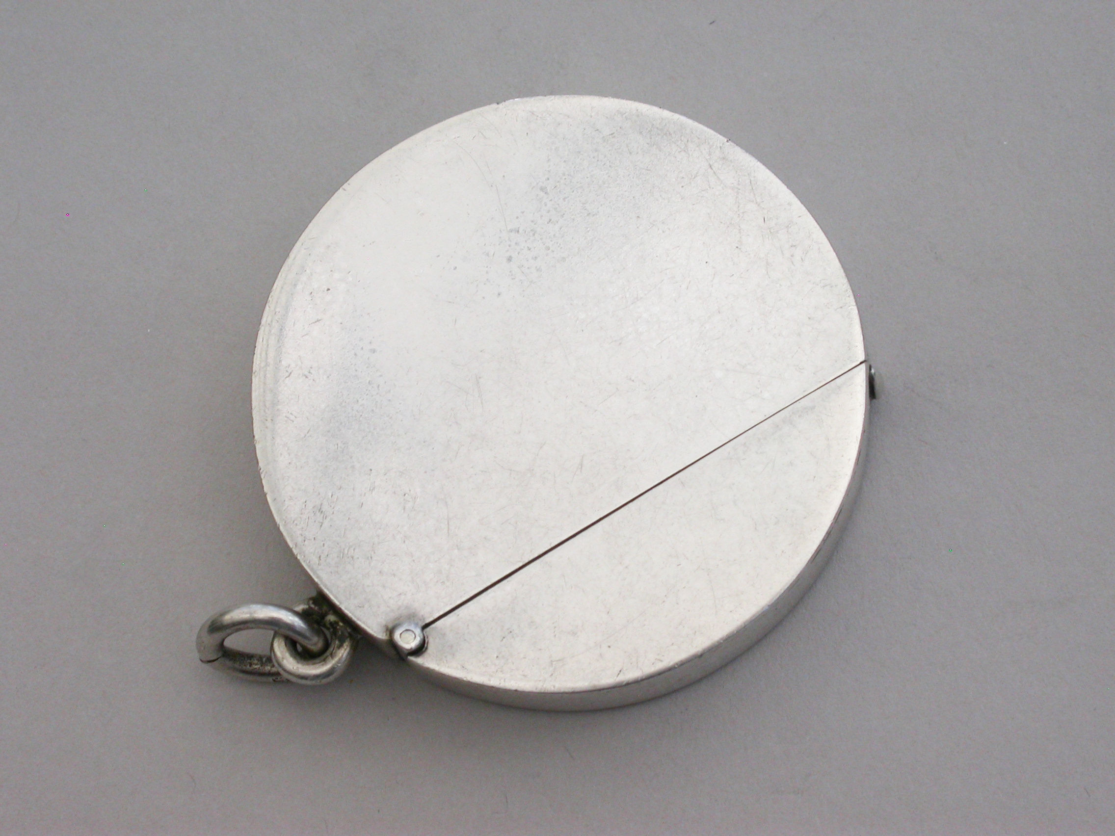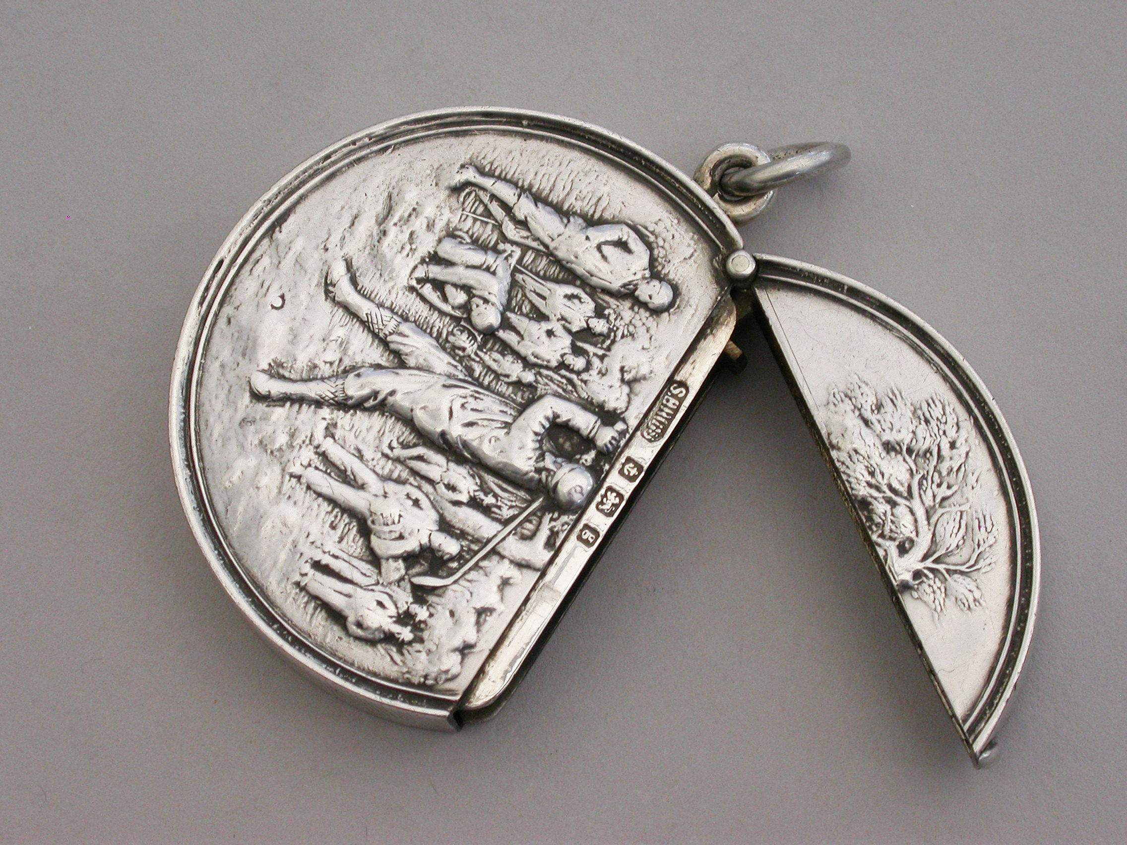 A large Edwardian circular silver Vesta Case with hinged flip-top lid, the face die-struck with a golfing scene. A striker to the base and attached suspension ring.