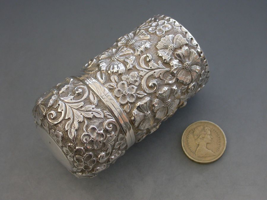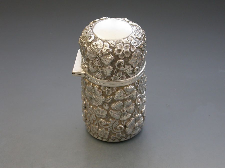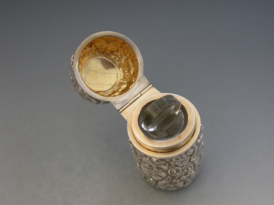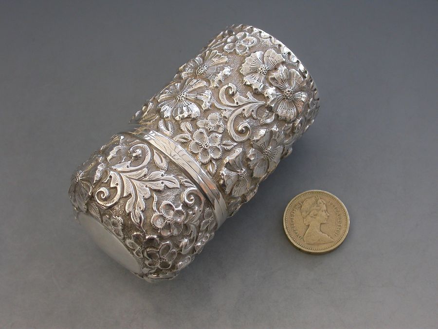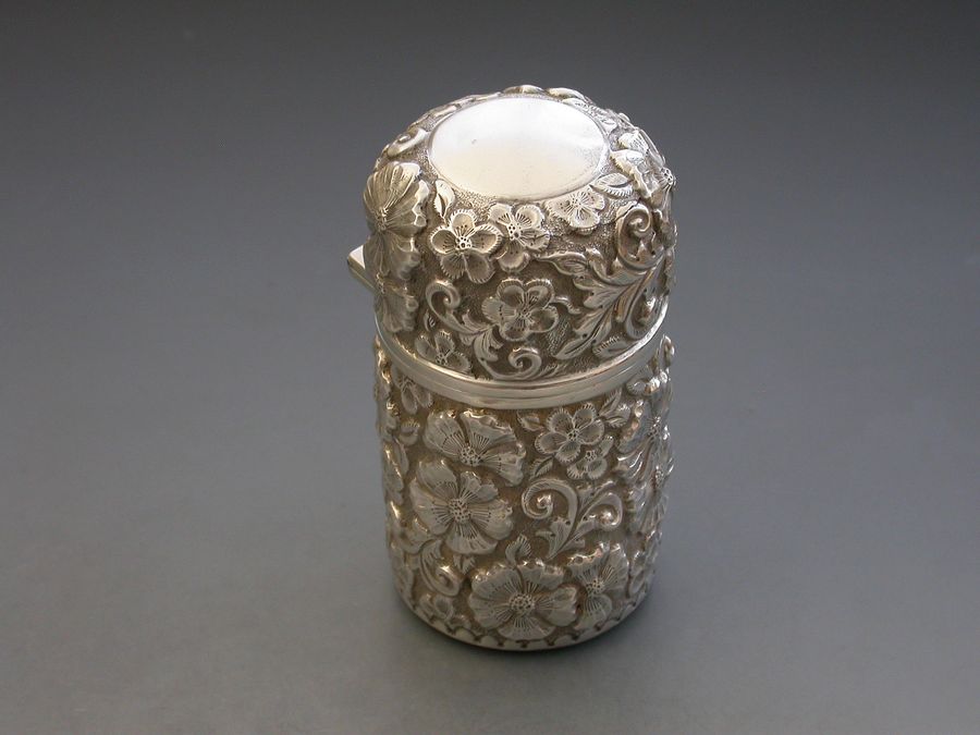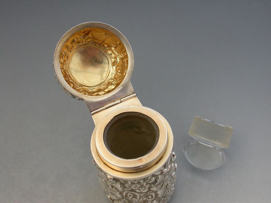 A large Edwardian silver Scent Bottle with hinged cover, glass liner and stopper, the cylindrical body chased and embossed with flower heads and scrolls. A vacant circular cartouche to the lid and silver gilt interior.