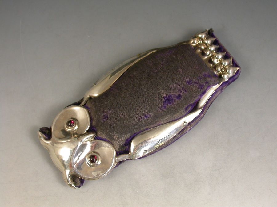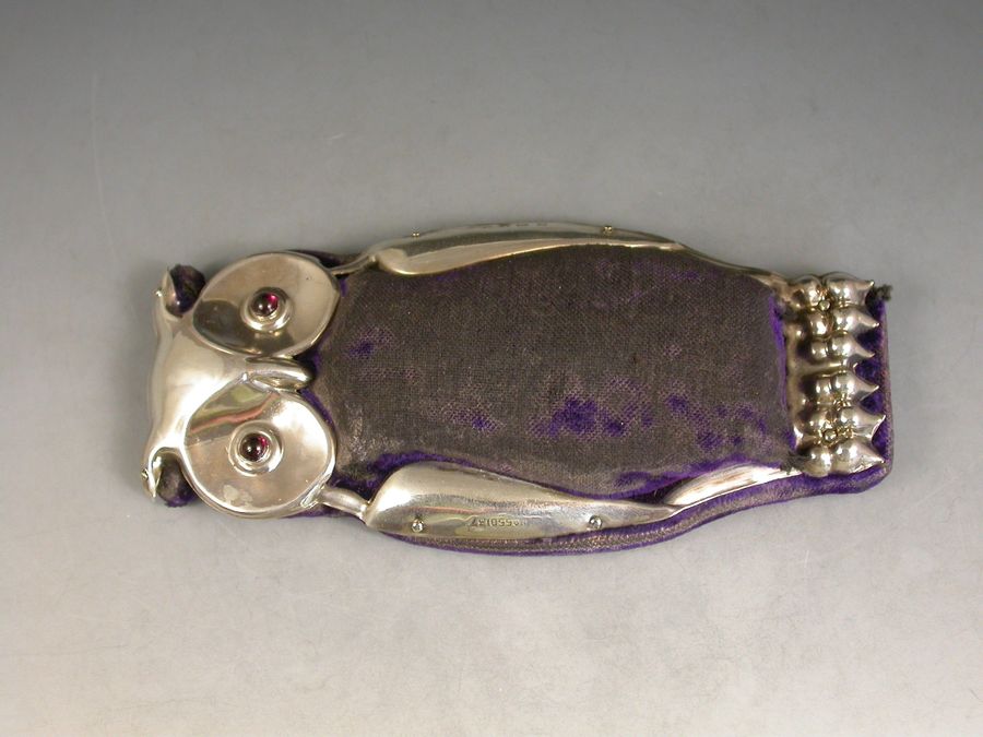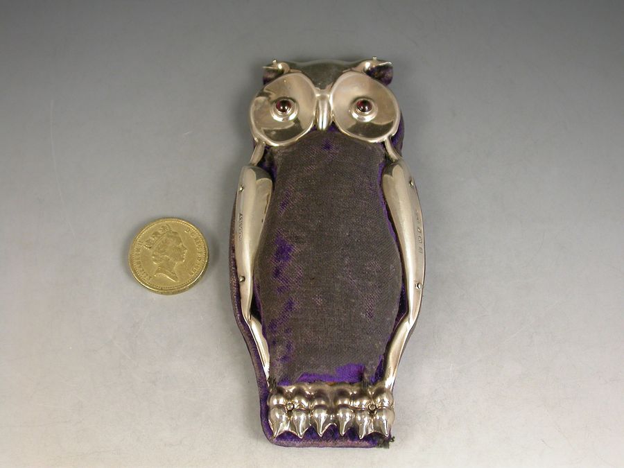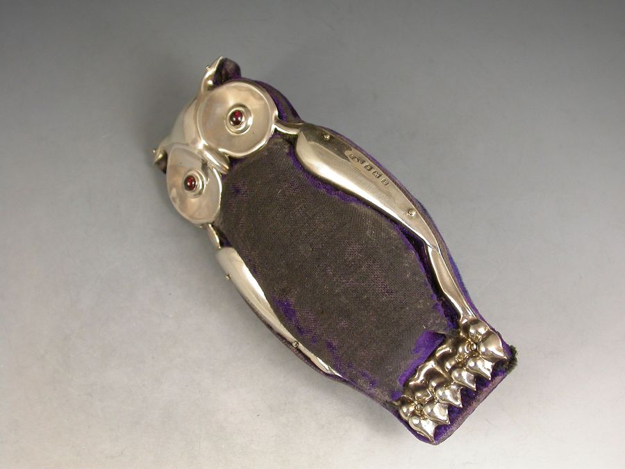A large and rare Edwardian novelty silver Pin Cushion made in the form of an Owl of flat standing form, set with ruby glass eyes and complete with original blue velvet cushion and silk base.