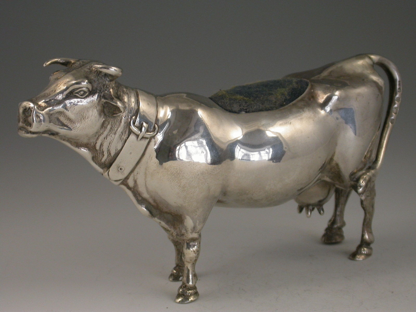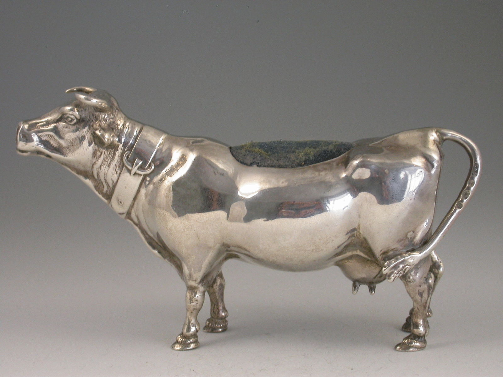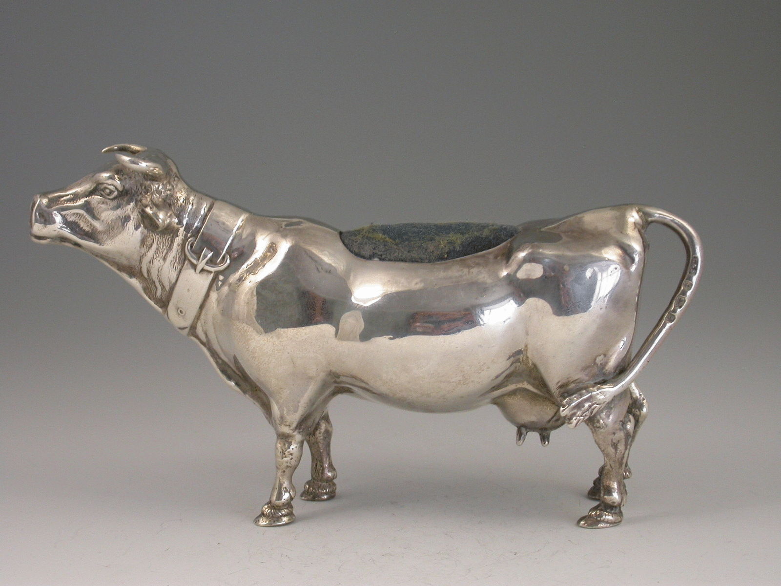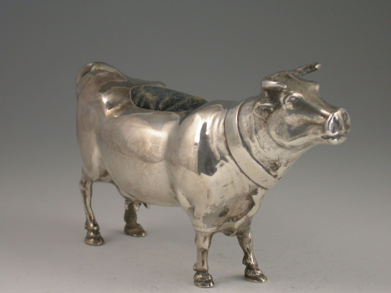 A rare and large size Edwardian silver Pin cushion modelled in the form of a Cow, finely detailed with a collar around her neck and complete with original faded blue velvet cushion.