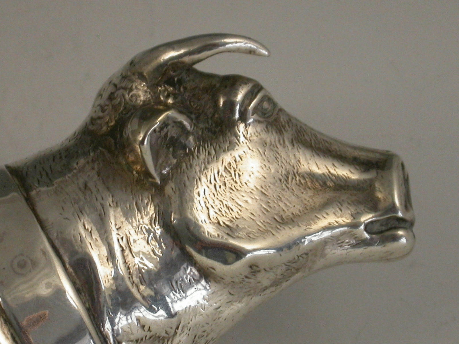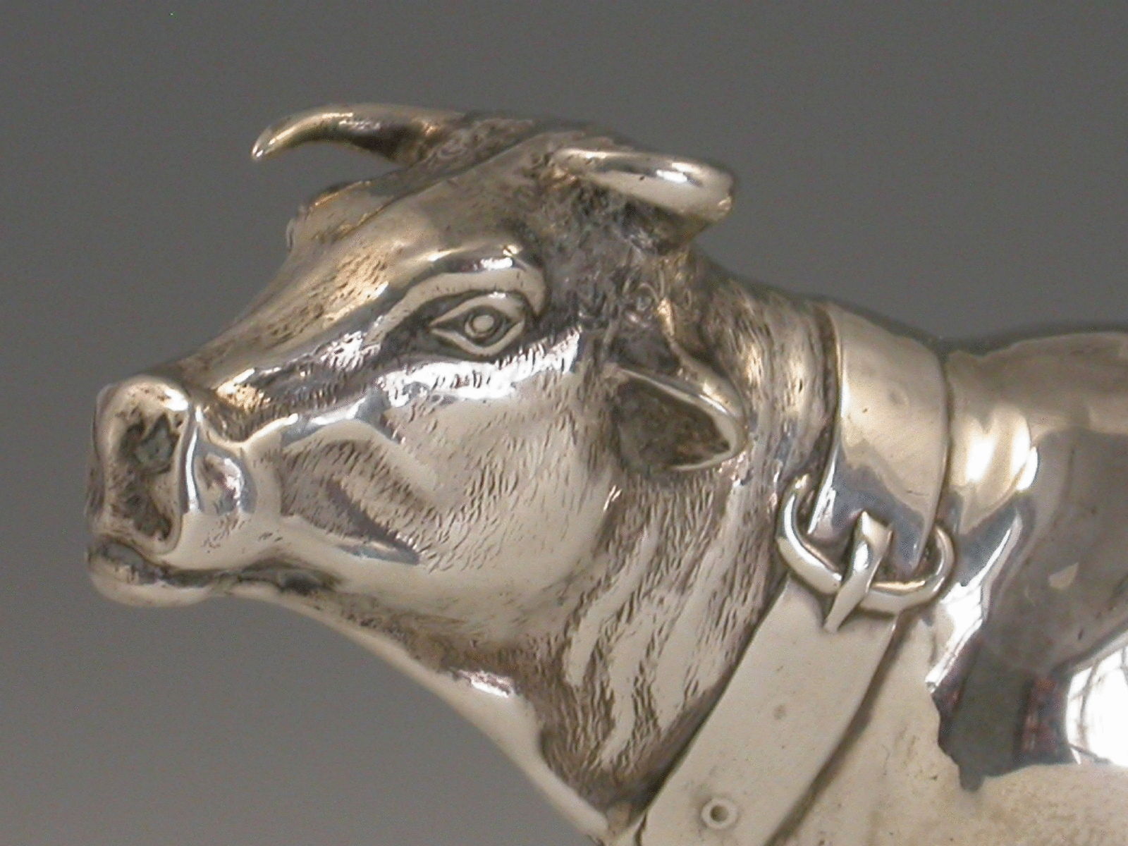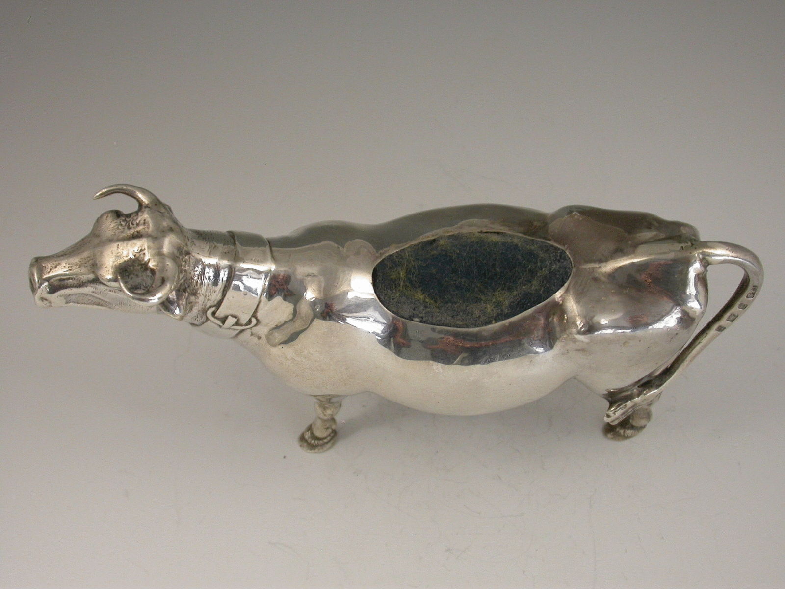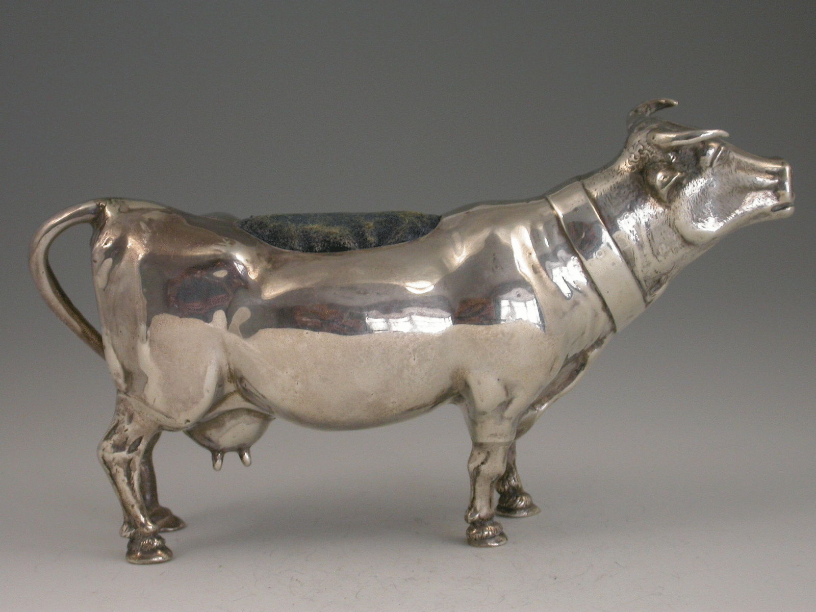 A rare and large size Edwardian silver Pin cushion modelled in the form of a Cow, finely detailed with a collar around her neck and complete with original faded blue velvet cushion.