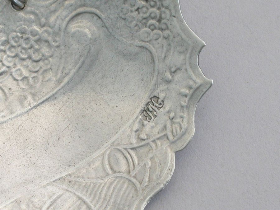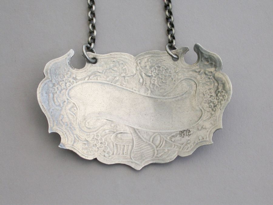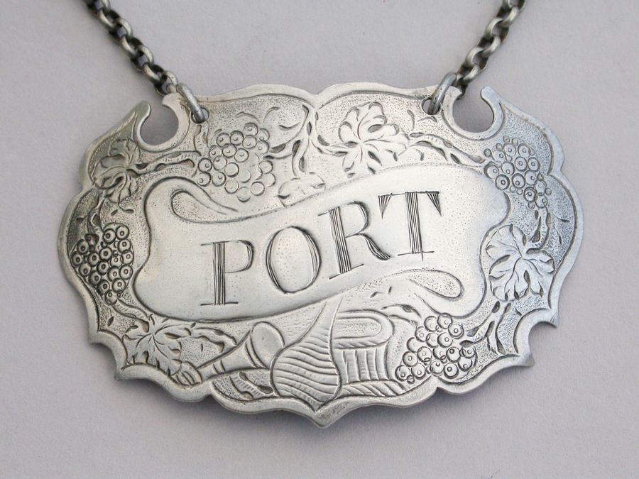 A rare and unusual large George II silver Wine Label of chased escutcheon form with fruiting vine border, incised for Port on a scrolling name plate, a wine glass, a bottle and a basket below. A very unusual variant of an early chased escutcheon and one from the only known set of four(see literature).