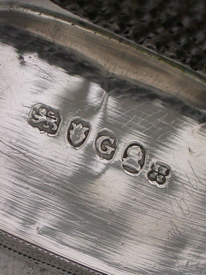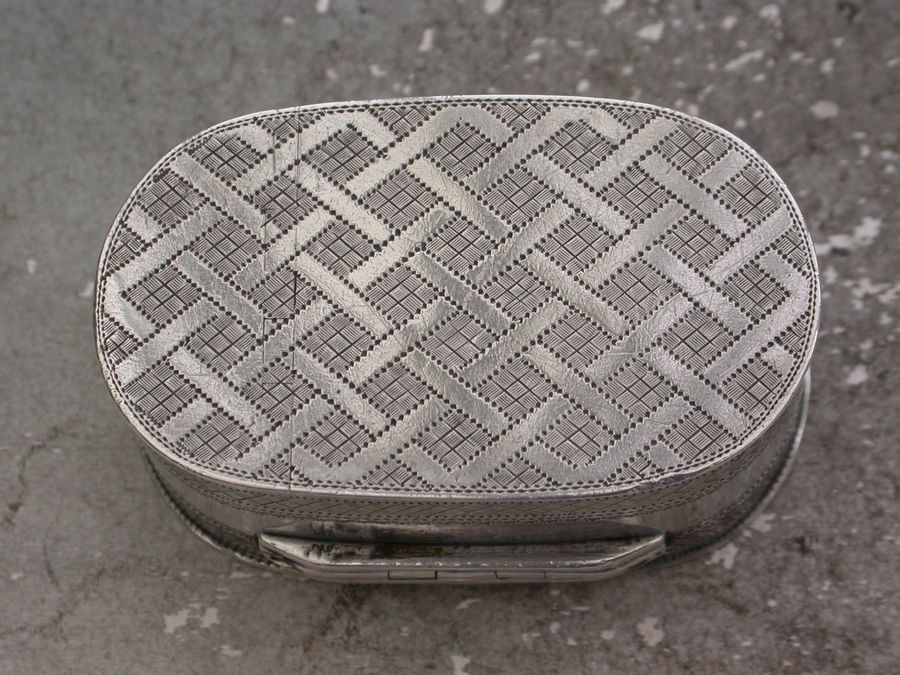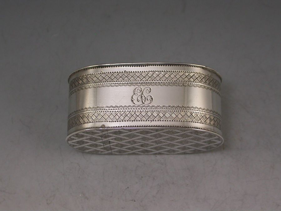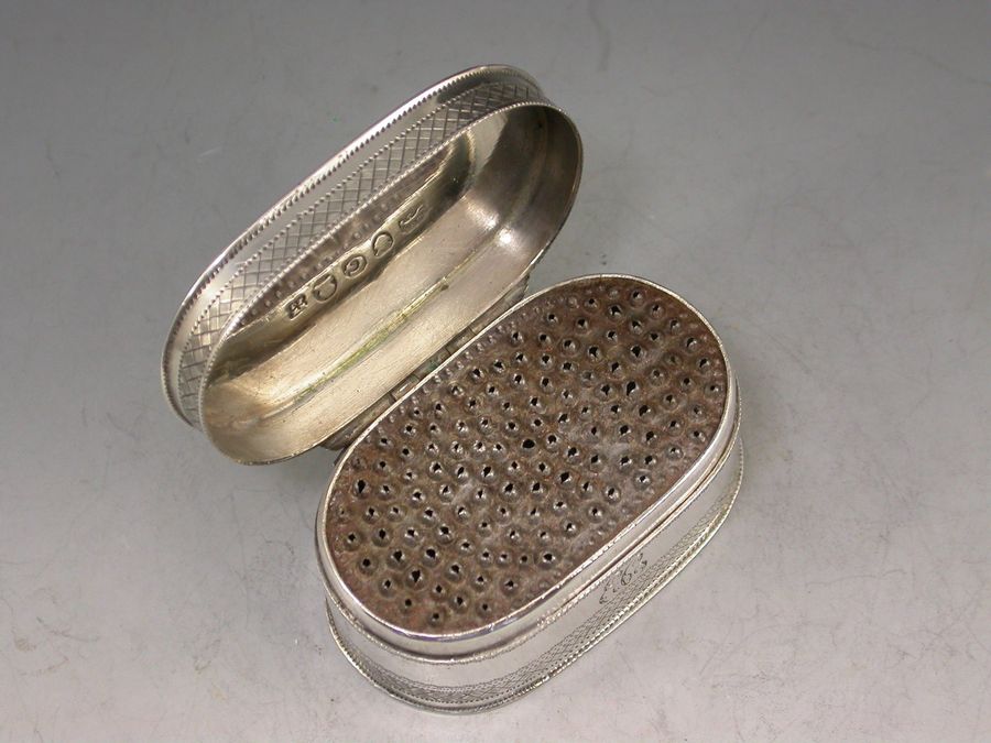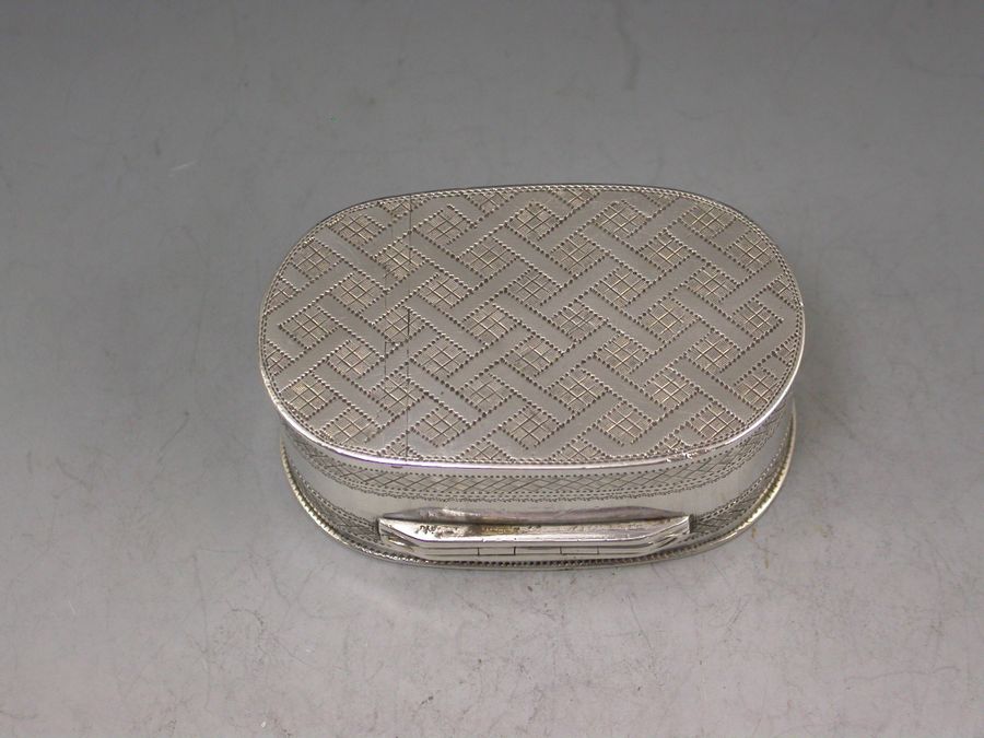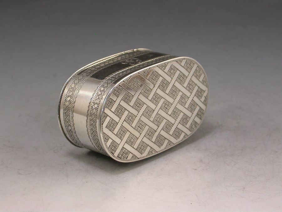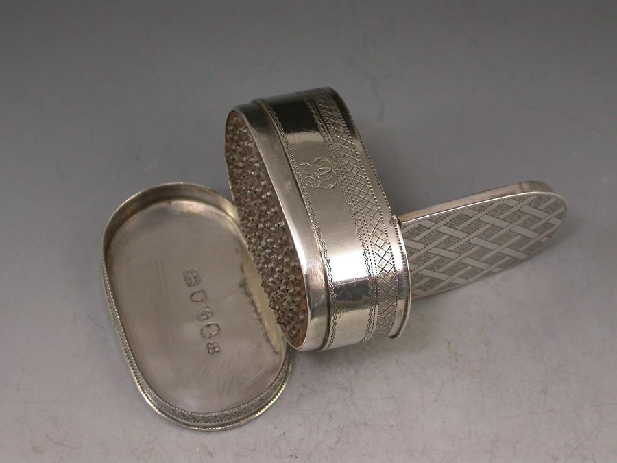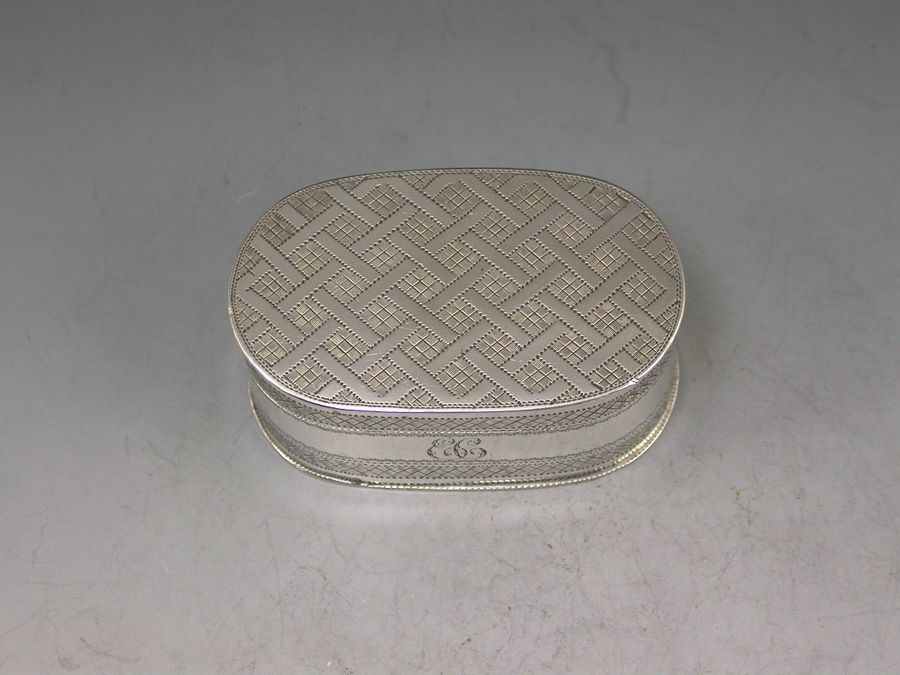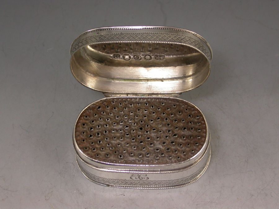 A very fine quality large George III silver Nutmeg Grater of rounded oblong form, the lid and base with bright-cut engraved lattice work decoration, the sides with bright-cut engraved bands and contemporary script initials, the hinged lid and base opening to reveal the original pierced steel grater.