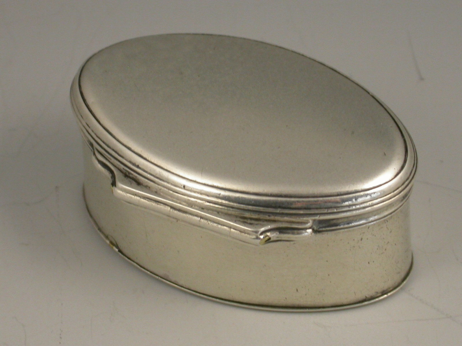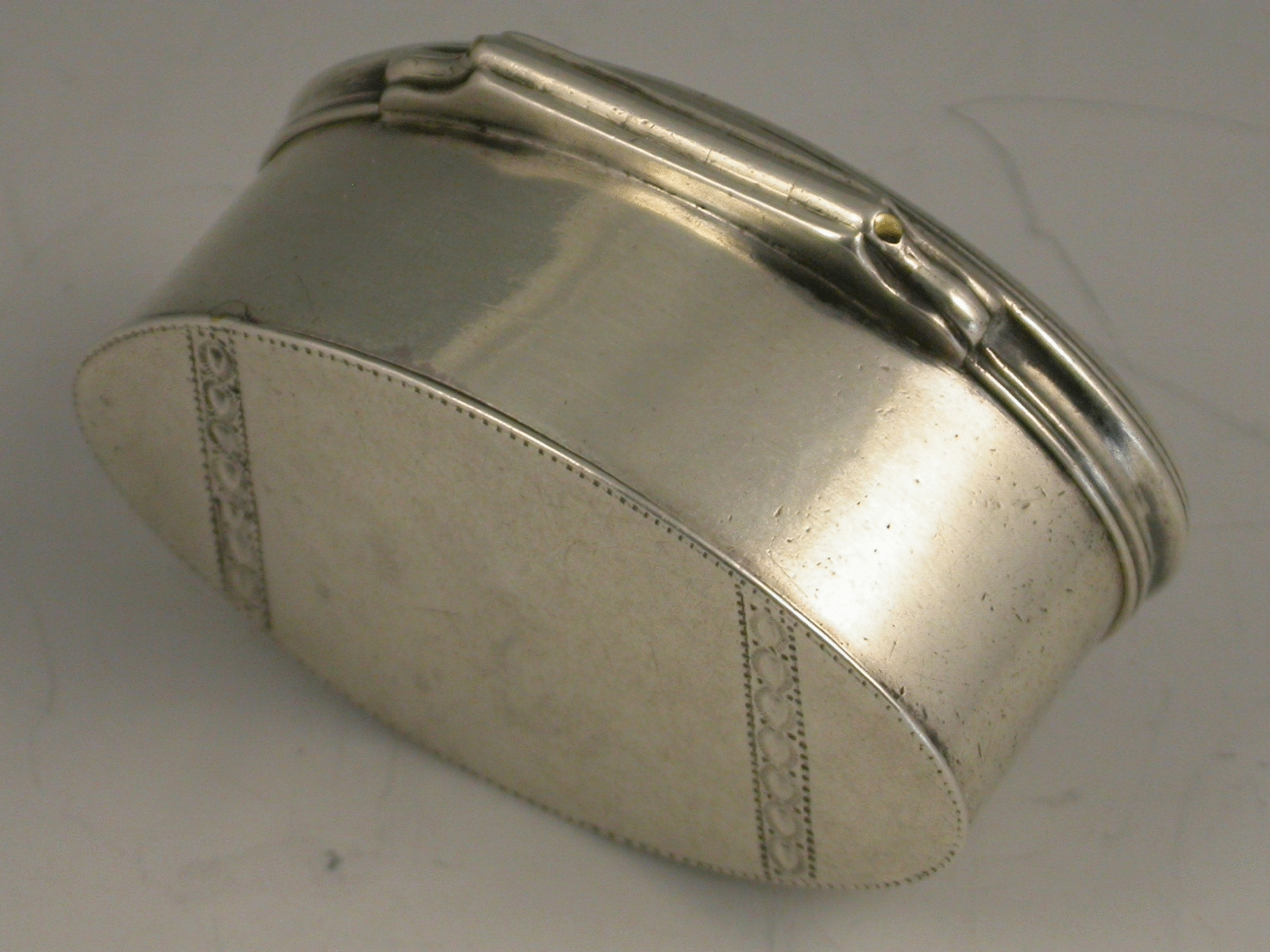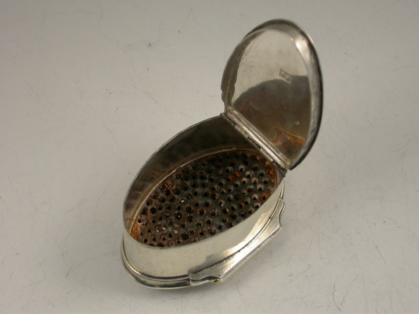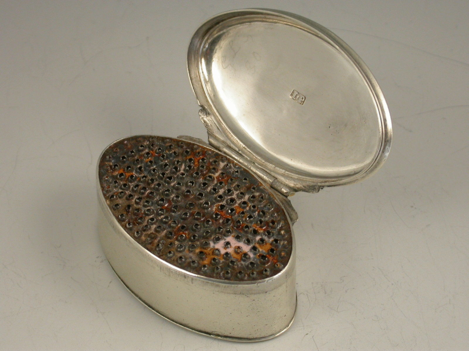 A good George III plain oval silver Nutmeg Grater of large size, the flat base with finely concealed hinge and two bands of bright cut engraved decoration, the slightly domed lid with stand-off hinge and interior steel grater.