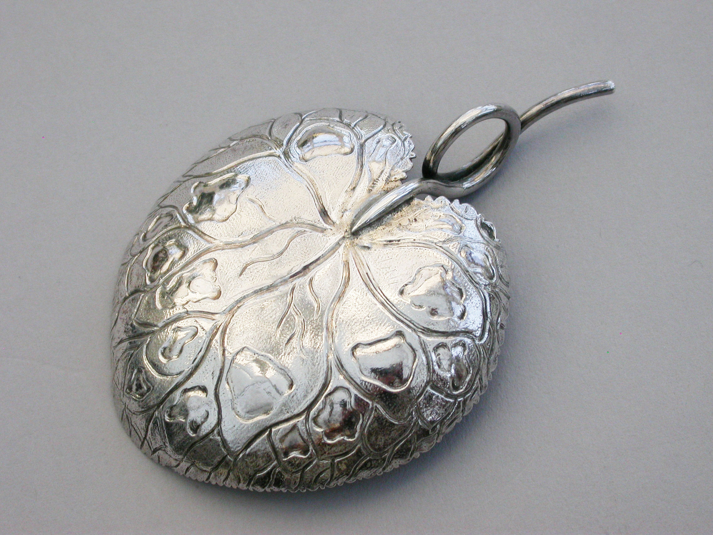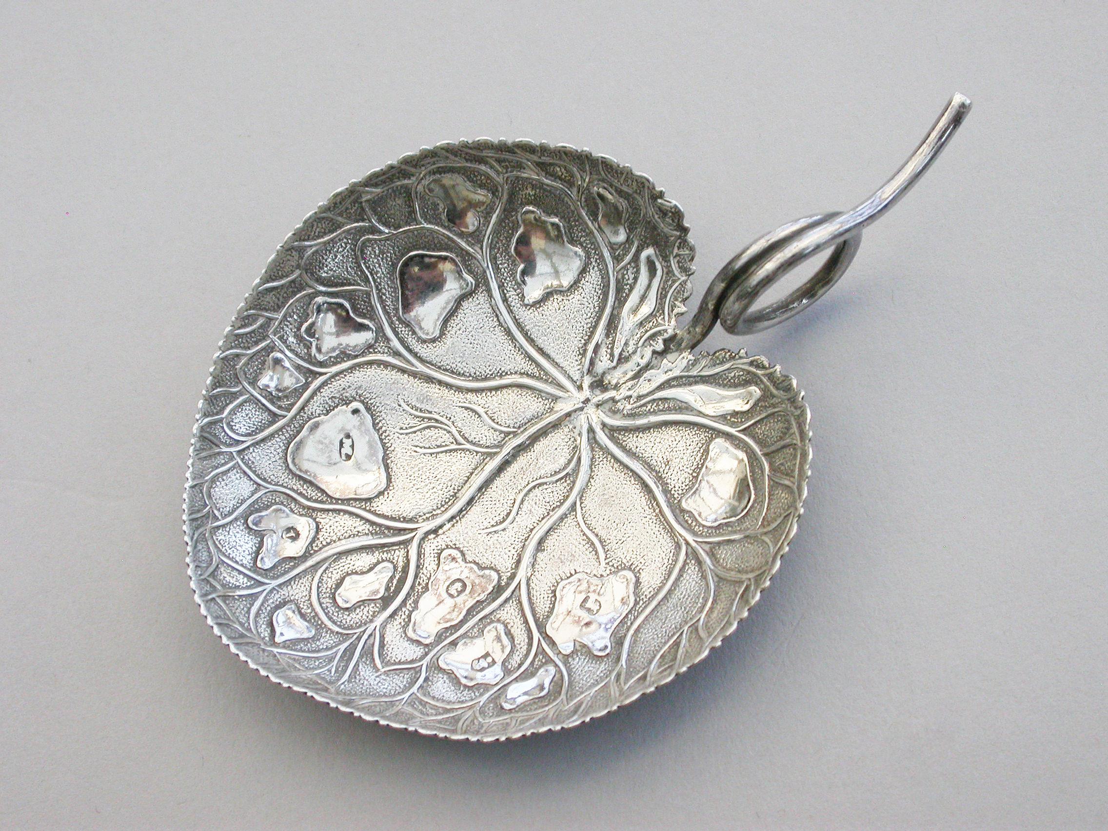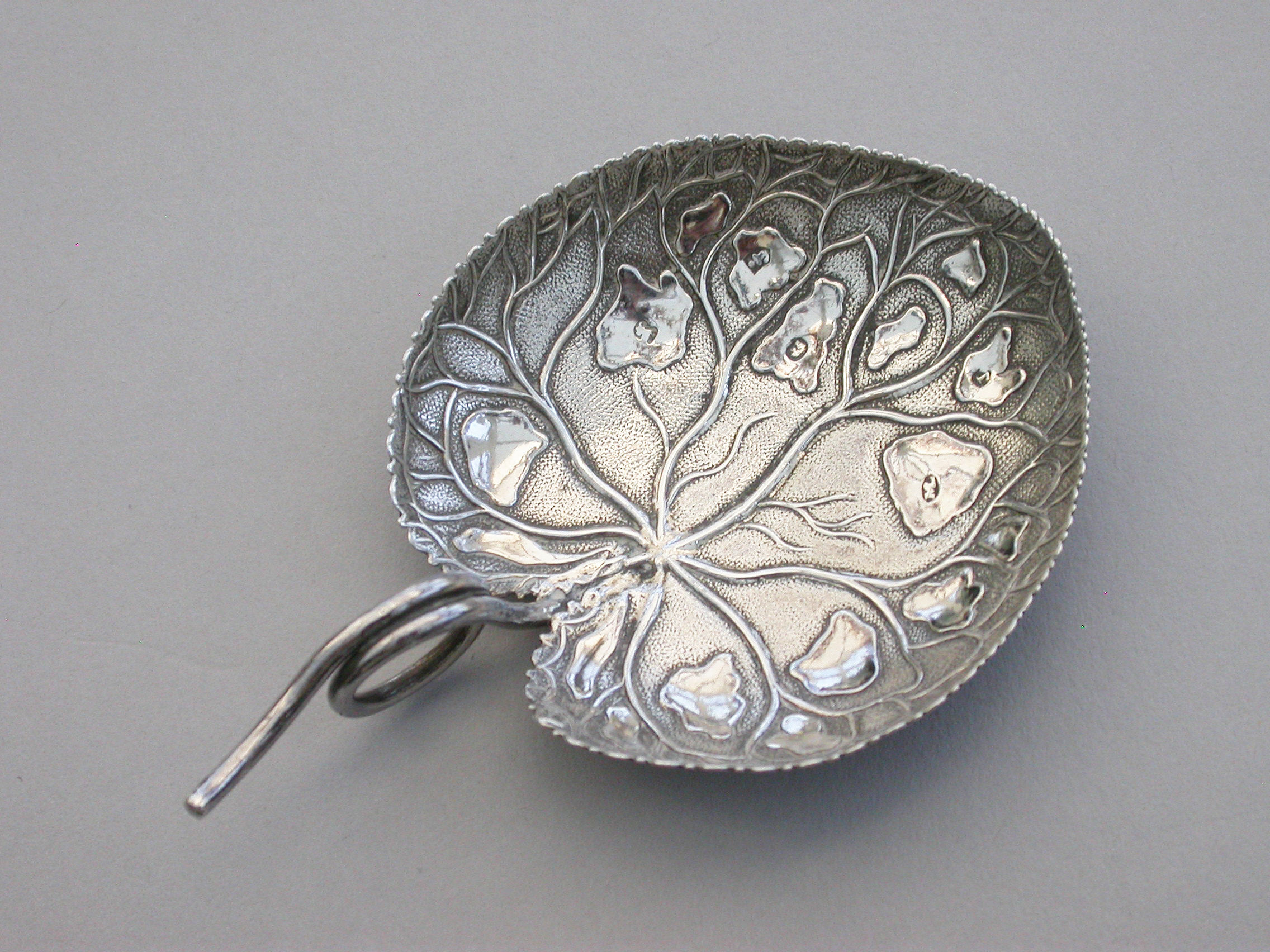 An extremely rare George III silver Caddy Spoon with looped tendril handle, the die-stamped bowl in the form of a lily leaf with serrated border and a matt background.