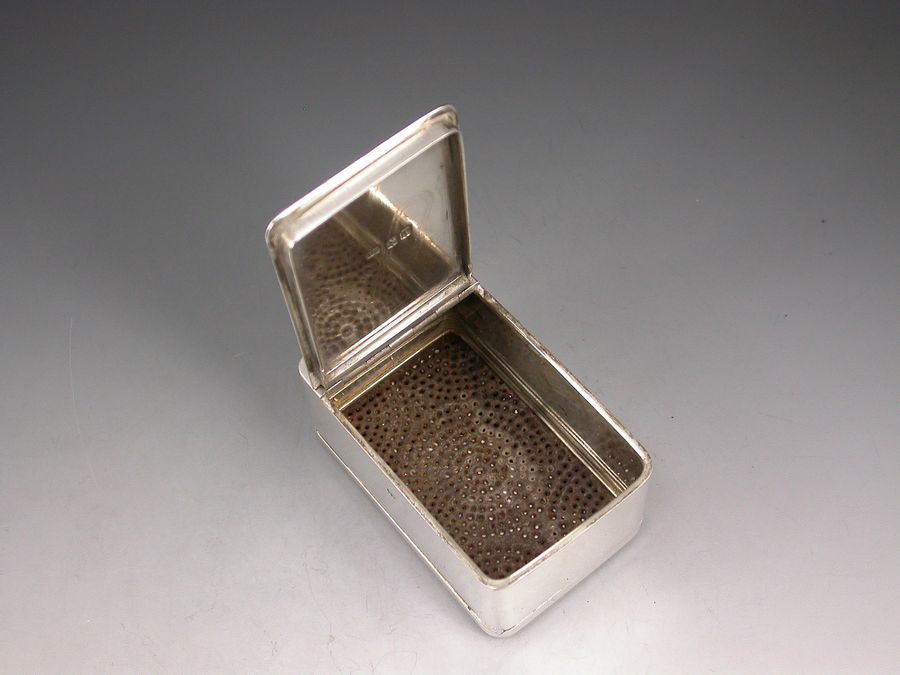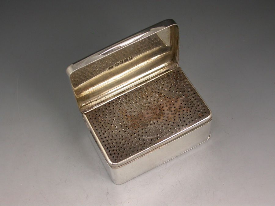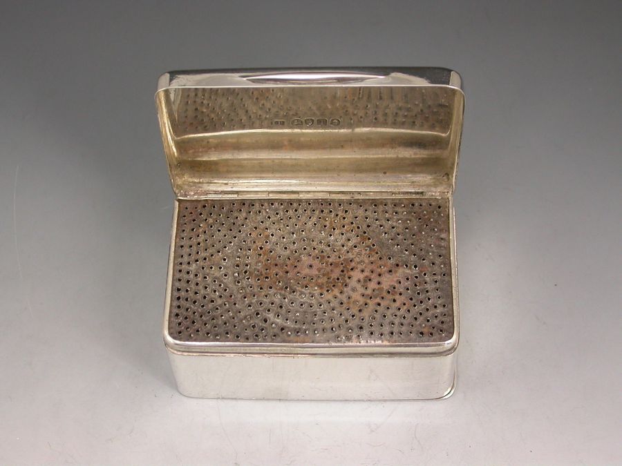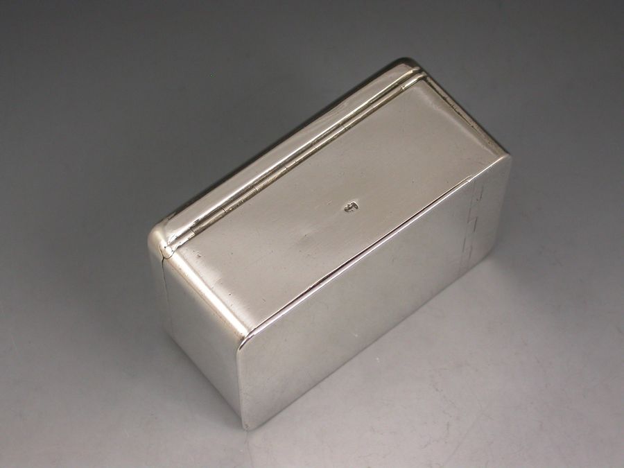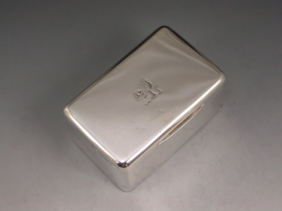A huge George III silver Nutmeg Grater of plain rounded rectangular form, the hinged cover engraved with a crest depicting a demi-lion holding a scallop shell, the interior with original pierced steel grater and the base with flat concealed hinge.