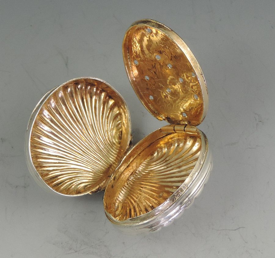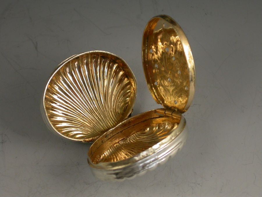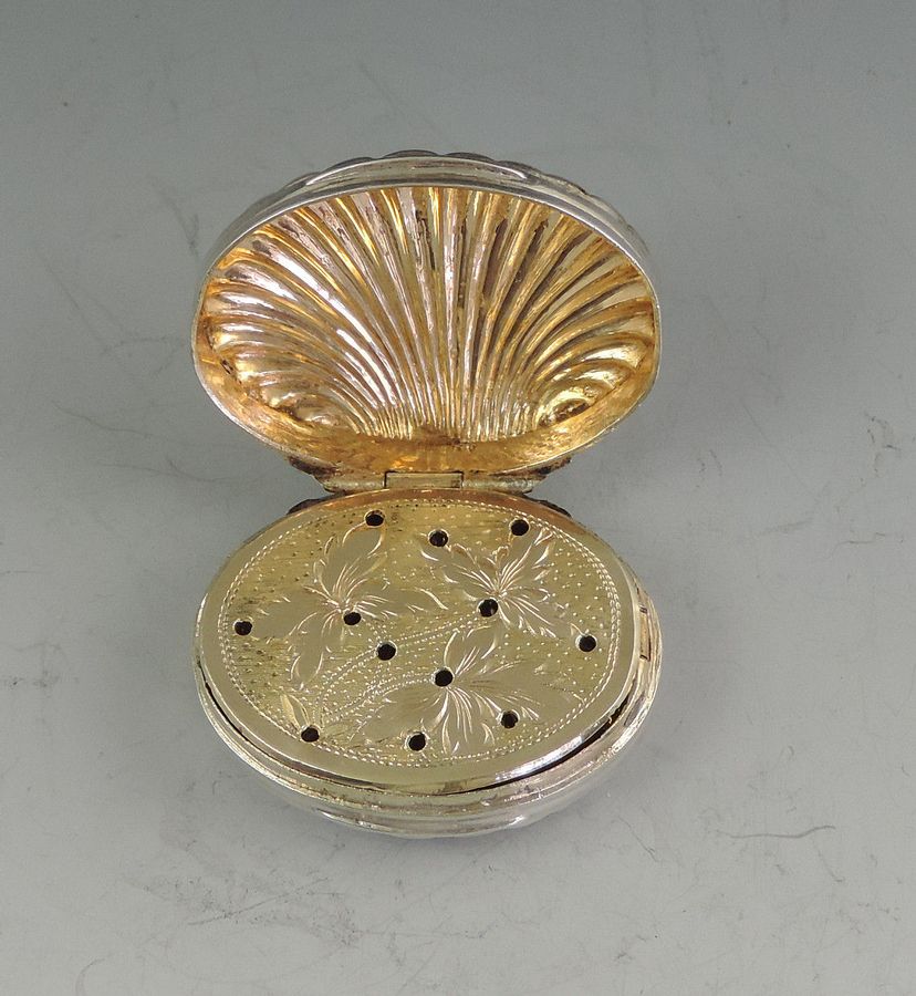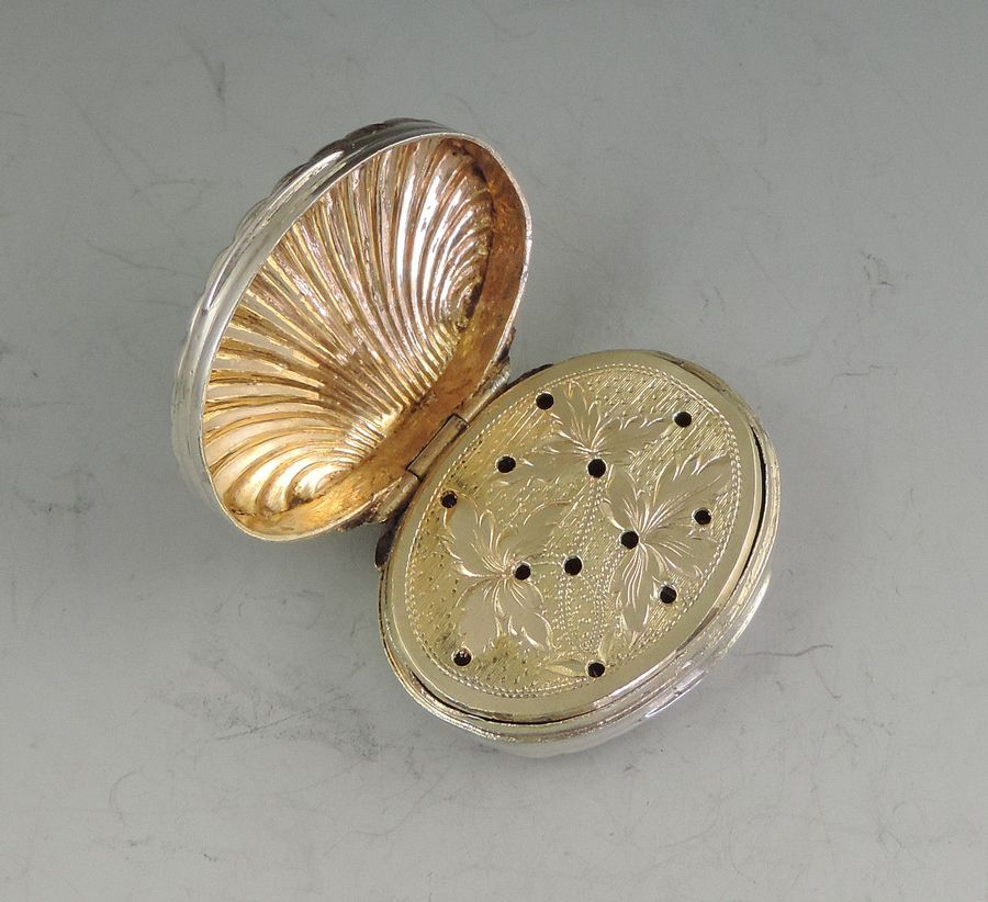 A good George III silver Vinaigrette of large oval raying shell form, silver gilt interior with unusual lily flower decoration to the pierced grille.