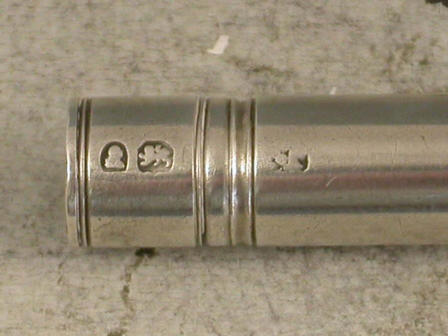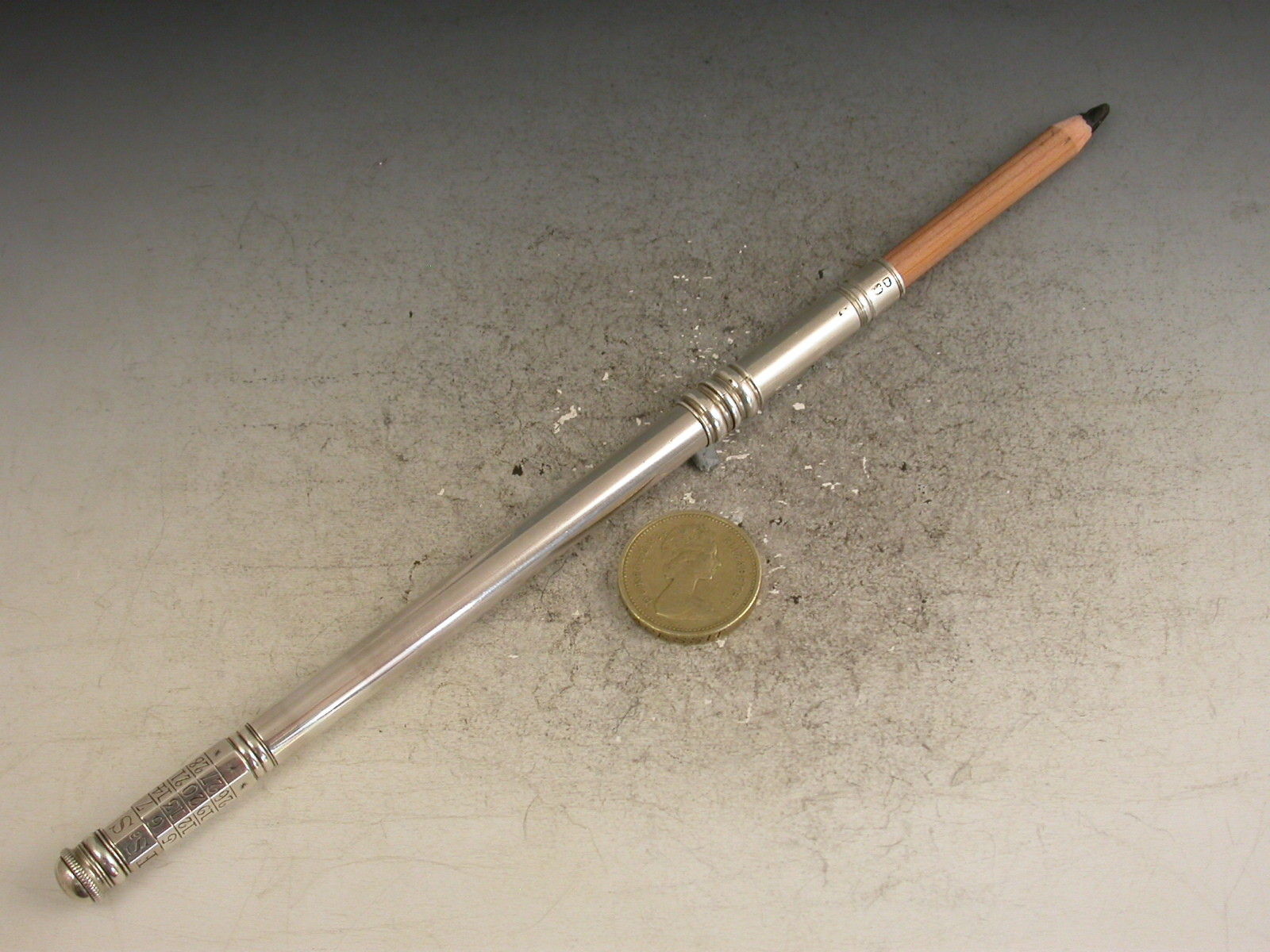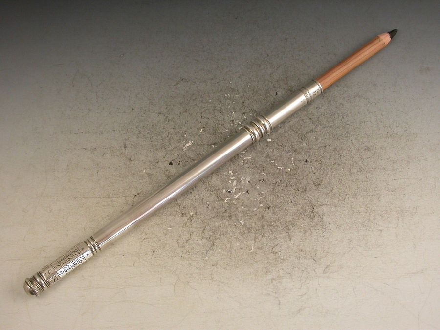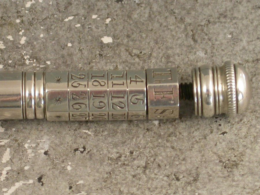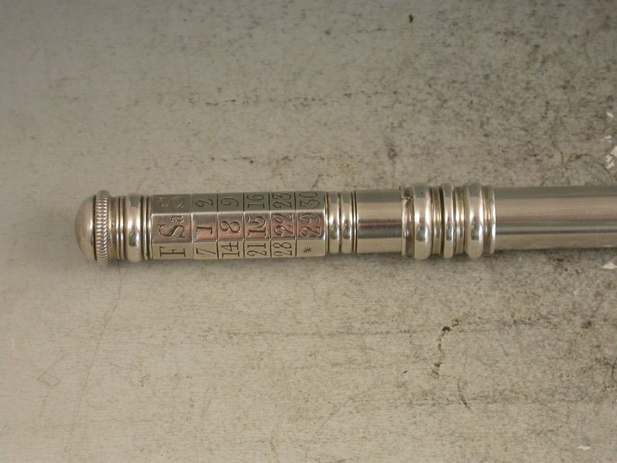 An extremely fine and very scarce large George III silver sliding Porte Crayon combined with a revolving Perpetual Calendar, the crayon ejected by a simple ribbed slide band and the calender secured by a domed screw cap.