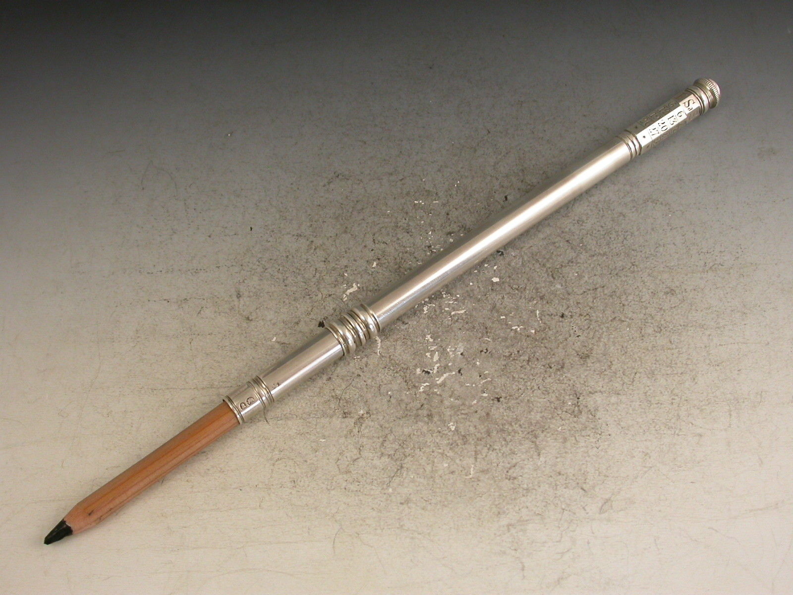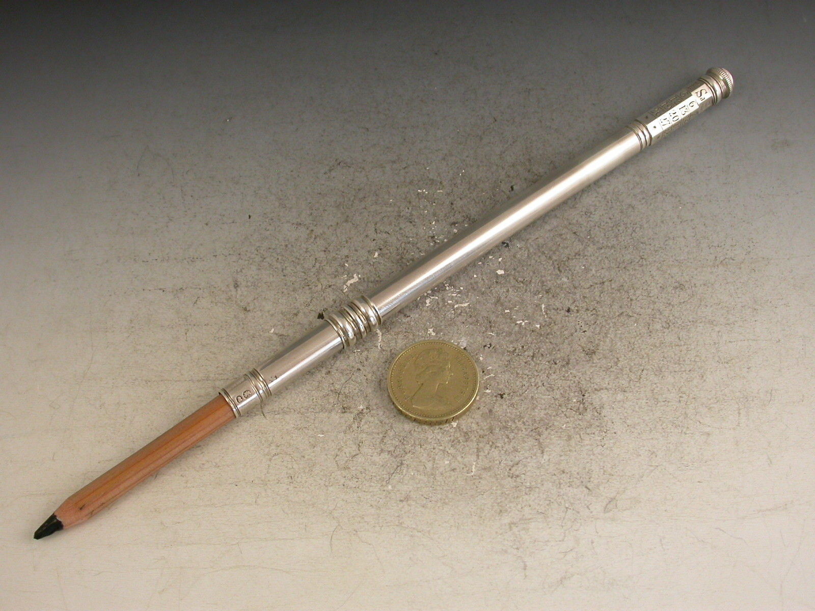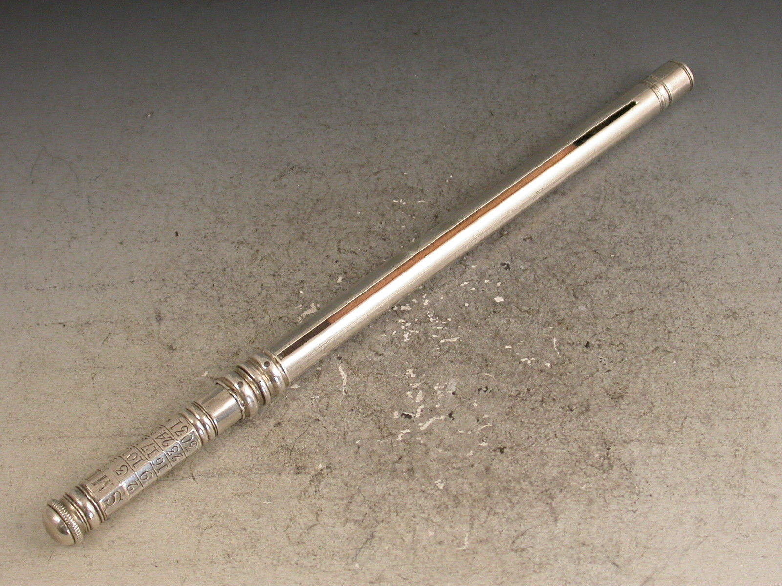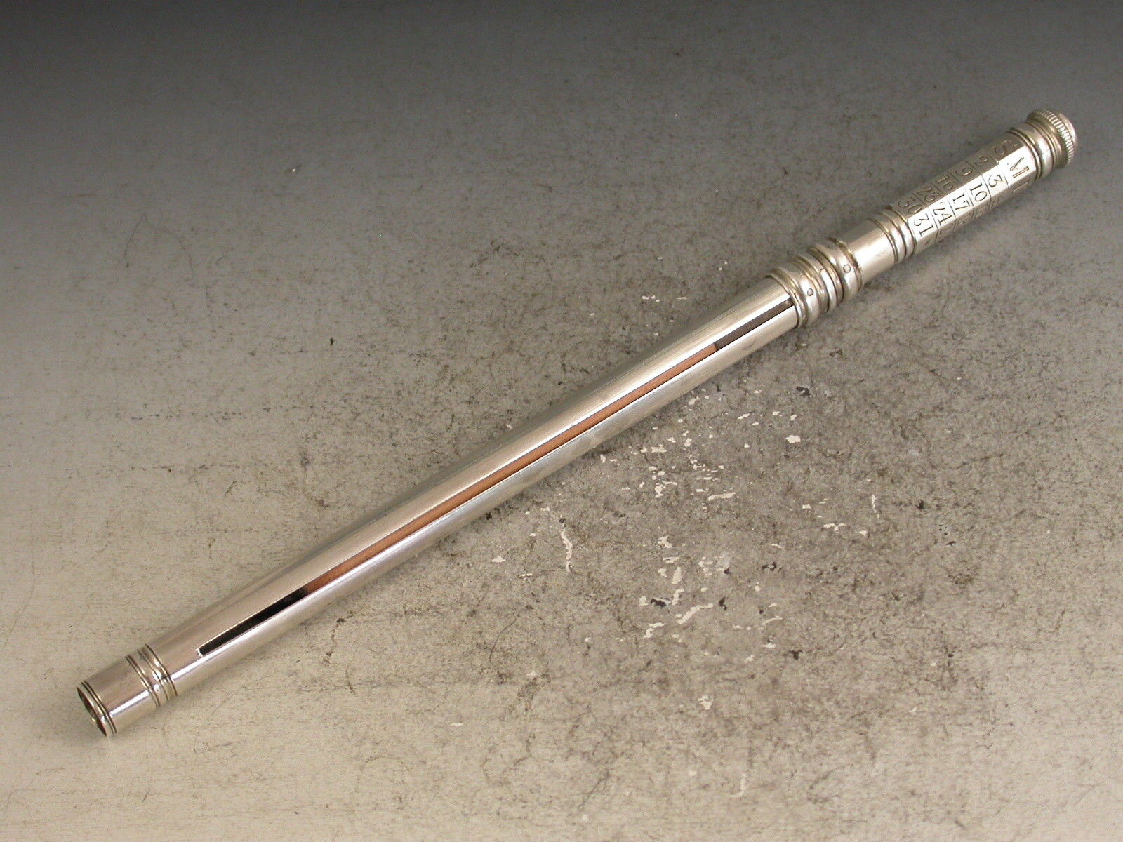 An extremely fine and very scarce large George III silver sliding Porte Crayon combined with a revolving Perpetual Calendar, the crayon ejected by a simple ribbed slide band and the calender secured by a domed screw cap.