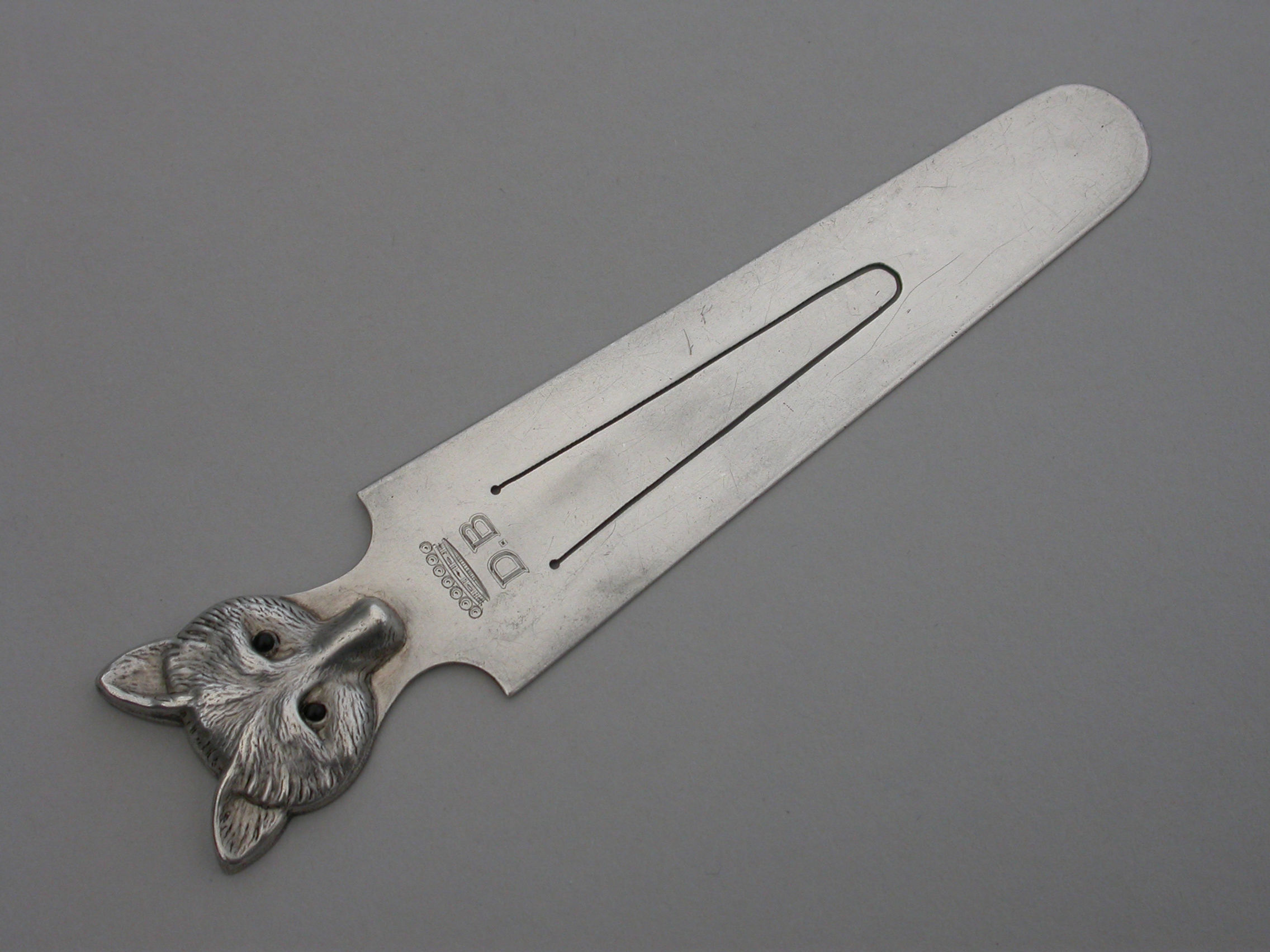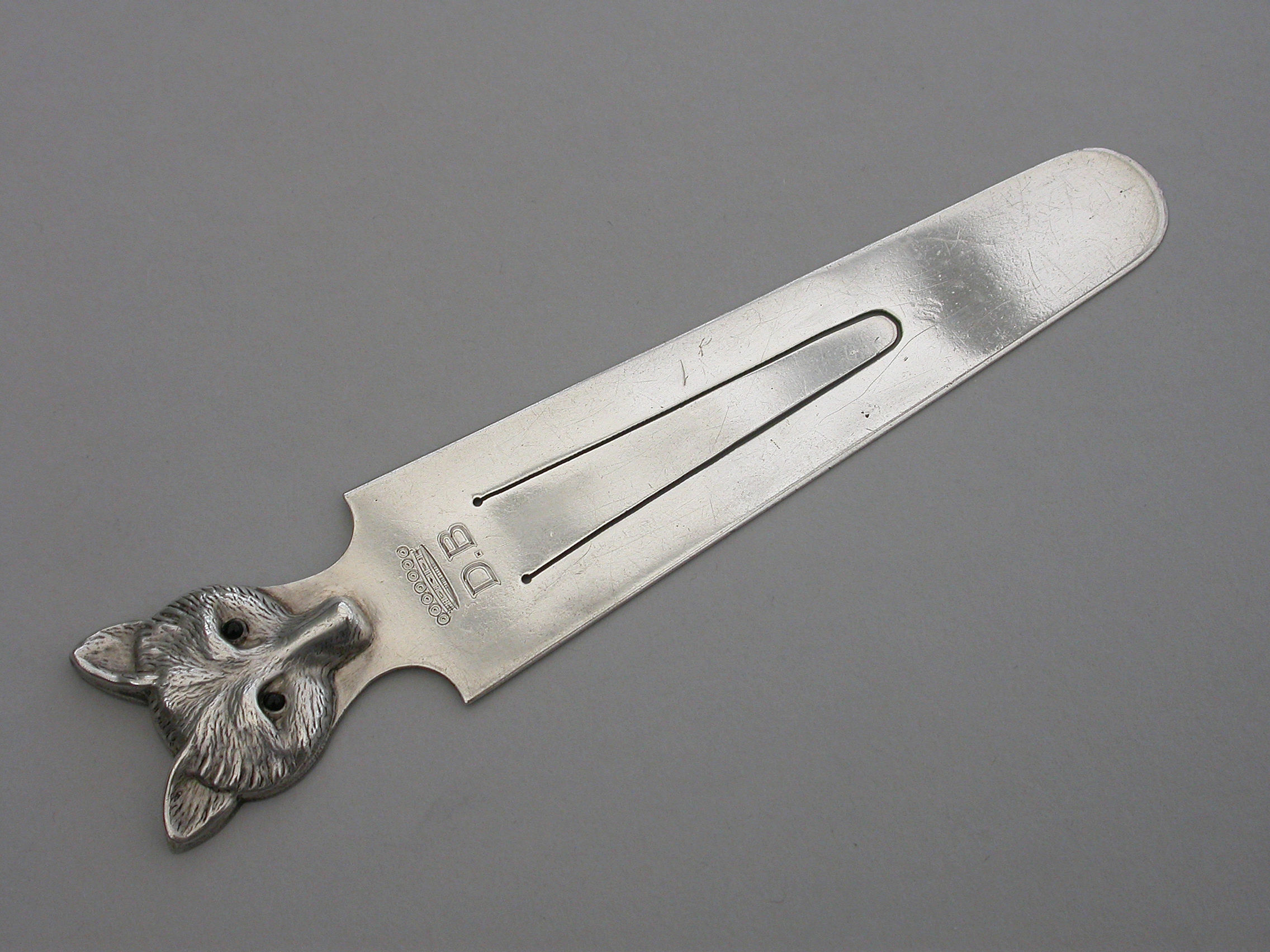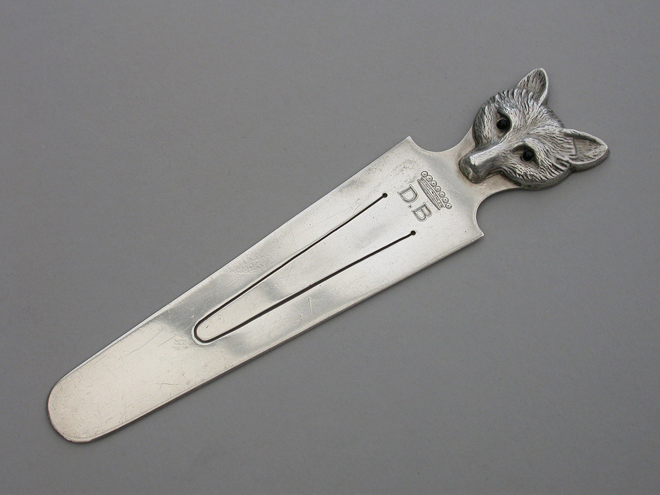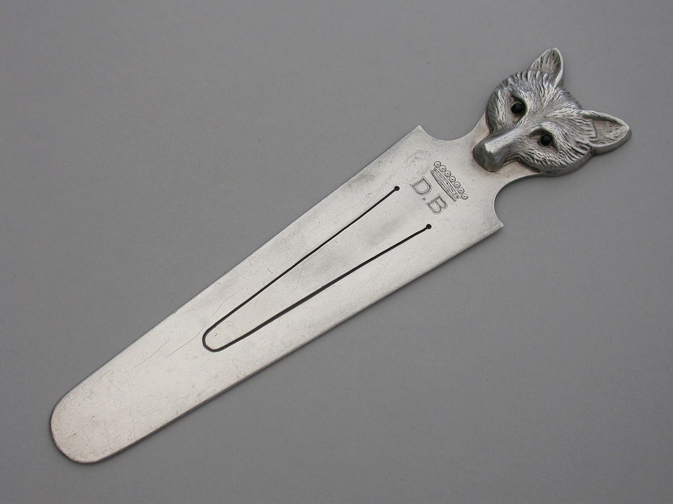 A fine quality large and heavy gauge George V novelty silver Bookmark, the terminal cast as a Foxes head set with ruby glass eyes. The blade engraved with a Viscounts Coronet above the initials - 'D.B'