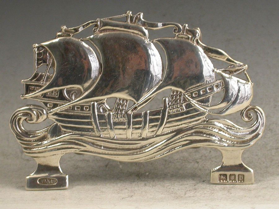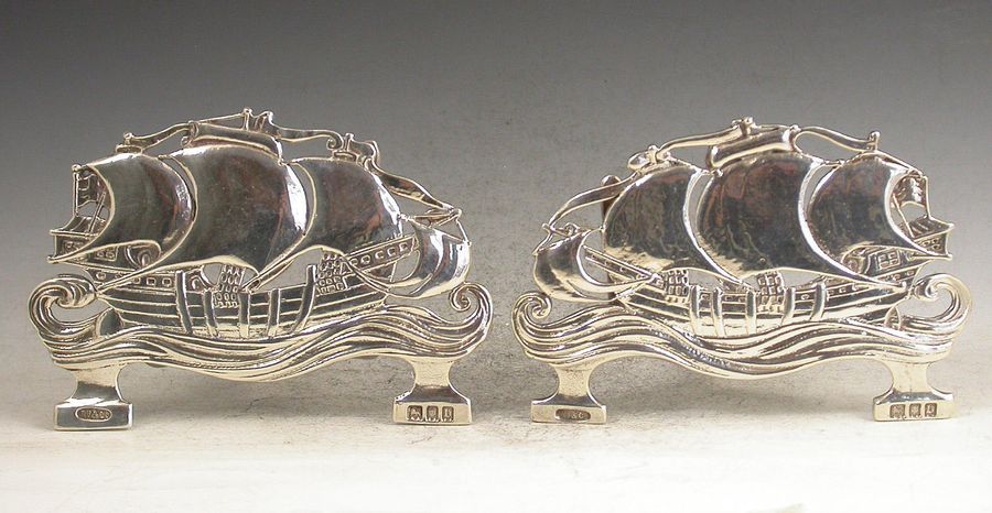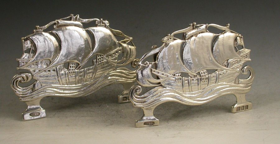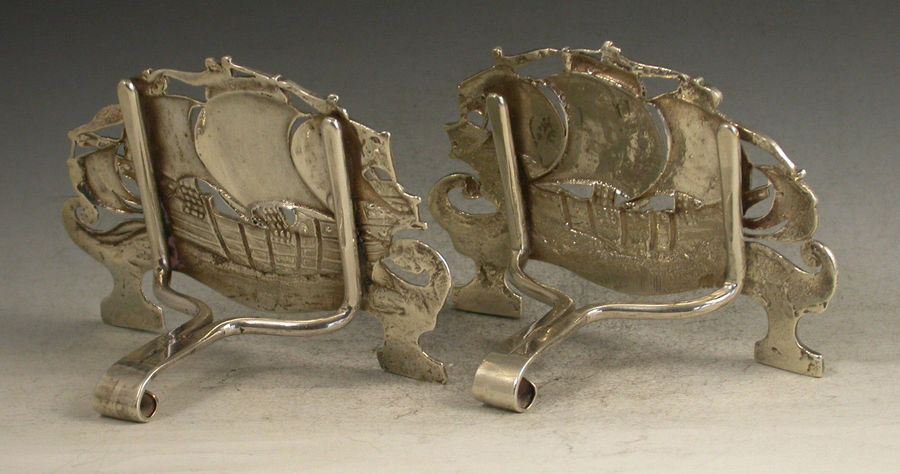A fine quality large pair of early 20th century cast silver Menu Holders made in the form of Galleons in full sail, standing on solid scrolled support.