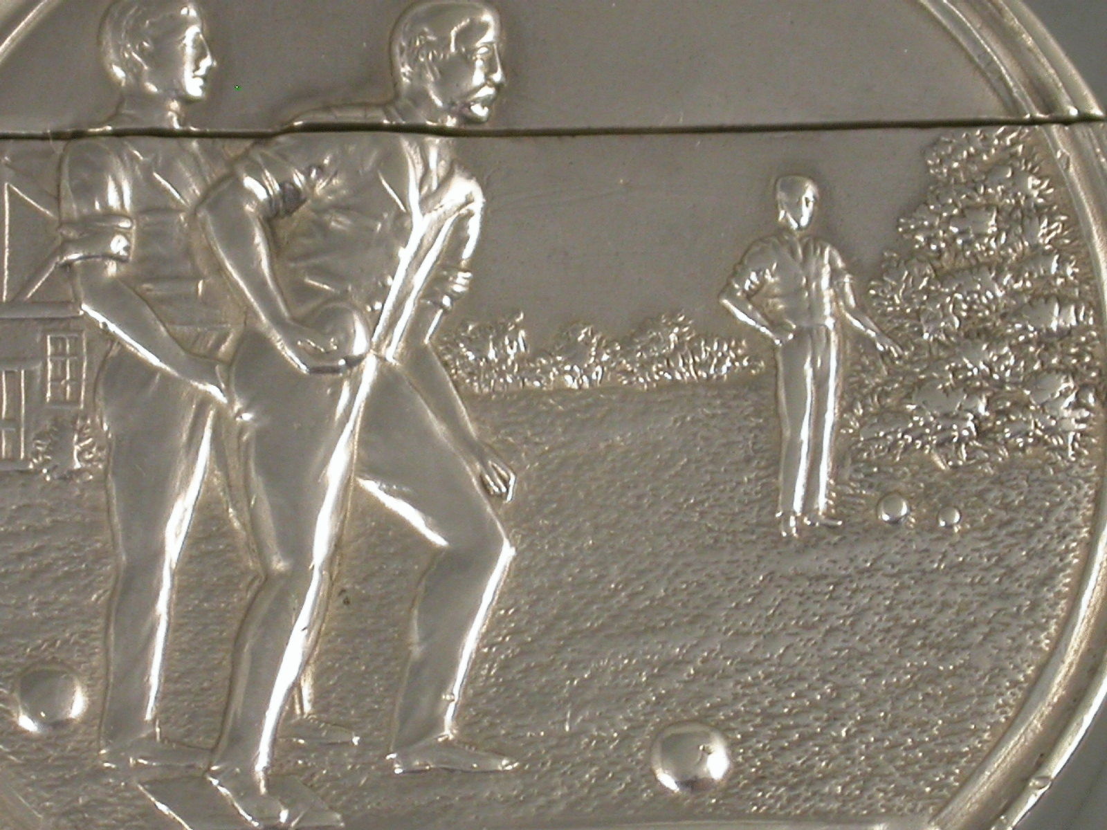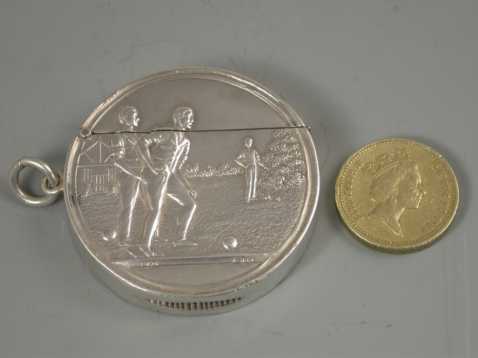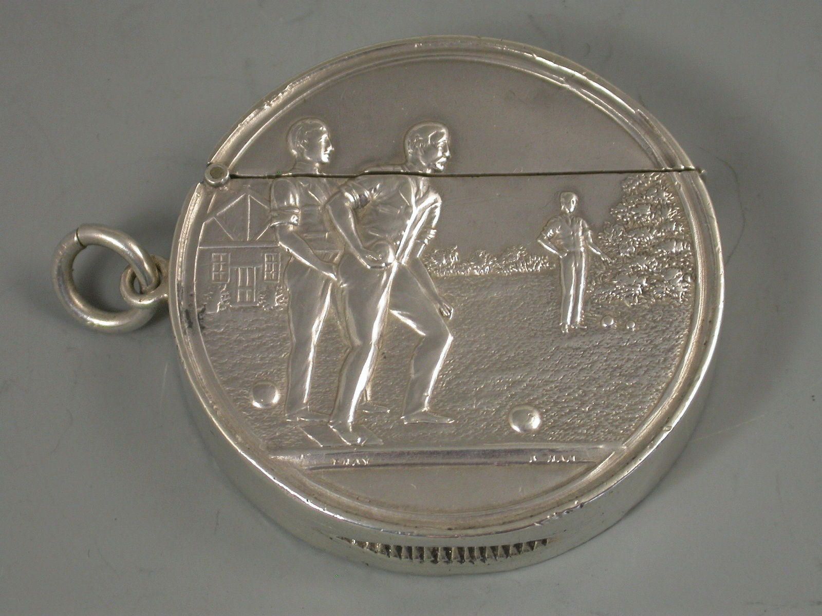 A rare Edwardian silver Vesta Case of circular form with flip top lid and of an unusually large size, the cover chased and engraved with three men playing bowls (a scarce subject).