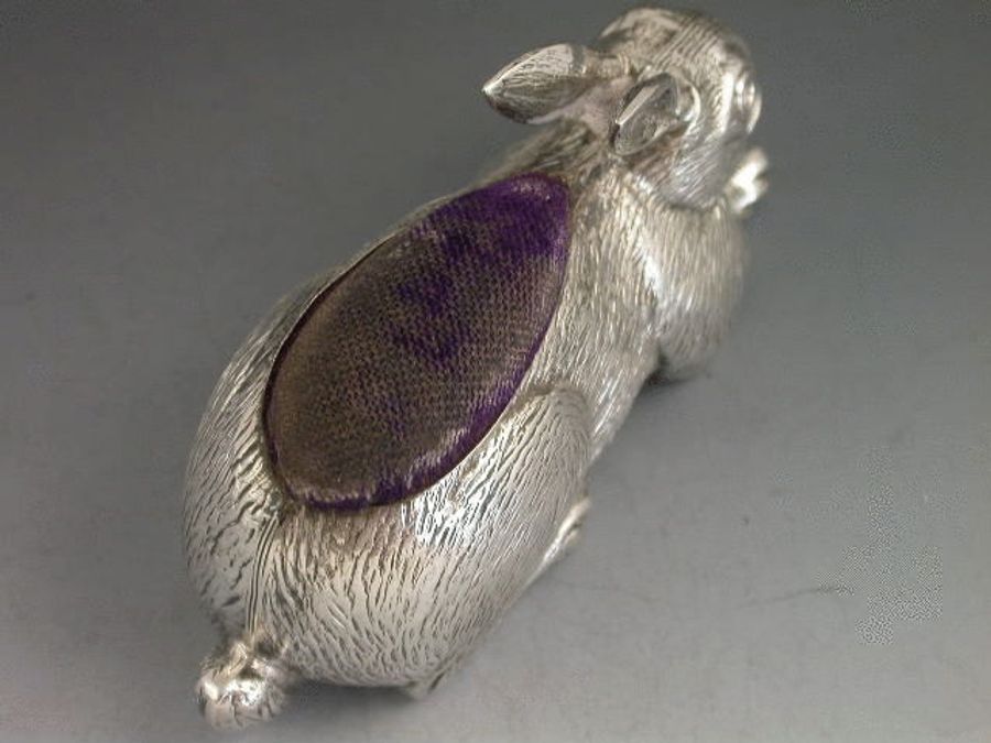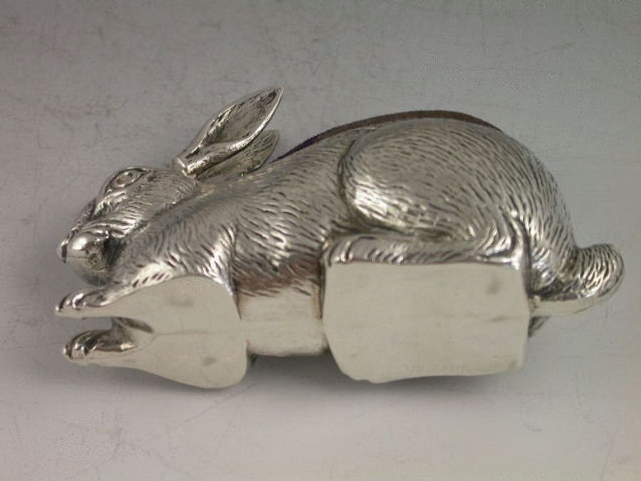 A good Edwardian silver Pin Cushion in the form of a seated Rabbit, with finely engraved detail.