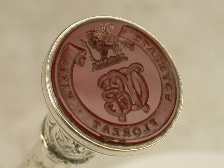 A superb and large Victorian silver combination sliding Propelling Pencil and Dip Pen, the barrel engraved with foliate scrolls and 'Forget Me Not', the terminal set with a Carnelian seal engraved with the crest and motto of Charles Norton Elvin of East Dereham, Norfolk, in an engraved large trumpet shaped mount covering a lead reservoir.