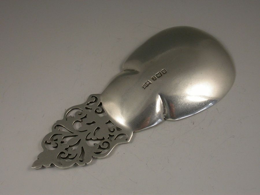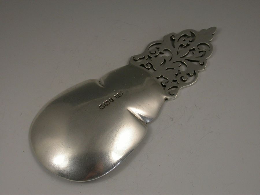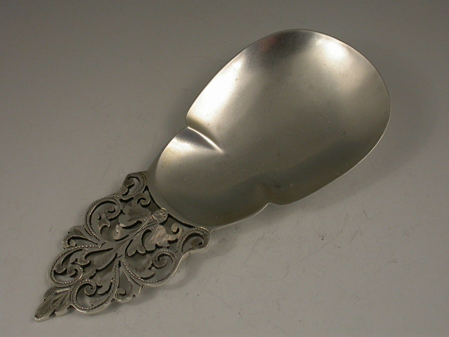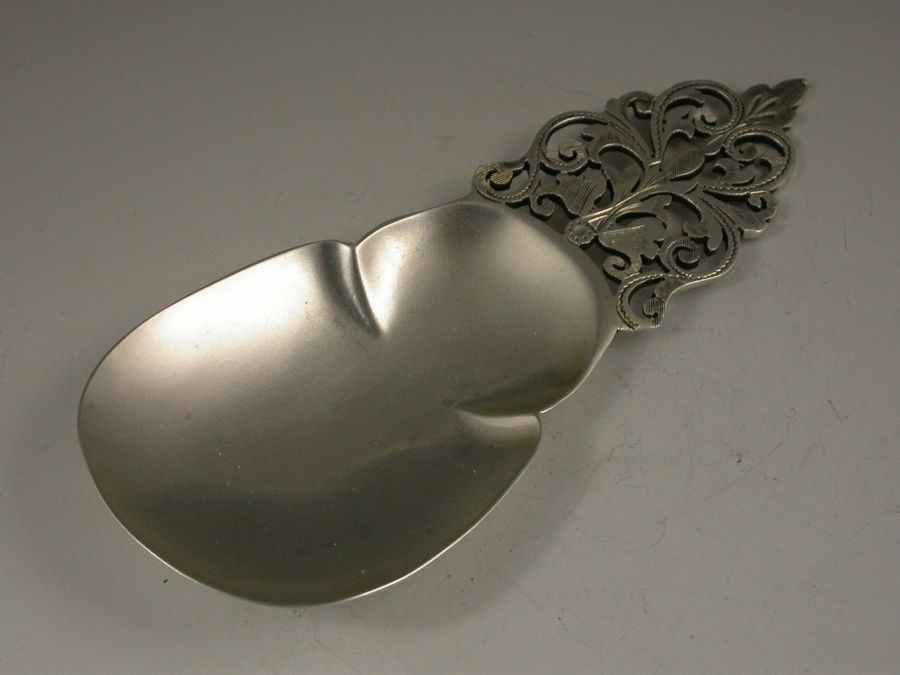 An unusual Victorian silver Caddy Spoon of large size, made in the Arts & Crafts style with fluted pear shaped bowl and scroll pierced handle with engraved decoration.