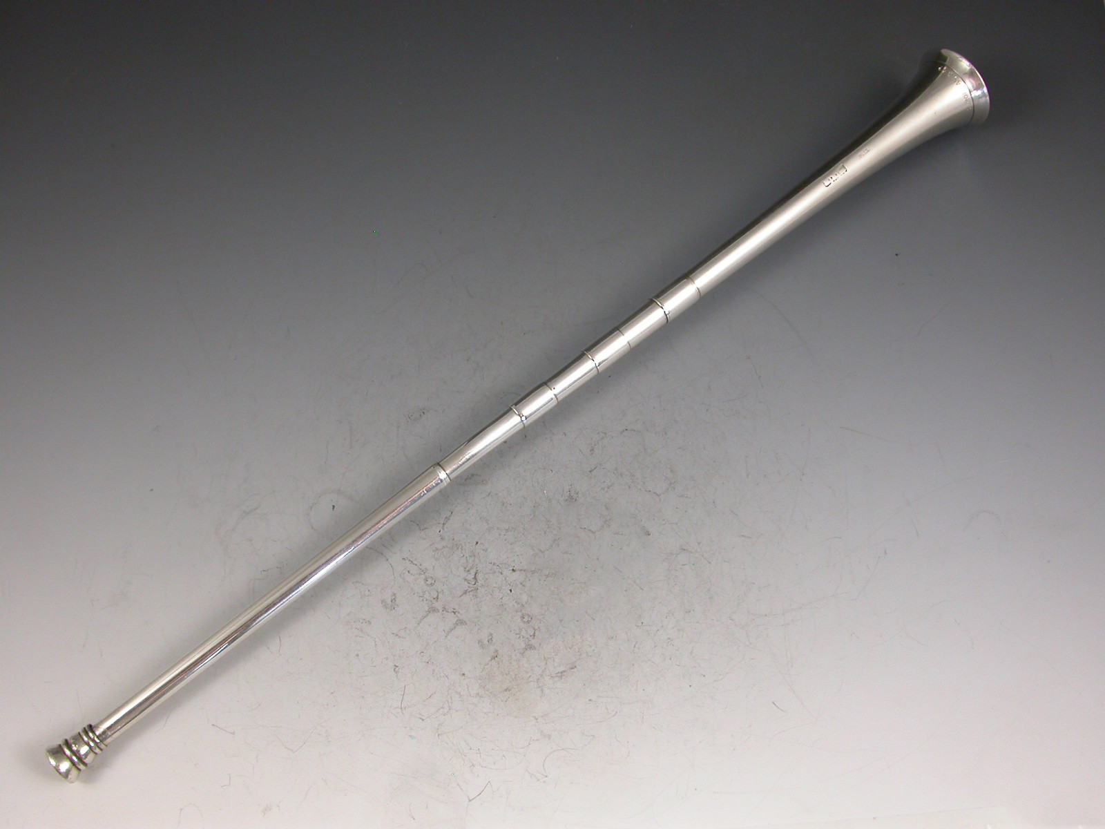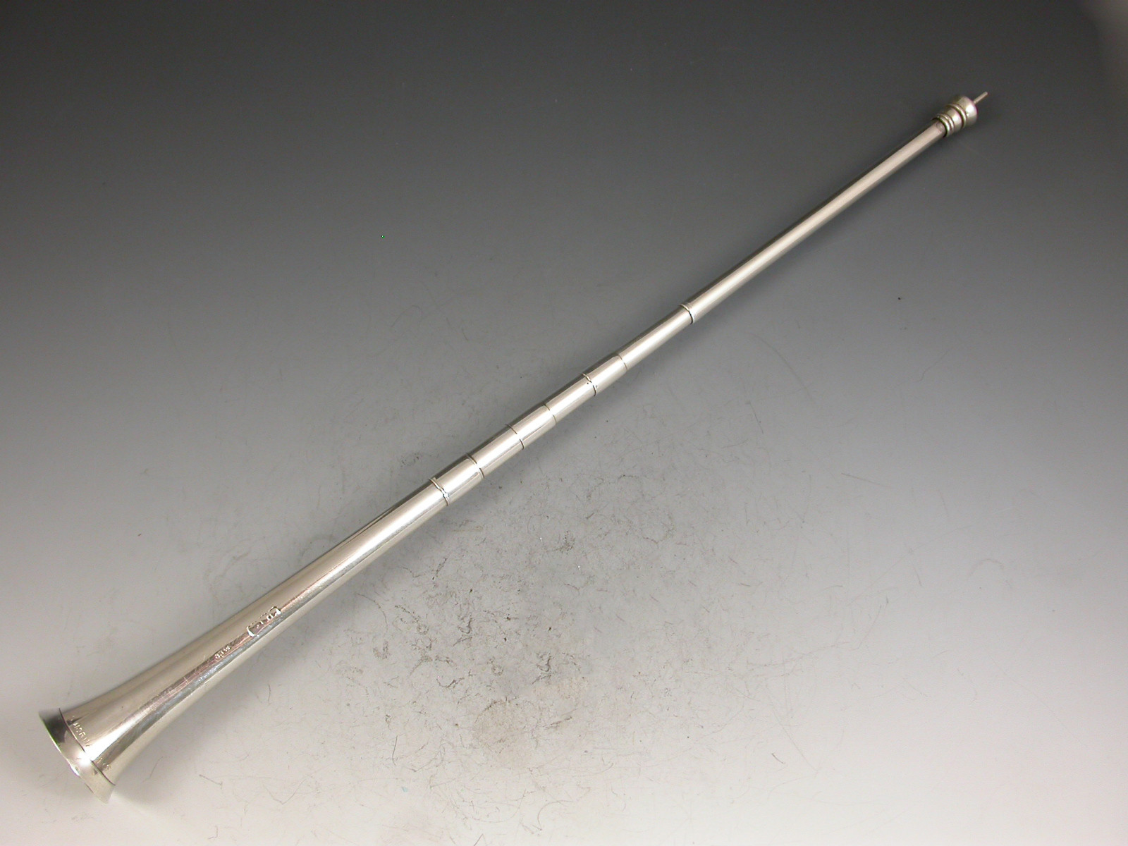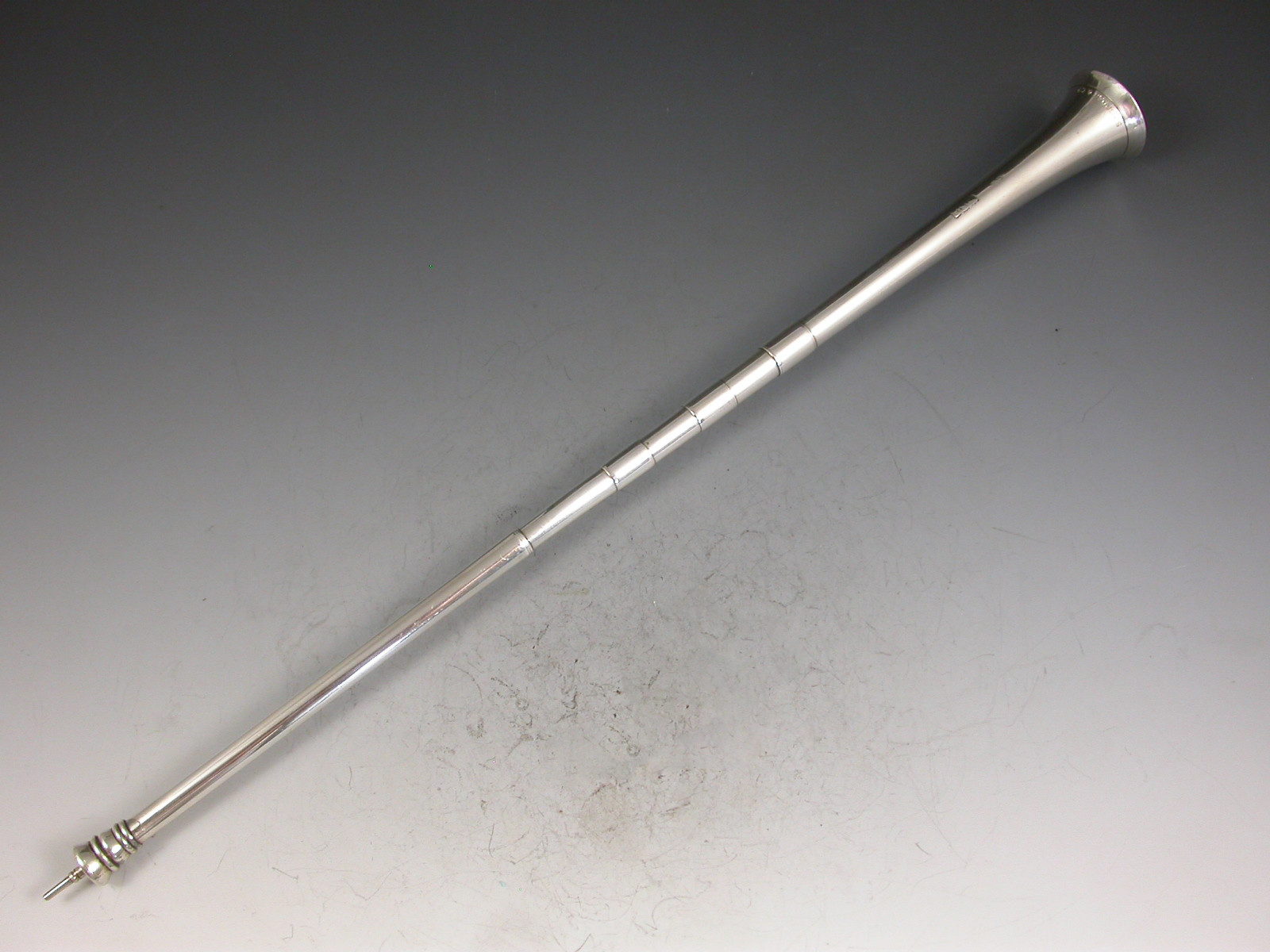 An extremely large (note standard size example in photos for comparison) Victorian novelty silver Propelling Pencil made in the form of a hunting horn, with three raised collars.