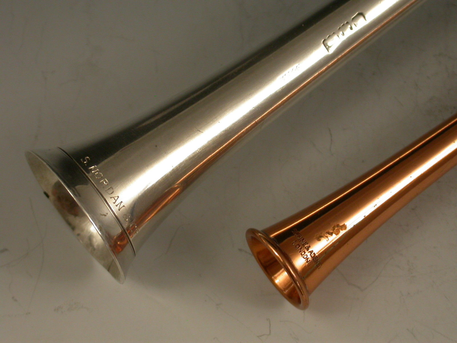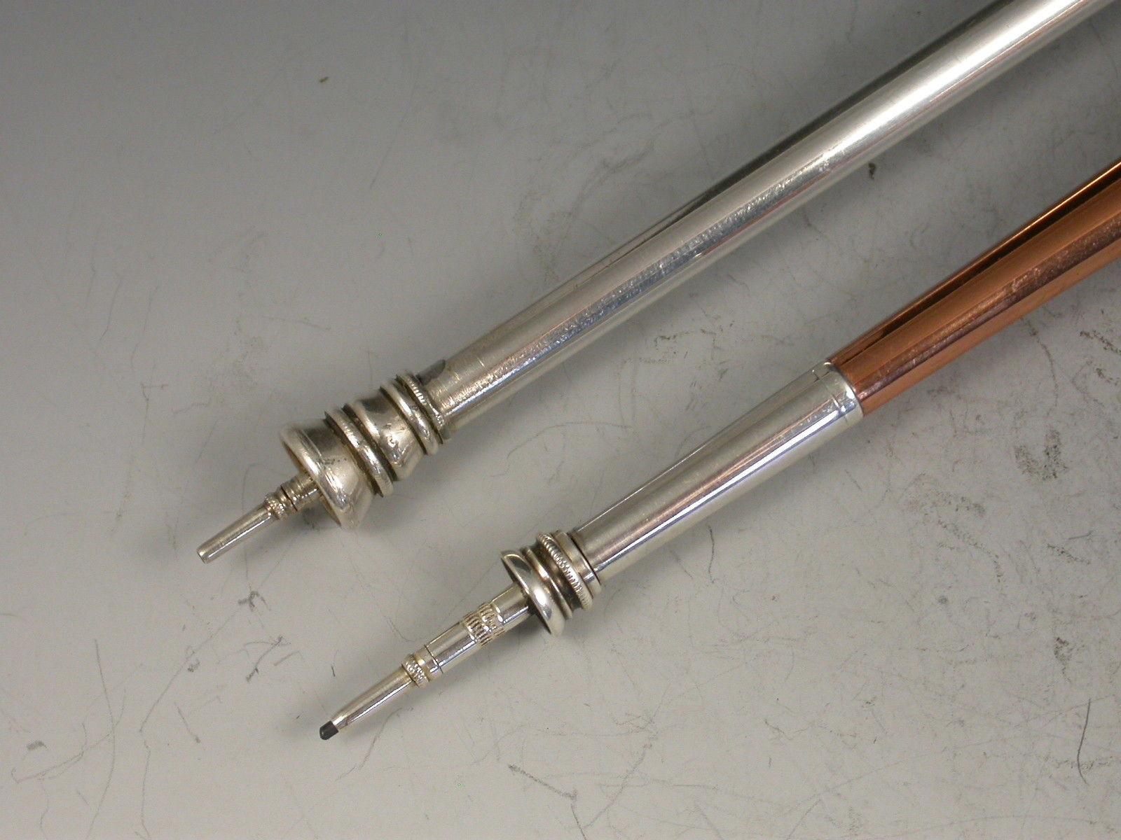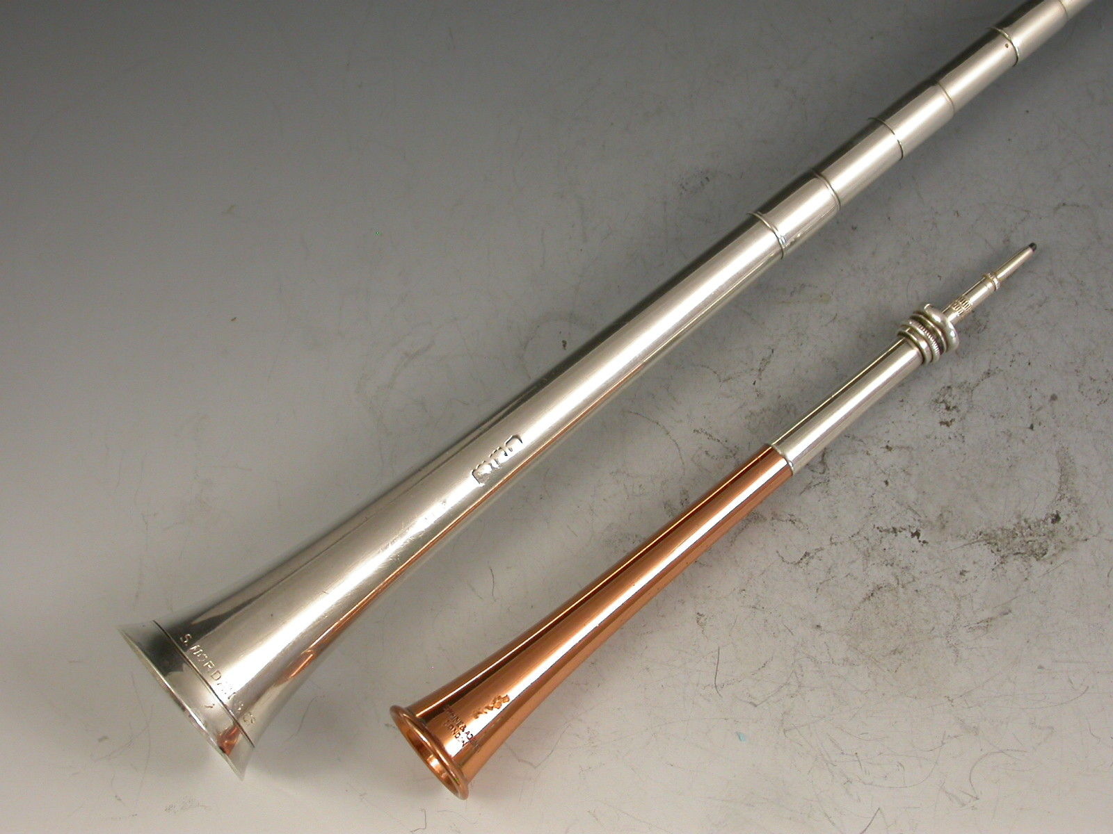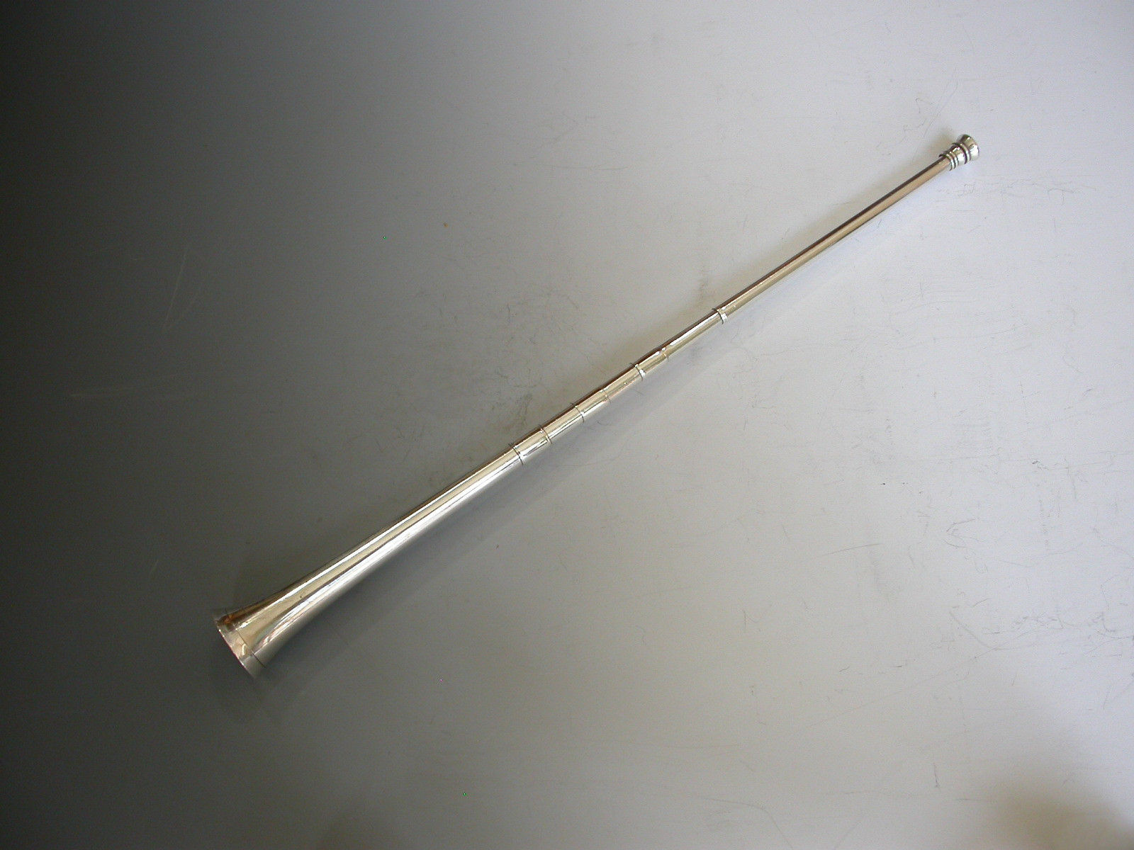 An extremely large (note standard size example in photos for comparison) Victorian novelty silver Propelling Pencil made in the form of a hunting horn, with three raised collars.