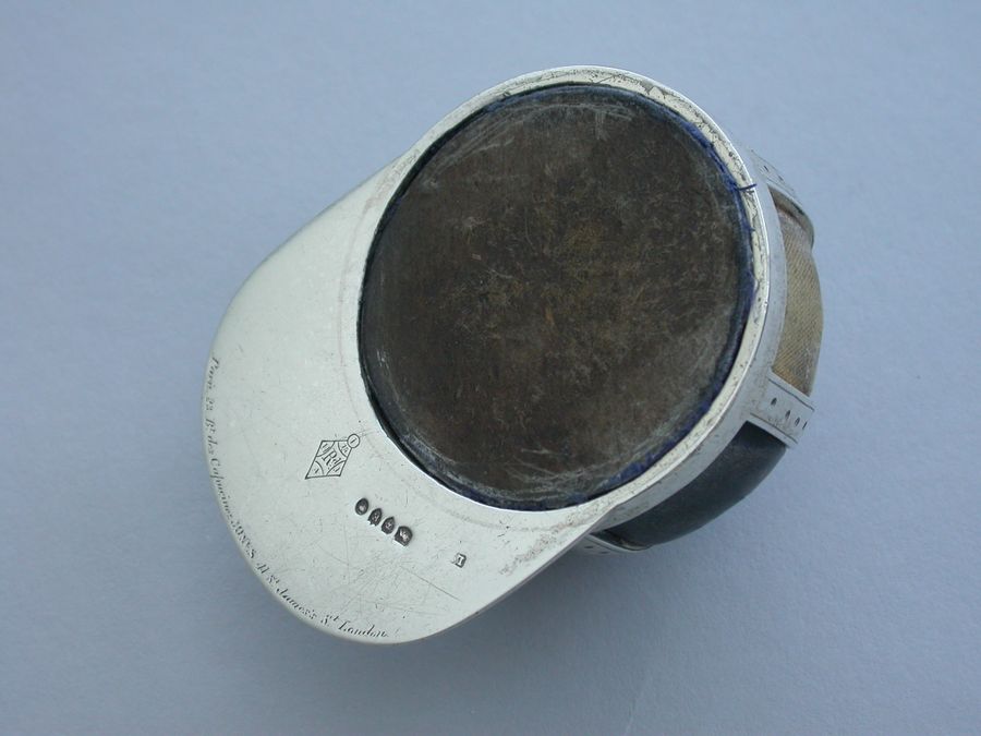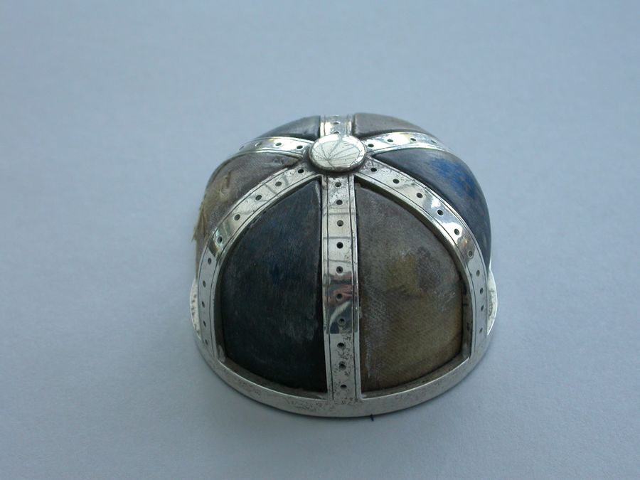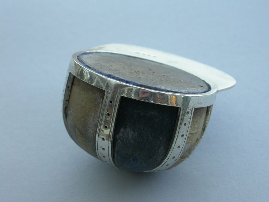 A large Victorian novelty silver Pin Cushion made in the form of a Jockey Cap with a plain silver peak. The cap divided into six sections by pierced straps, the six original velvet covered cushion sections alternating blue and white. Leather base.