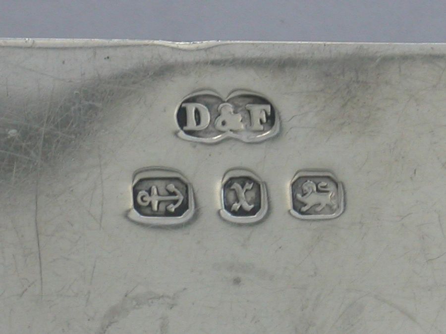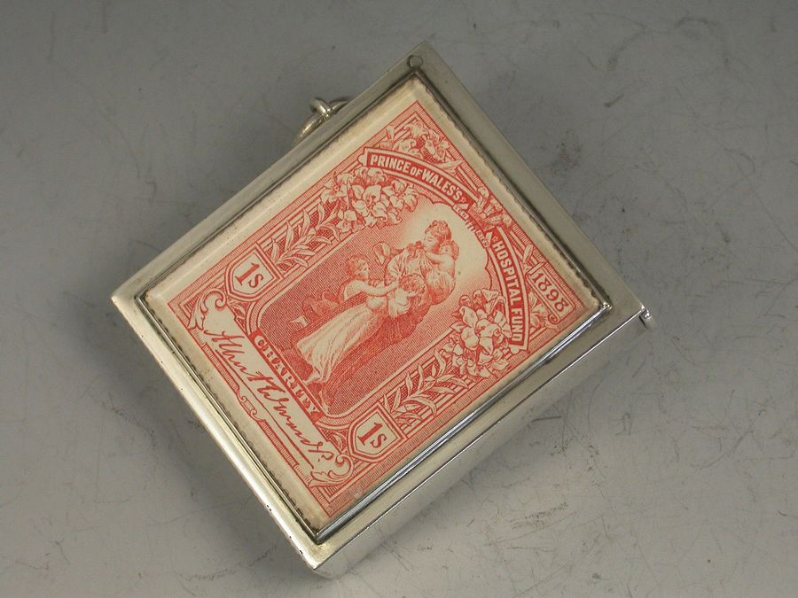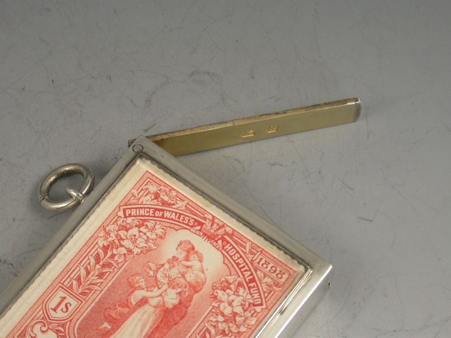 A fine and rare Victorian silver Vesta Case of large rectangular form with flat hinged lid and attached suspension ring. The face set with a glass panel covering a red one shilling charity stamp, silver gilt interior.